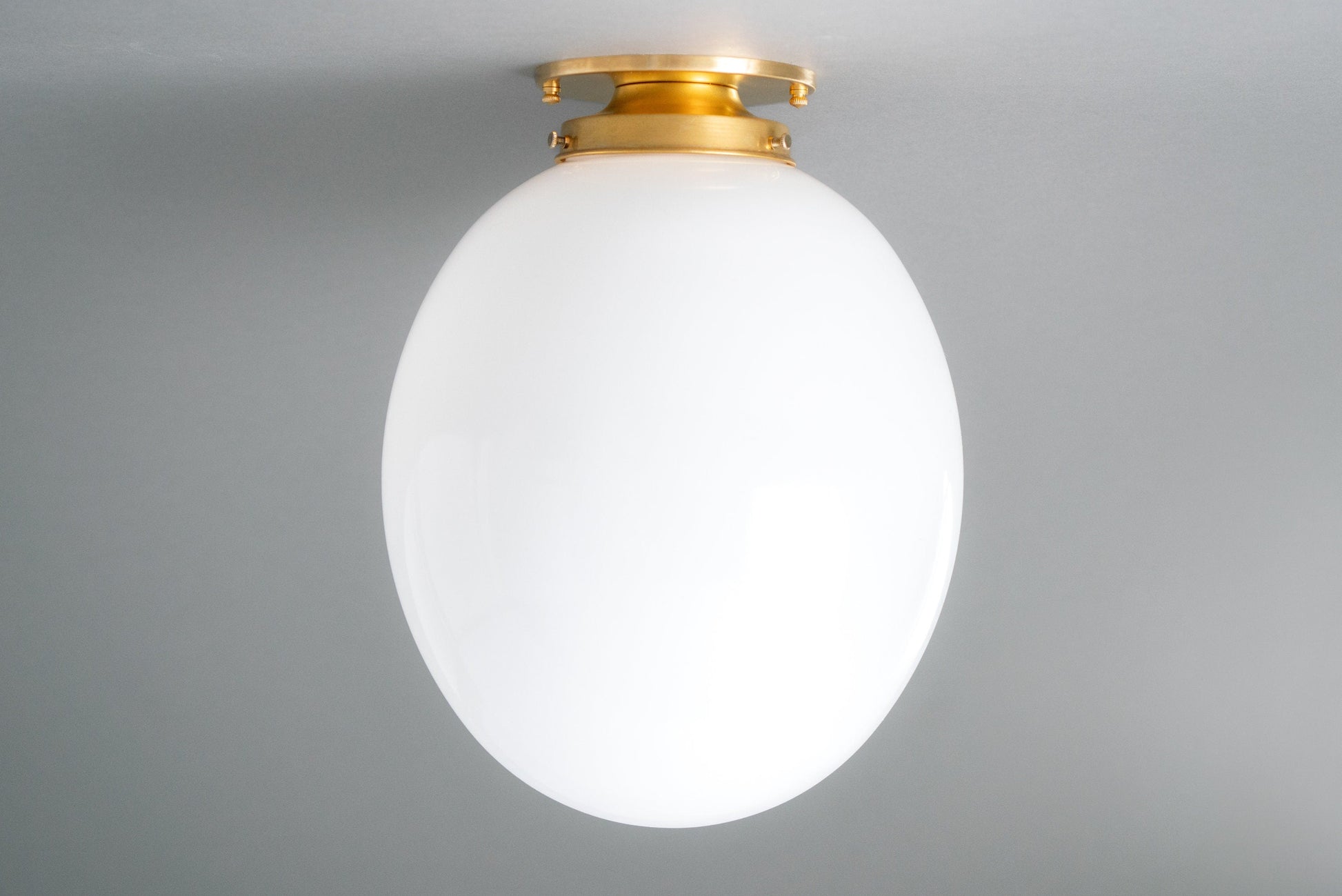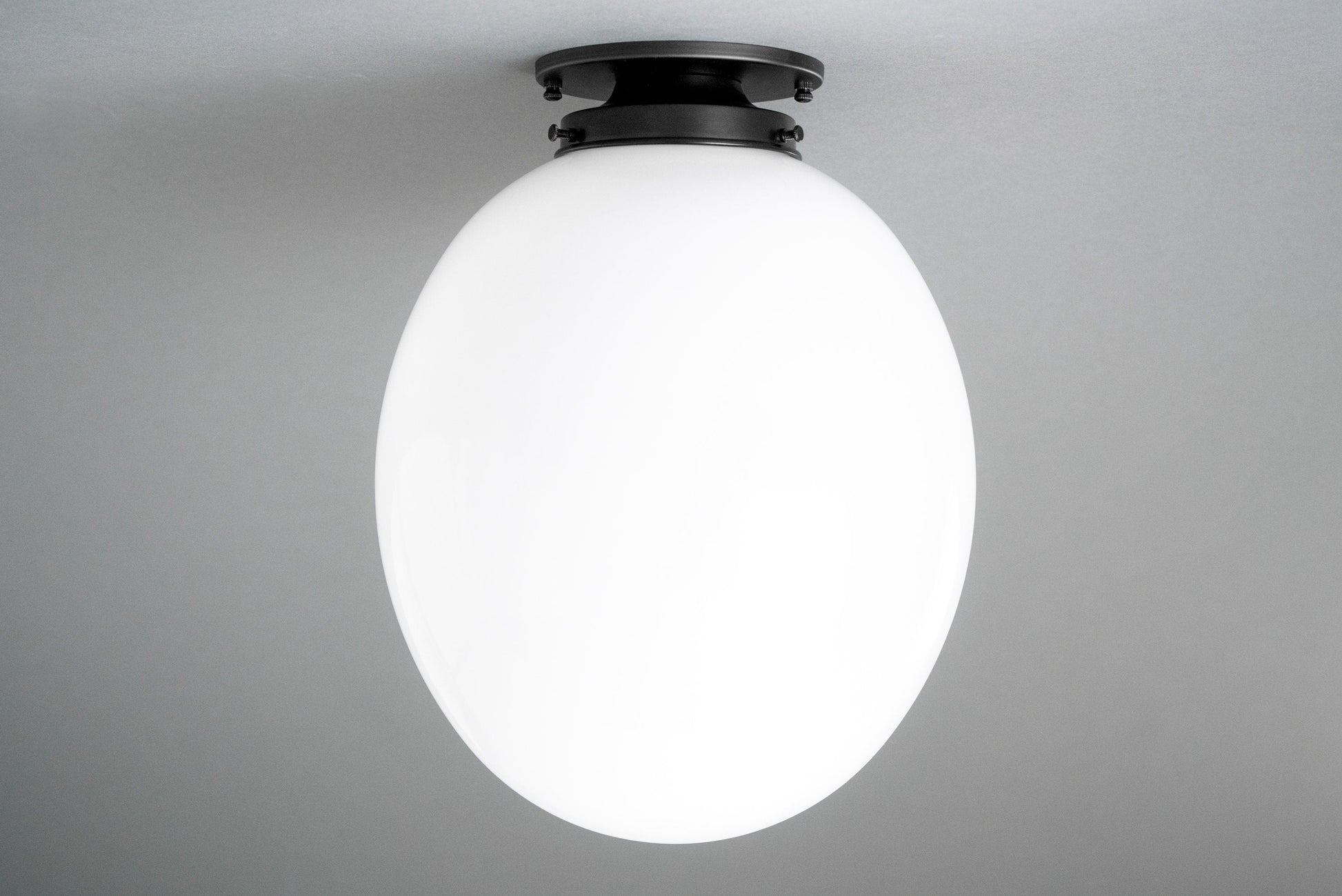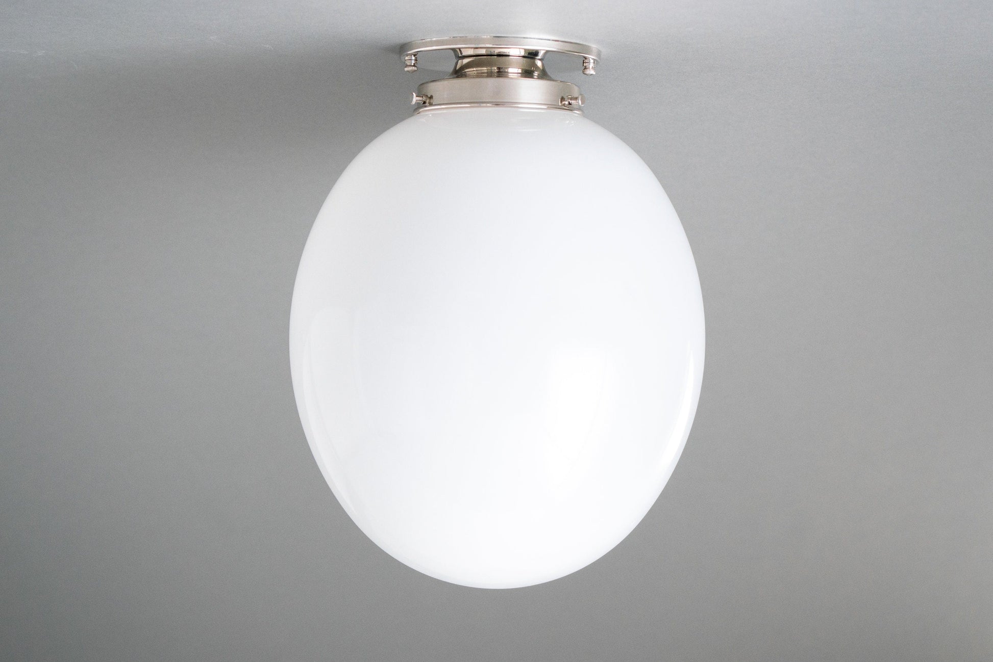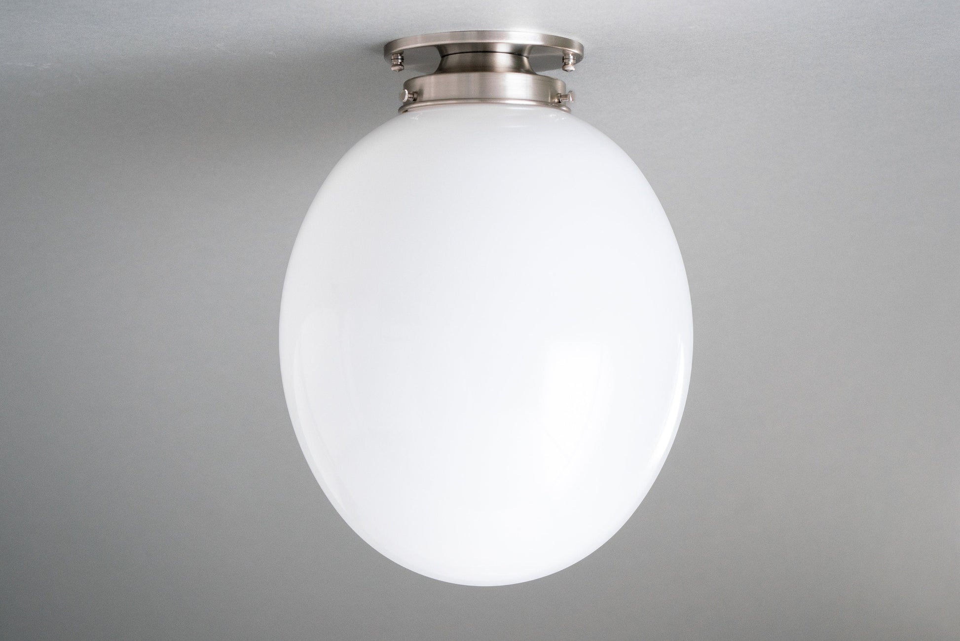 This Art Deco inspired flush ceiling light features a white acrylic elongated egg shaped globe. This high end acrylic mimics the look of glass without the weight or shatter risk.
