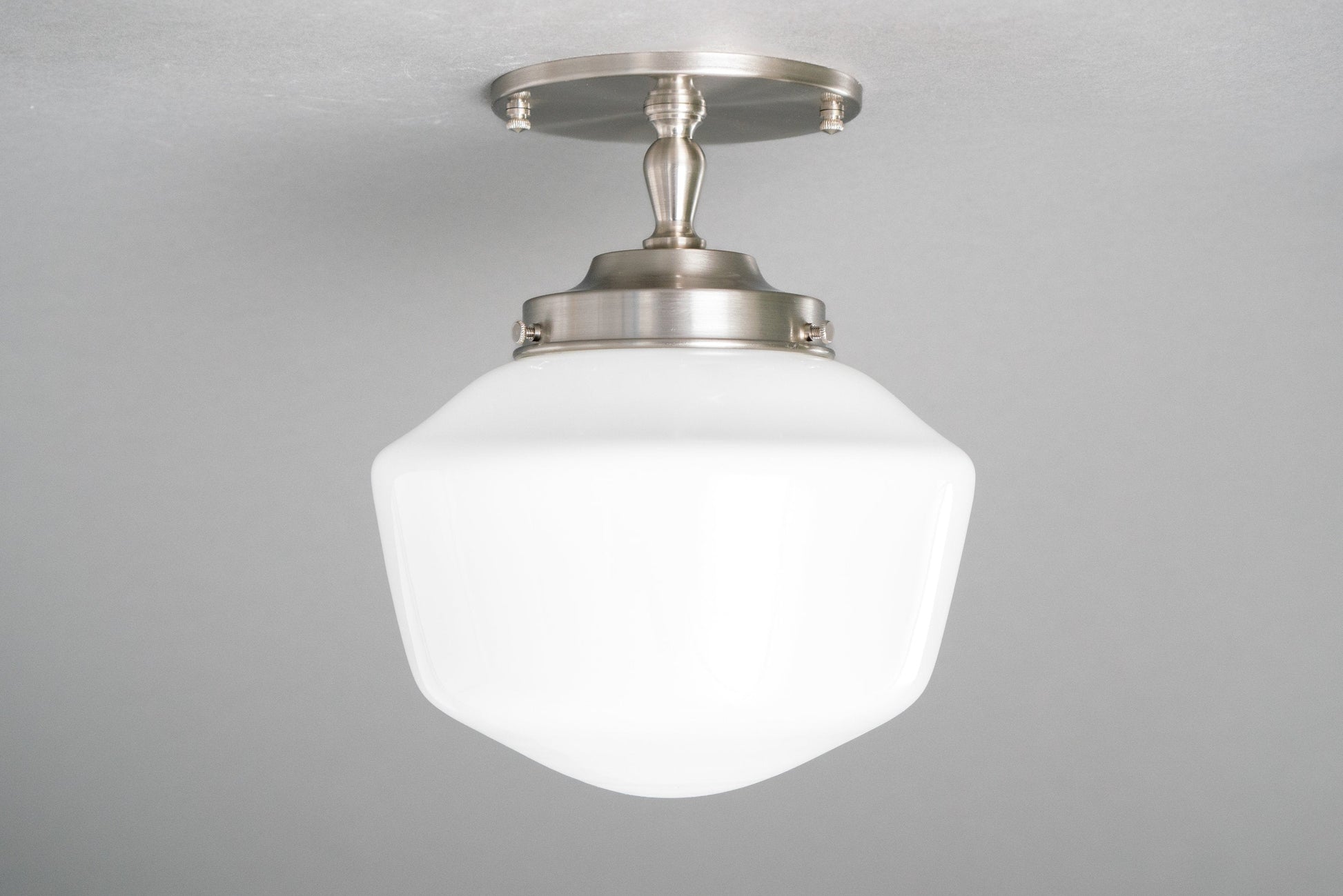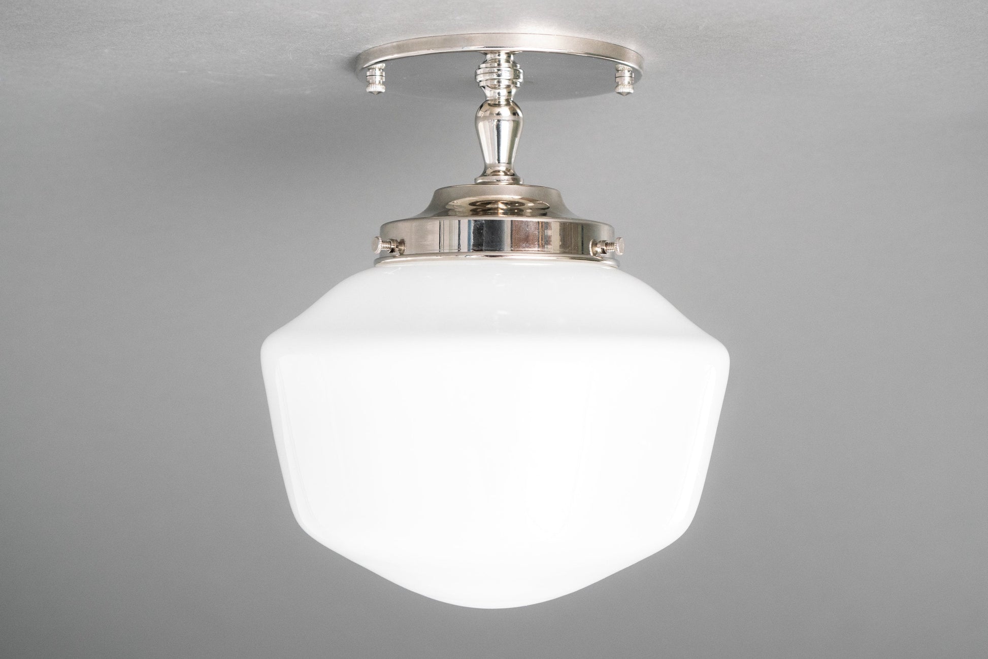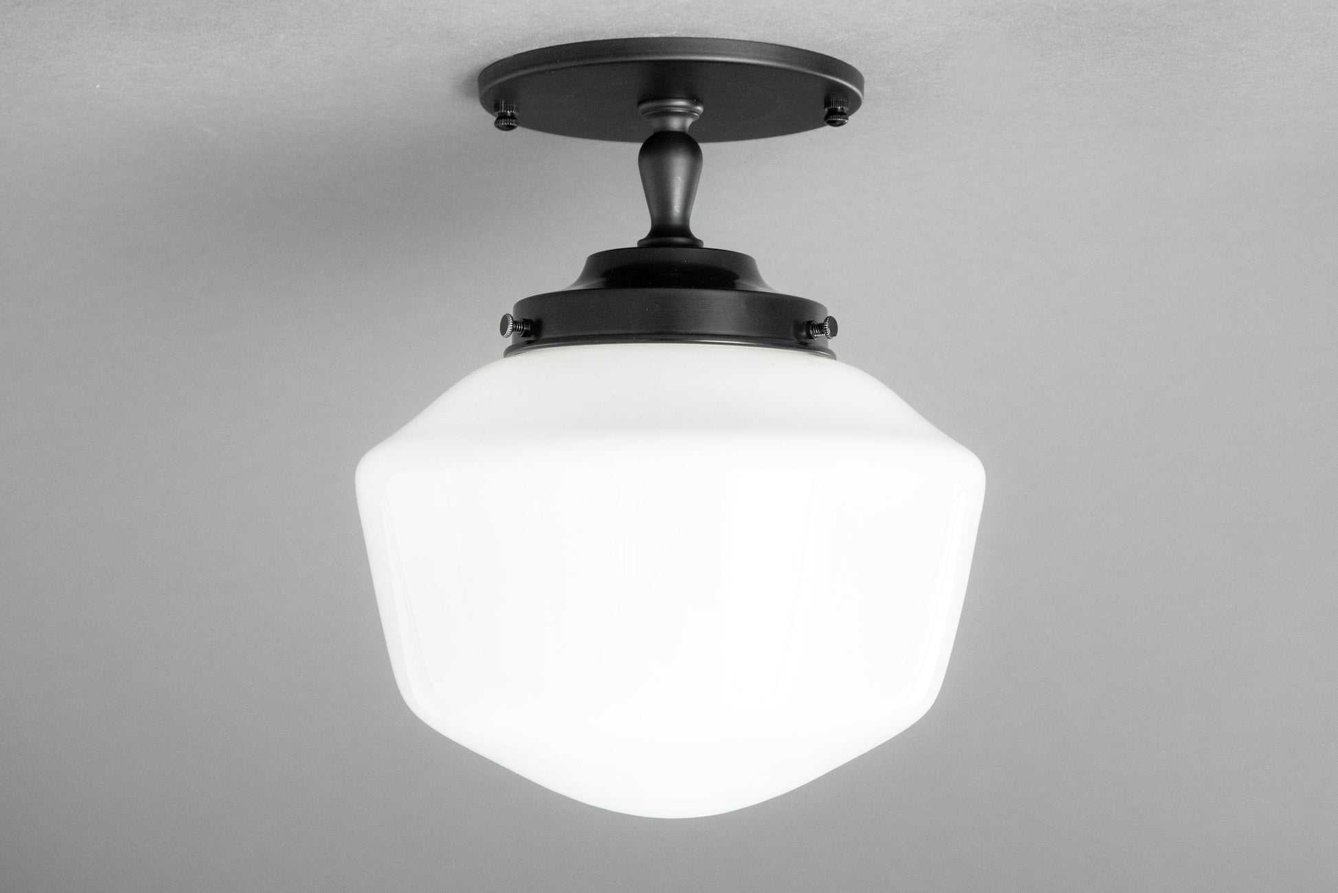 This Art Deco semi-flush ceiling light features a a thick white opal milk glass schoolhouse style globe. This 8.5inch globe was handblown using traditional glassblowing techniques in an American glass foundry.