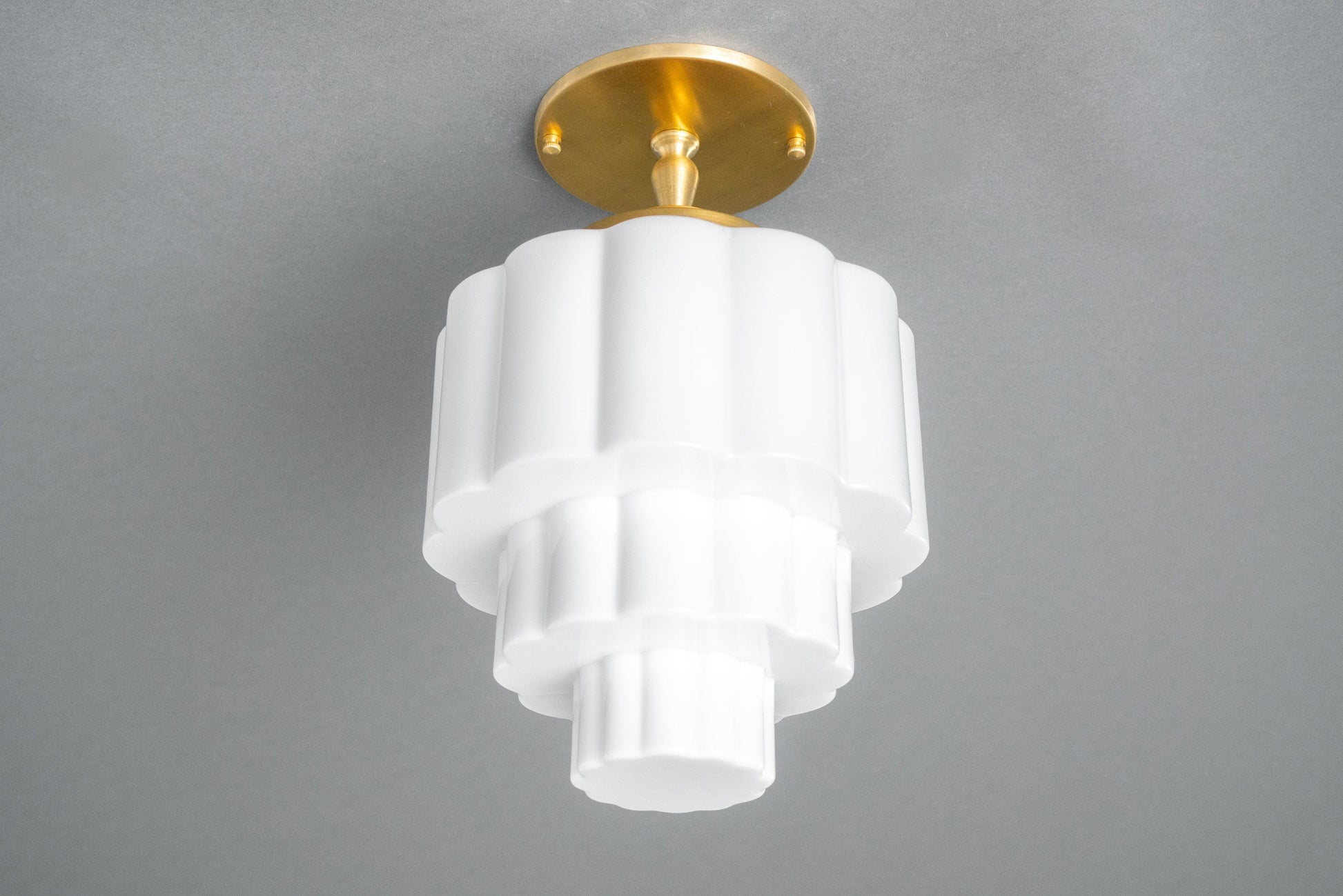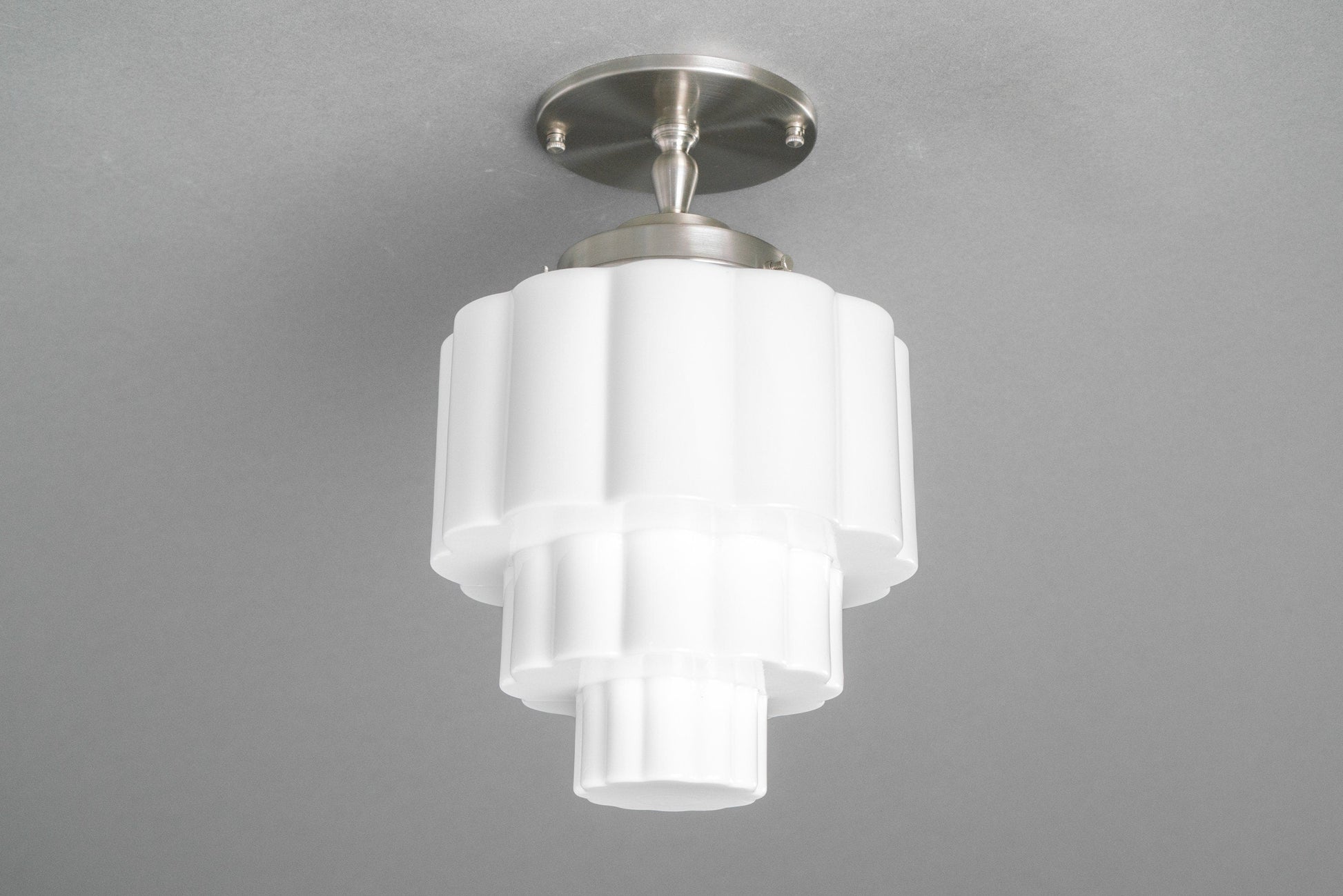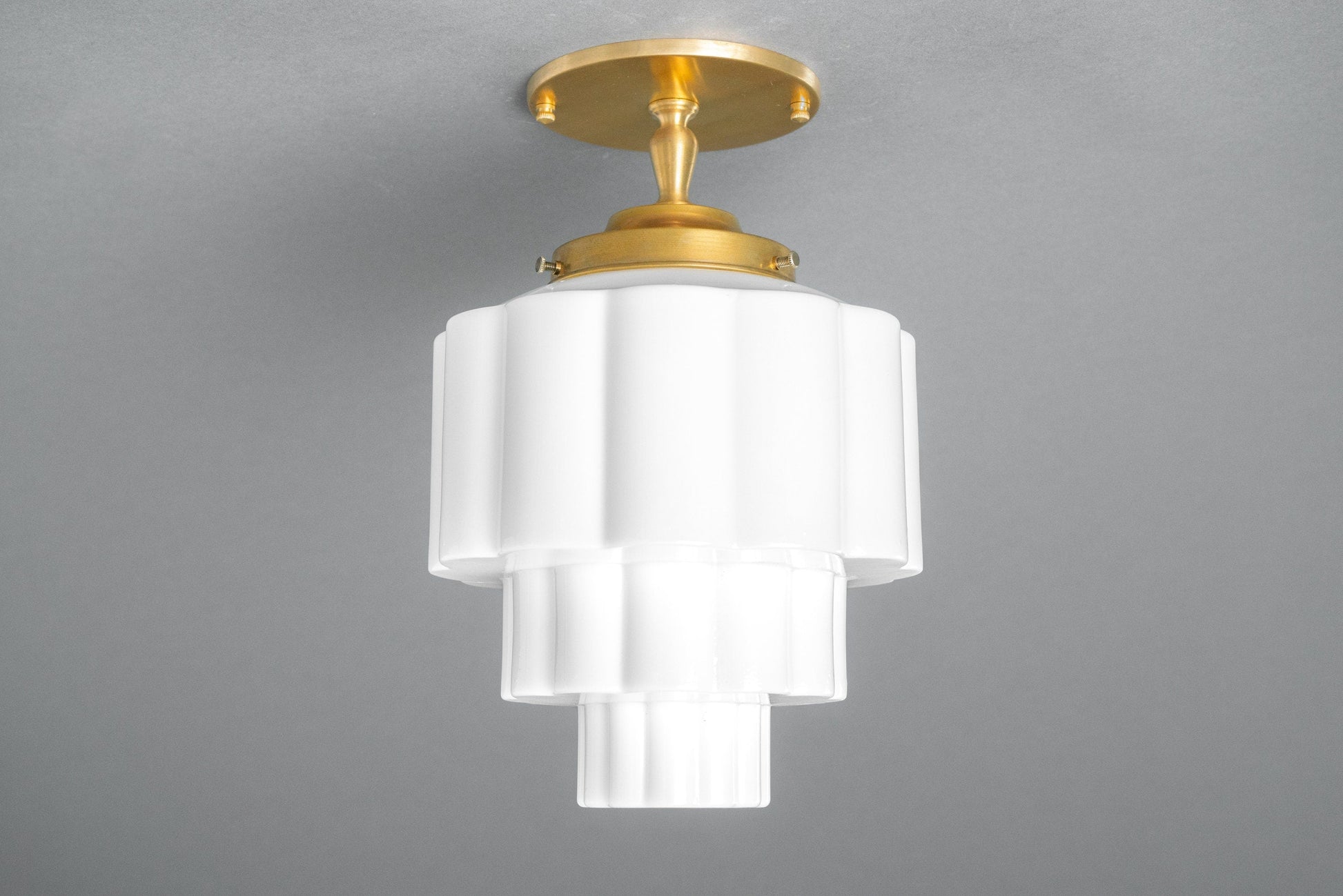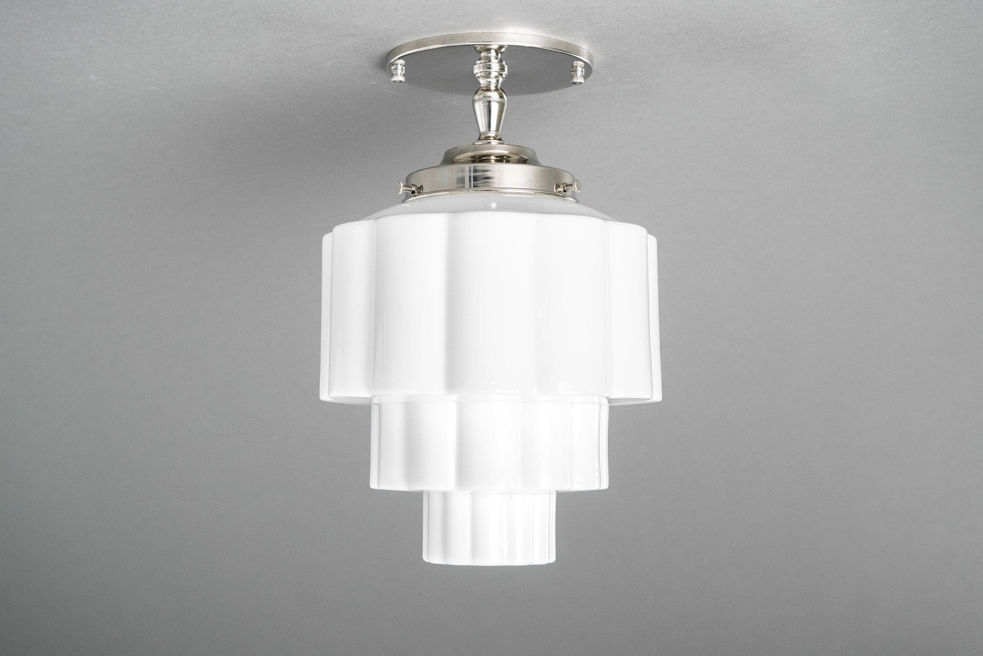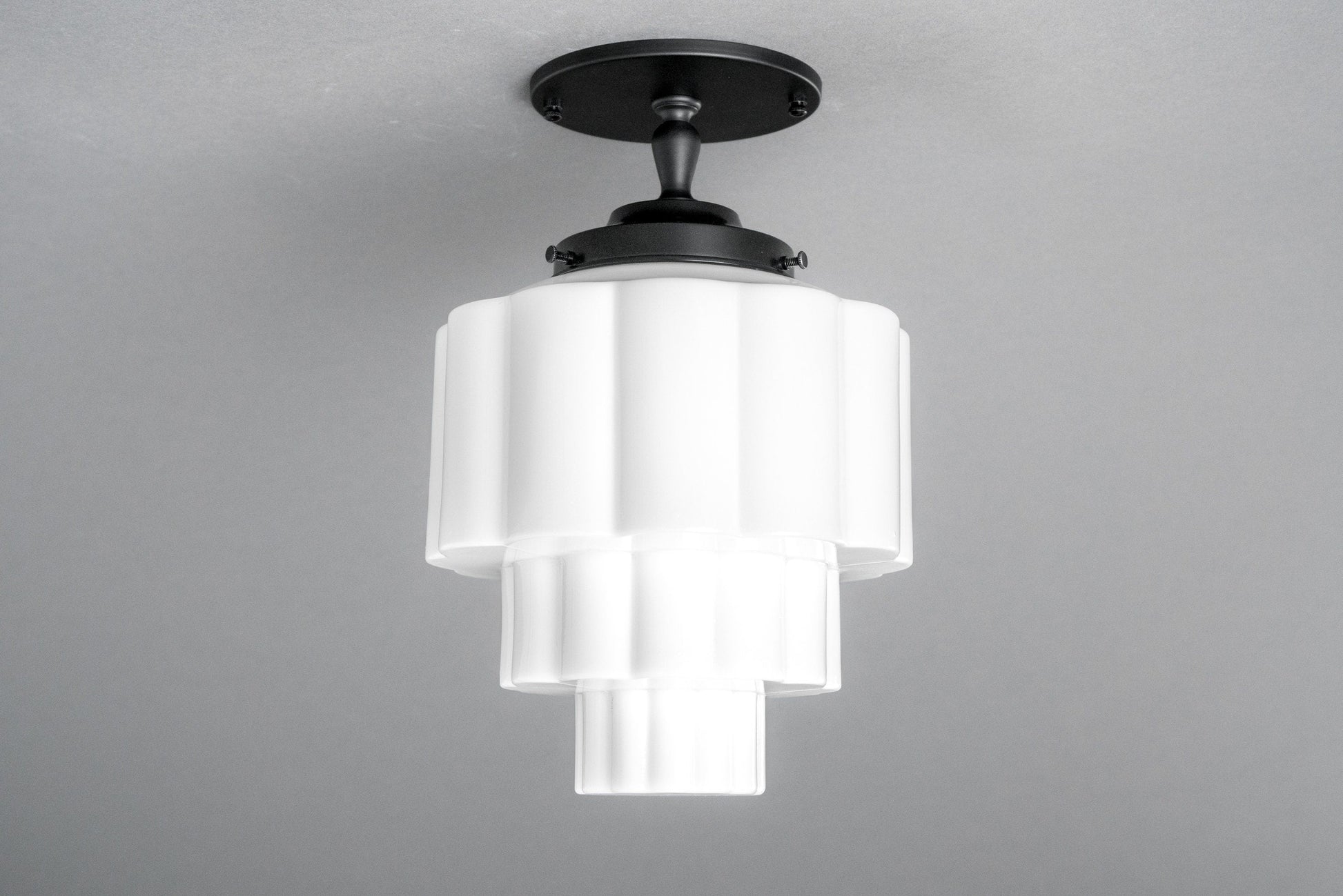 This Art Deco semi-flush ceiling light features a shallow canopy mounting plate and a ribbed wedding cake globe. This thick white glass globe was hand blown using traditional techniques in an American glass foundry.