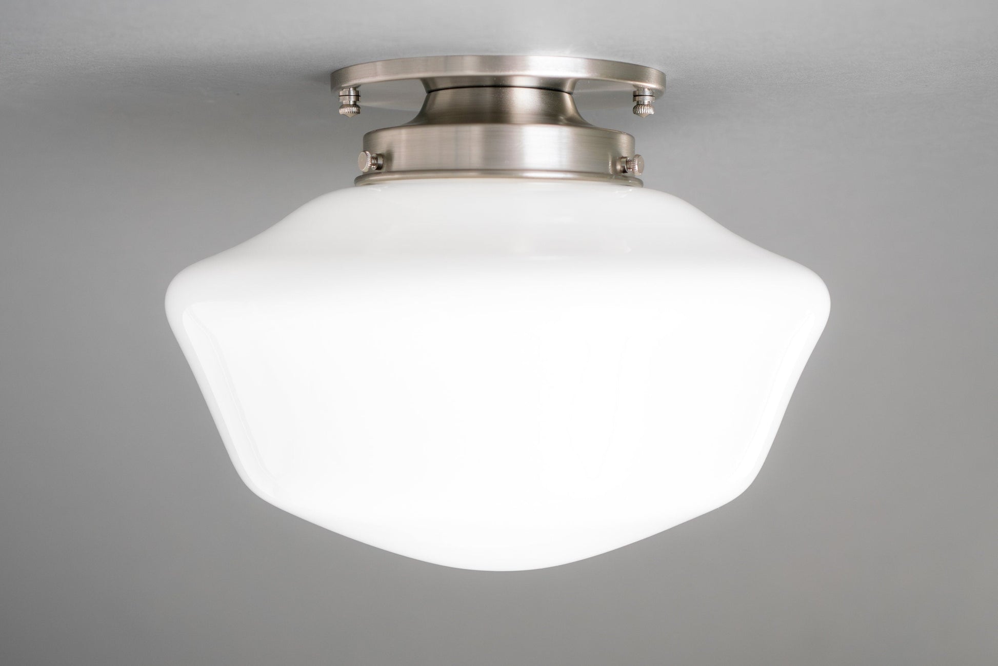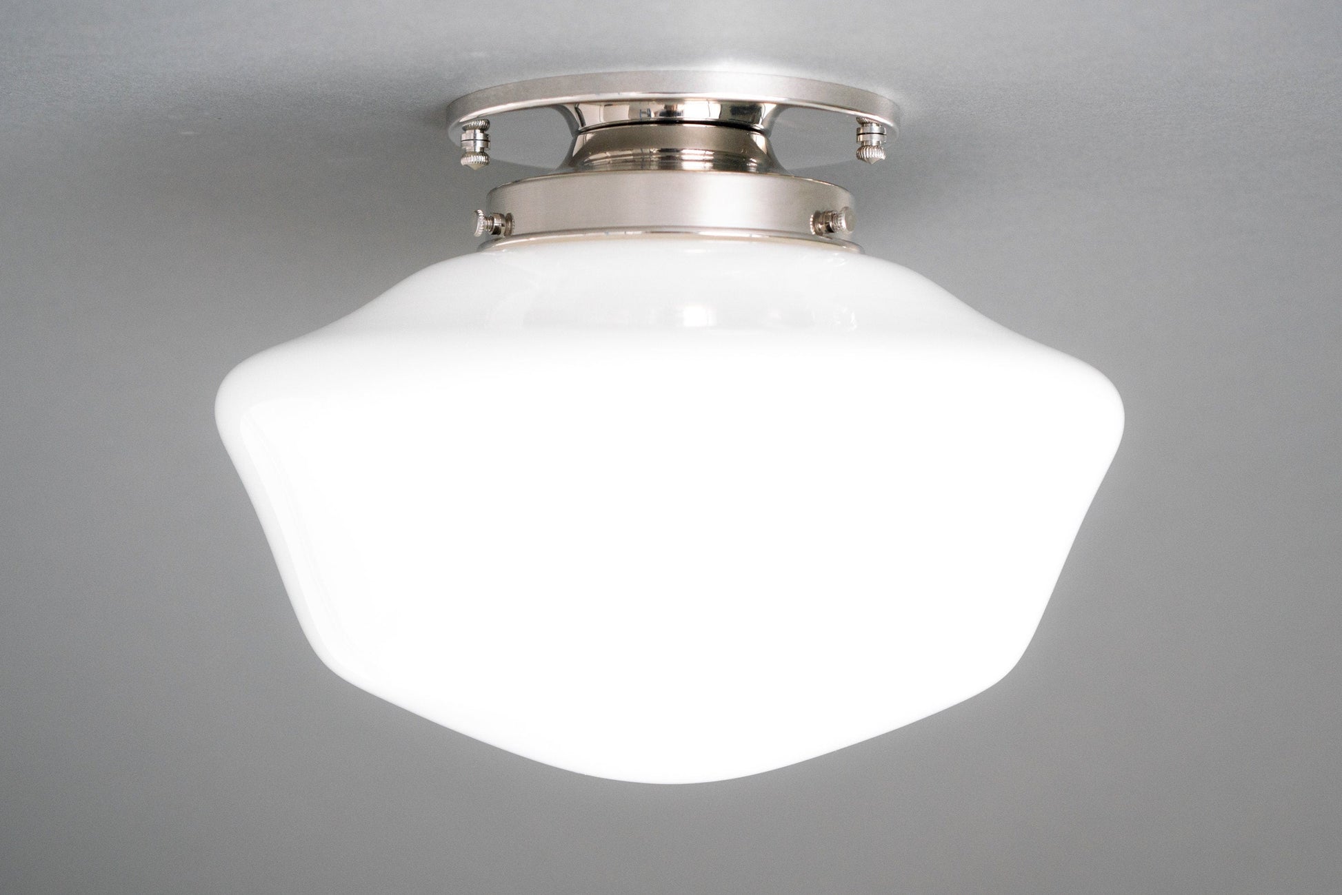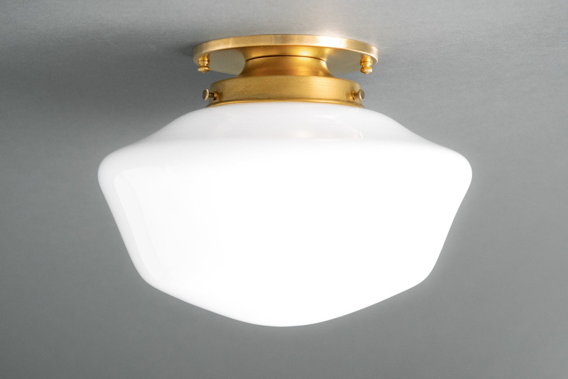 This Art Deco flush ceiling light features a 10inch wide Schoolhouse style thick white glass globe. This globe was hand blown in an American glass foundry using the original early 20th century antique glass mold.