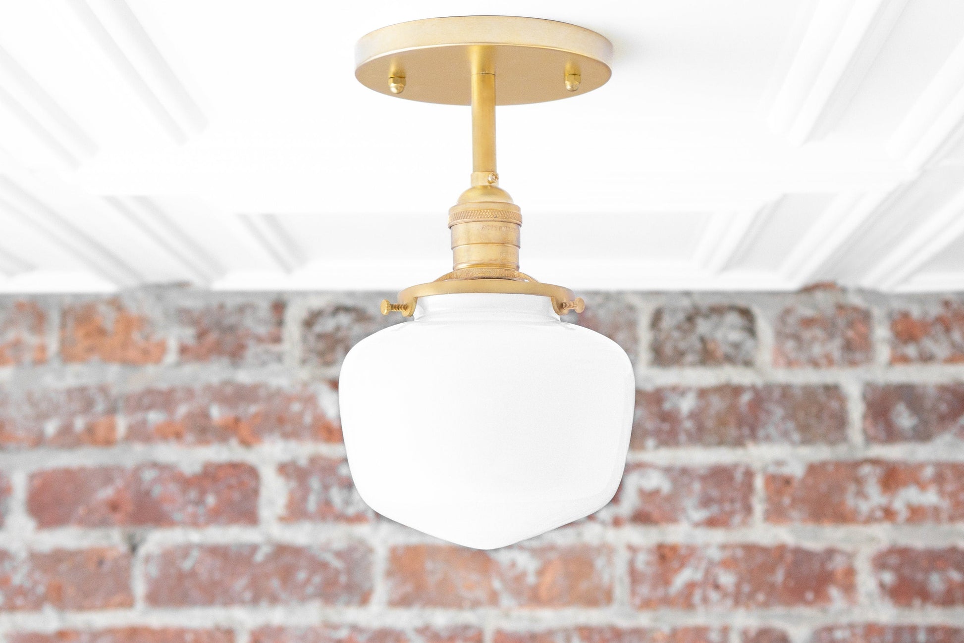 This modern fixture is semi-flush to the ceiling and features an opal 6" Schoolhouse Shade
