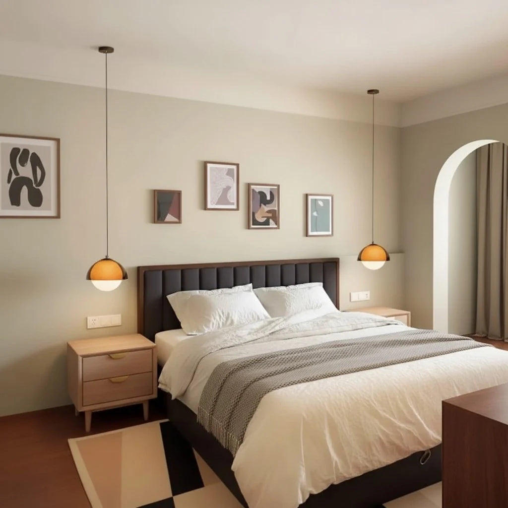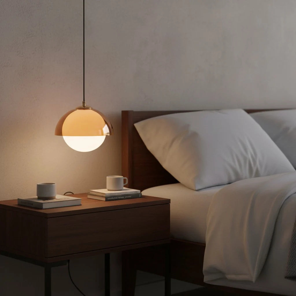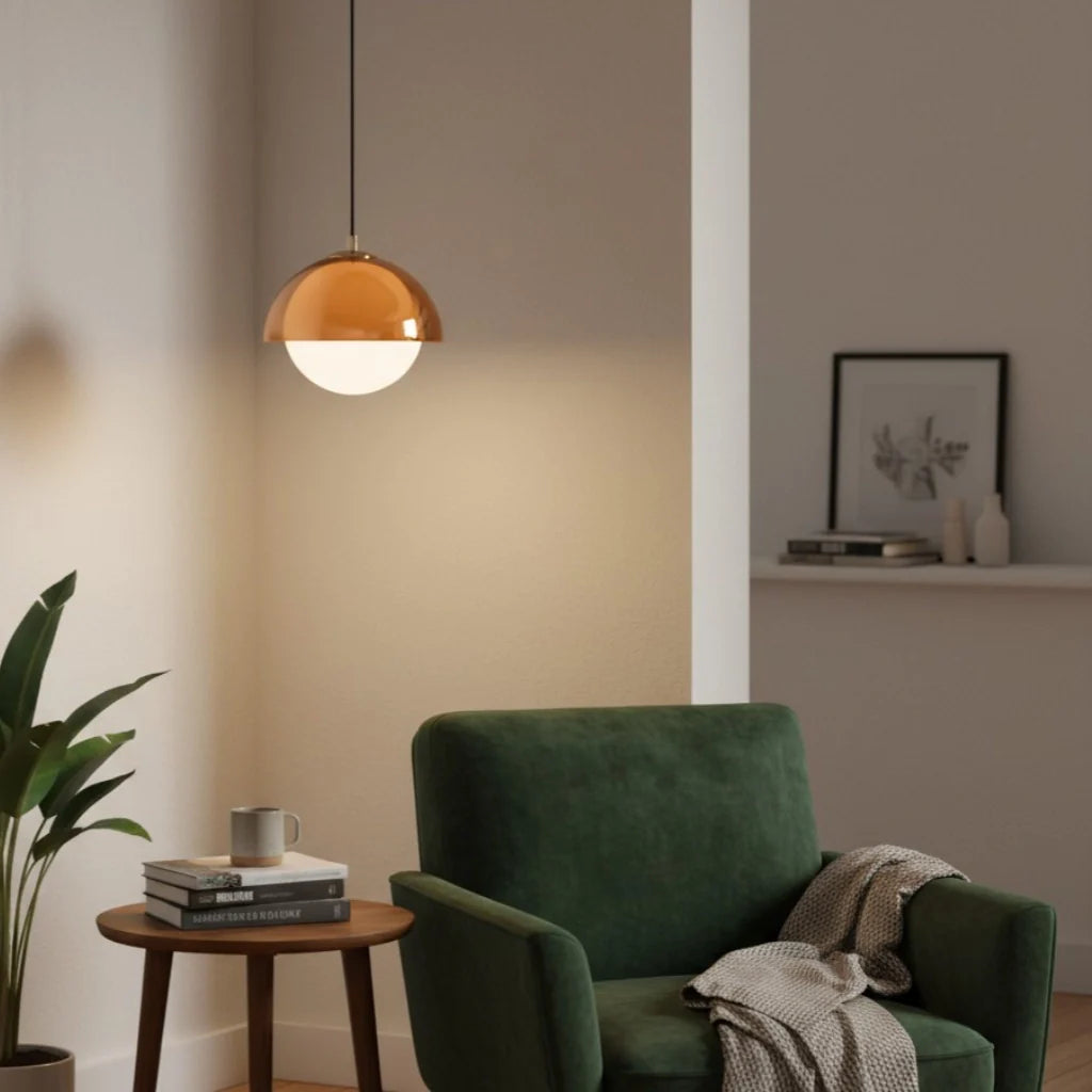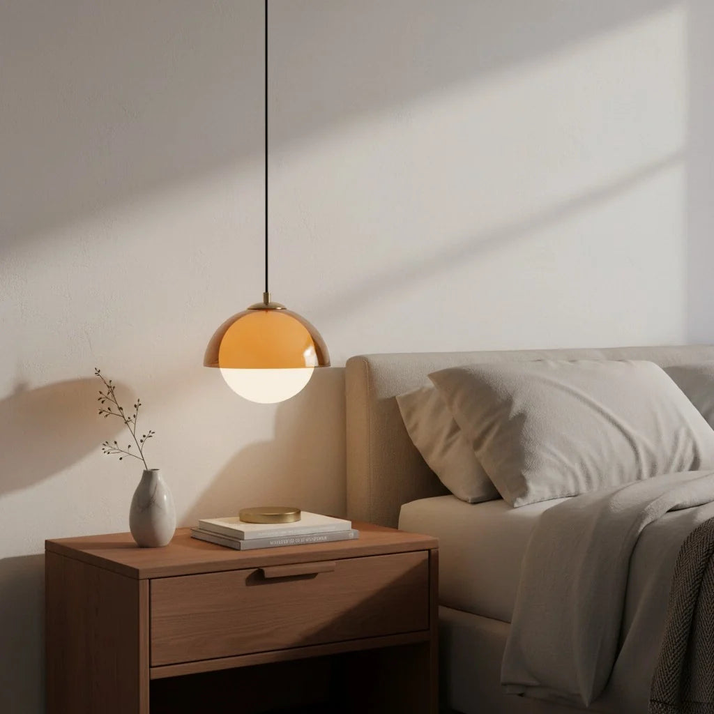 The pendant light pairs acrylic with a sleek metal top, casting warm light. Ideal for bedrooms, living areas or accent corners.