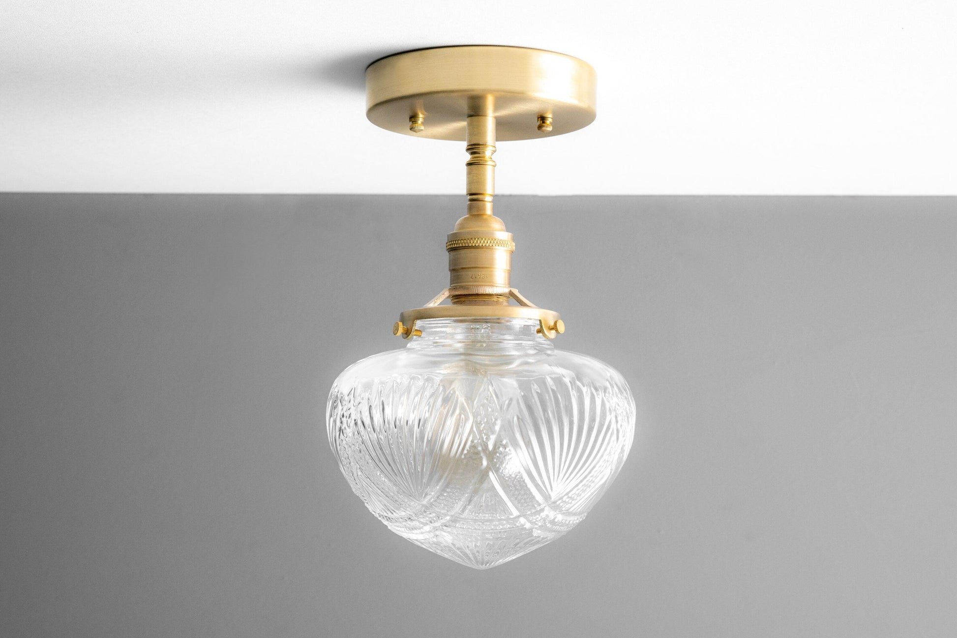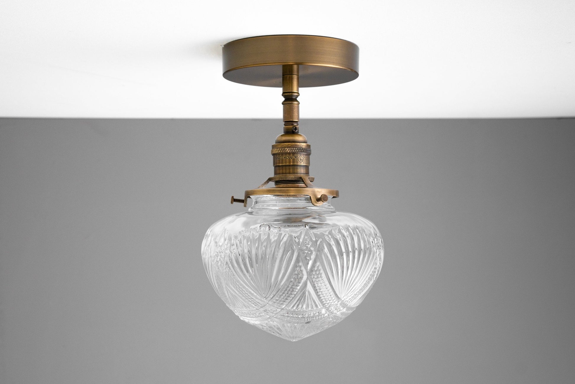 This semi-flush mount ceiling light features an ornate clear glass globe.