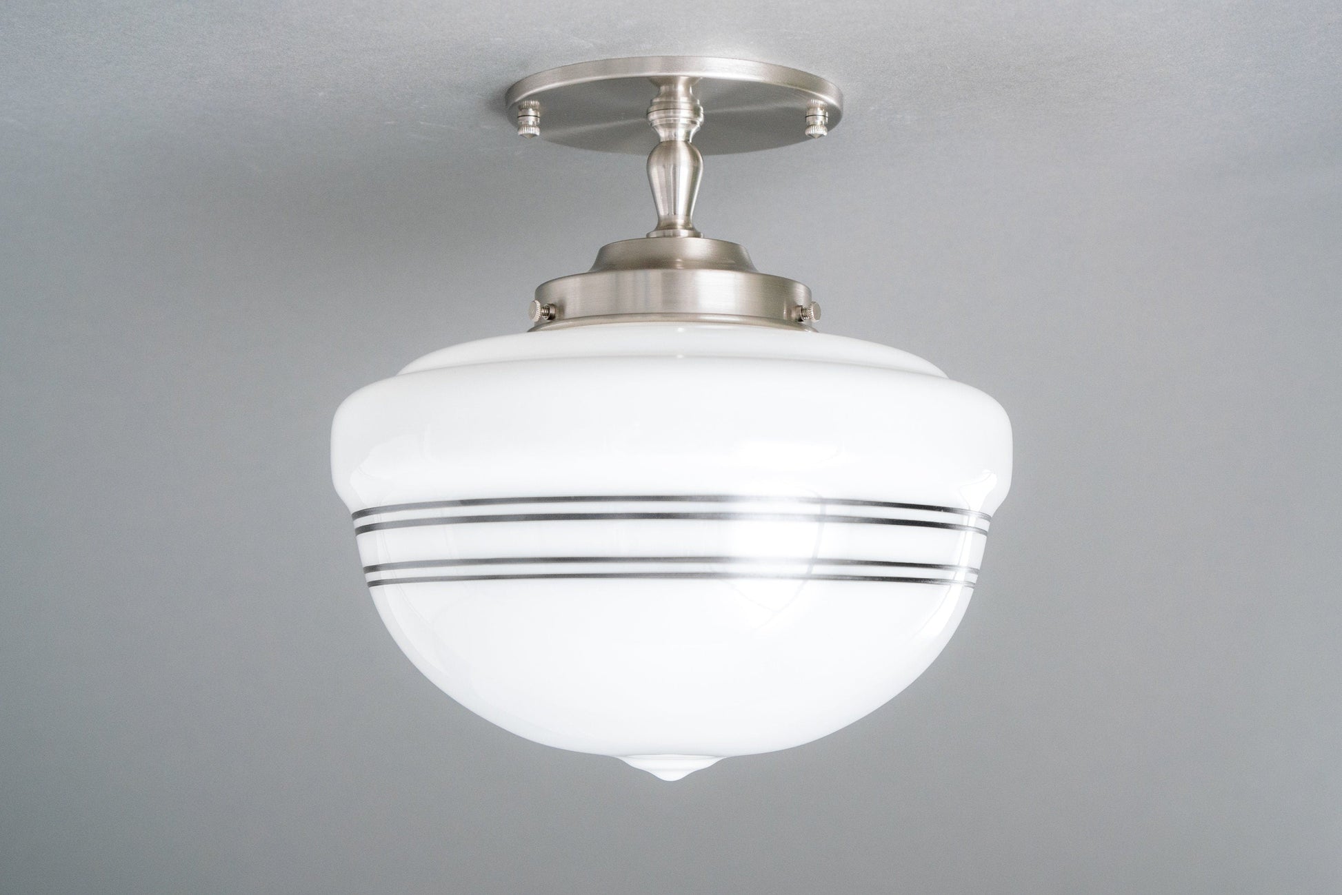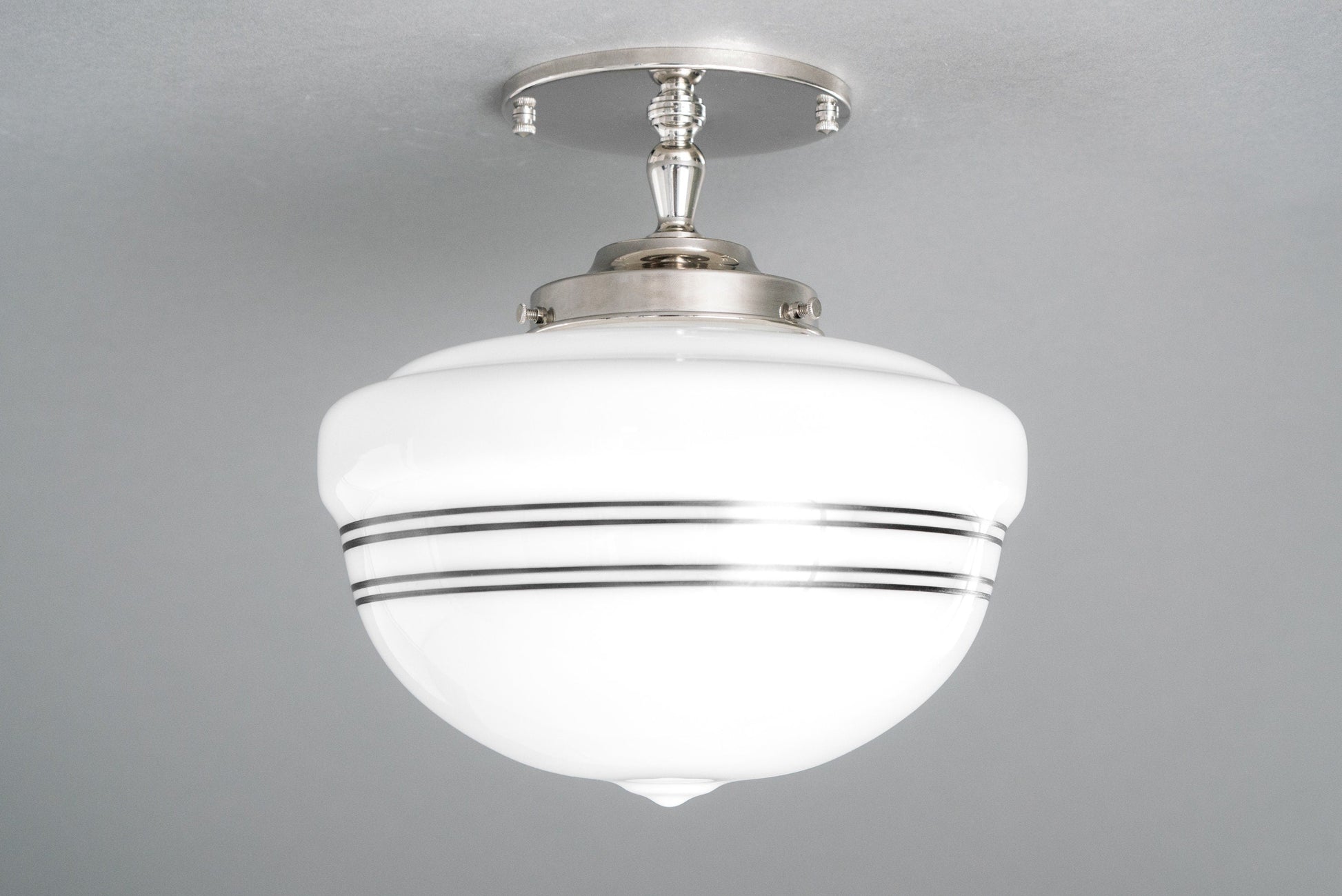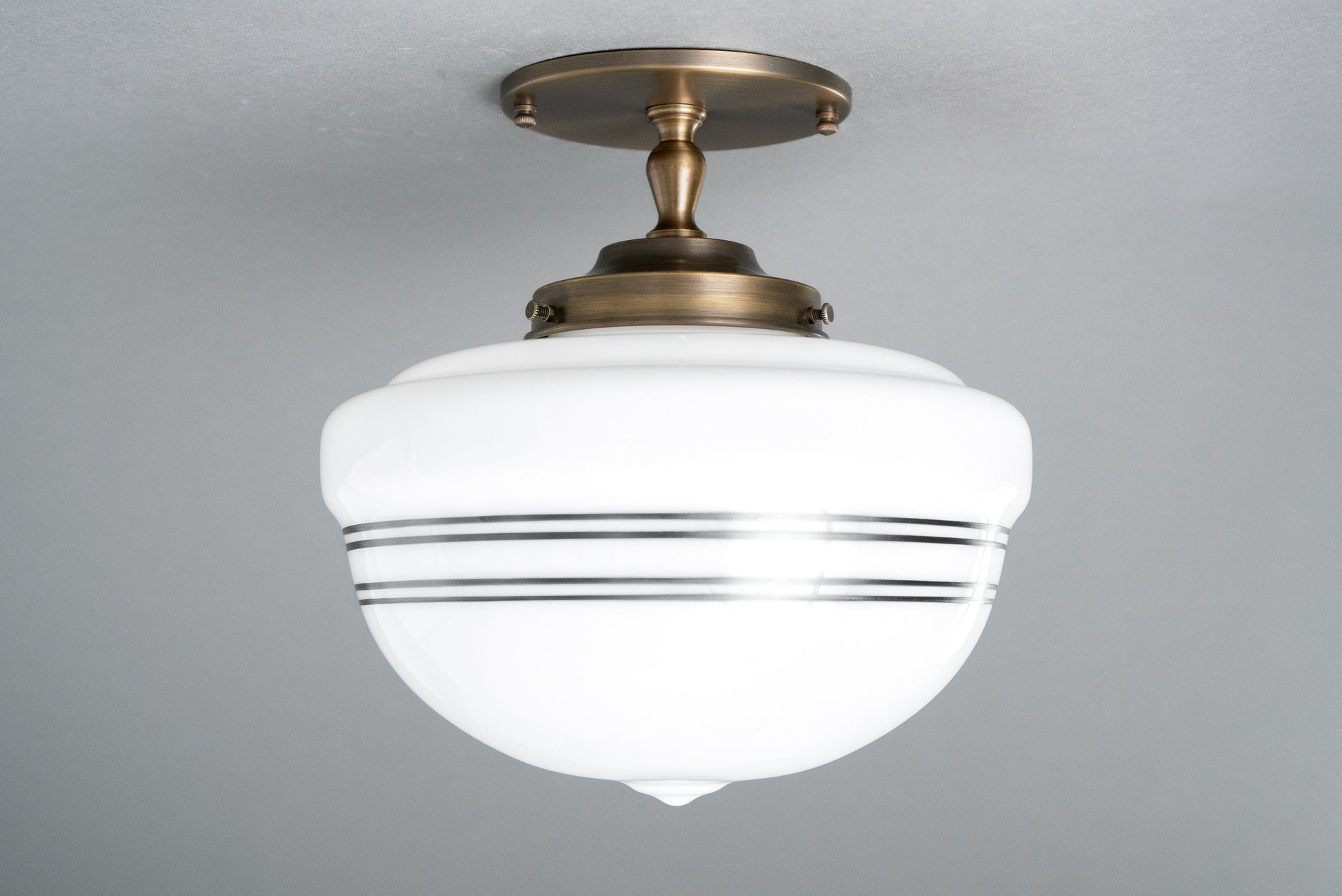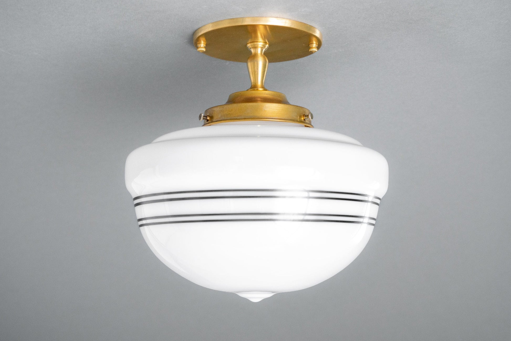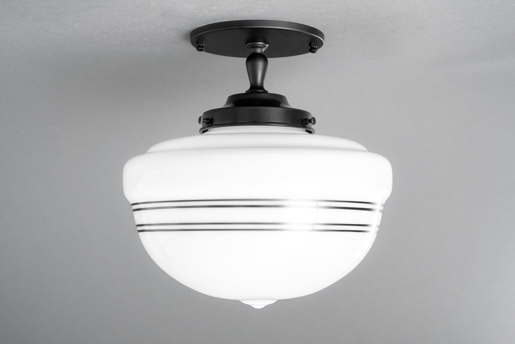 This Art Deco semi-flush ceiling light features an acorn shaped schoolhouse style 10inch globe. The globe is decorated with 4 thin black lines and was handblown and painted in an American glass foundry using traditional techniques.