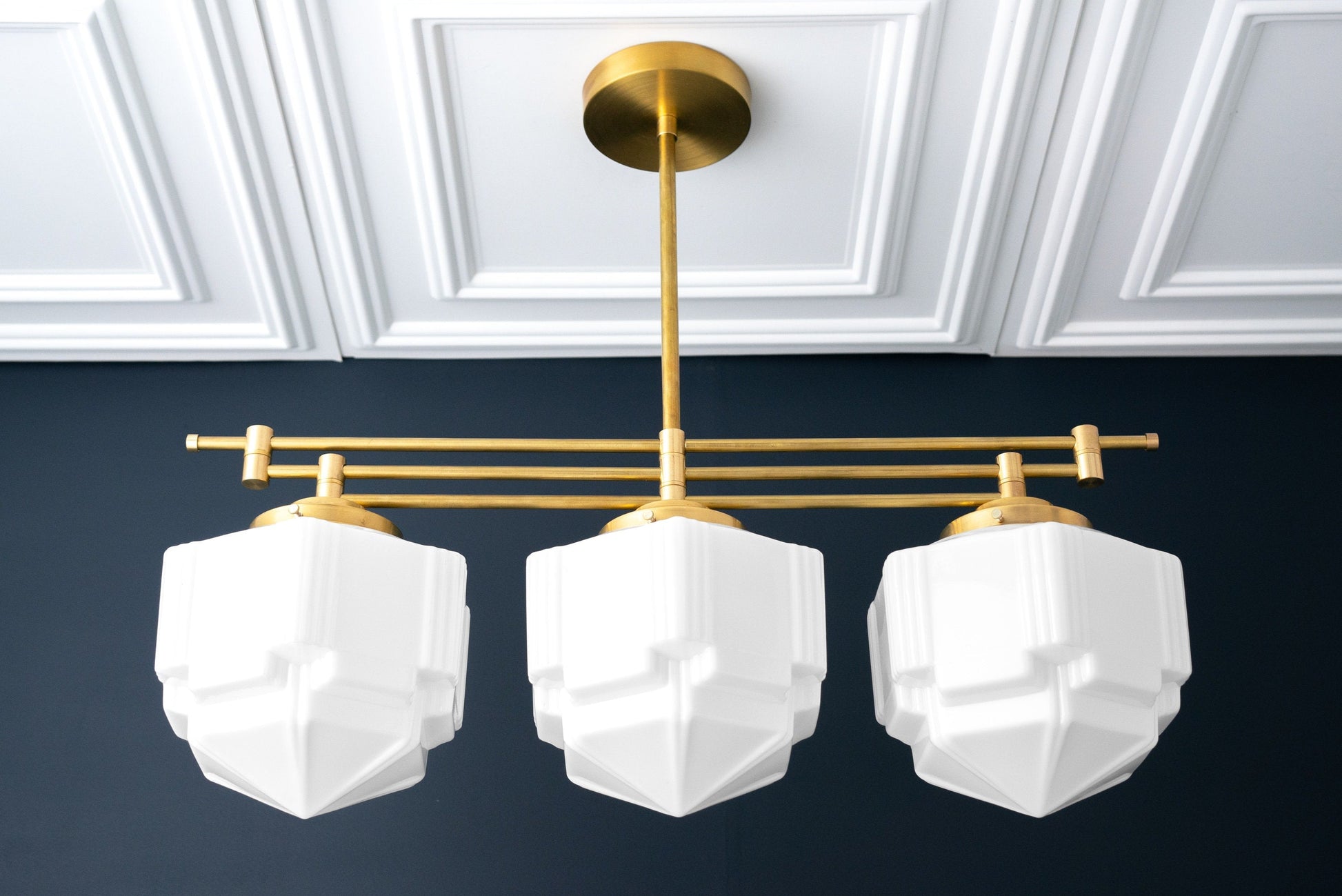 This classic deco 3 bulb chandelier features unique mid-century globes.