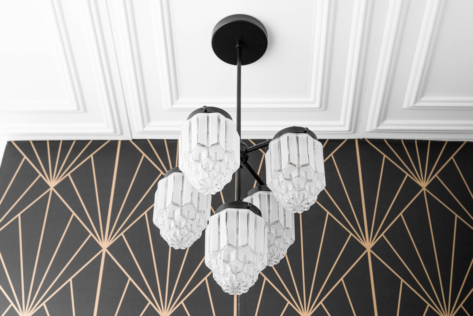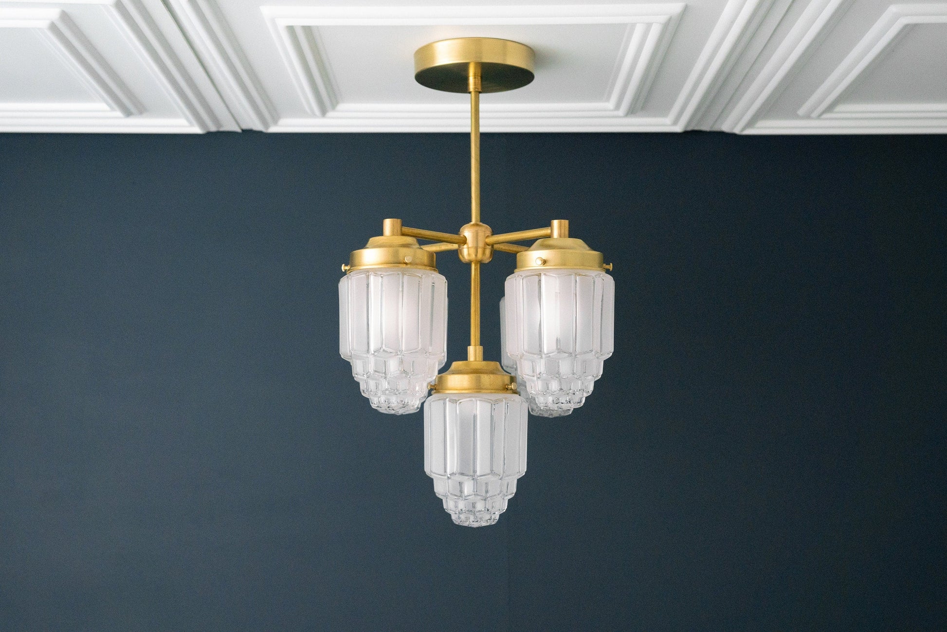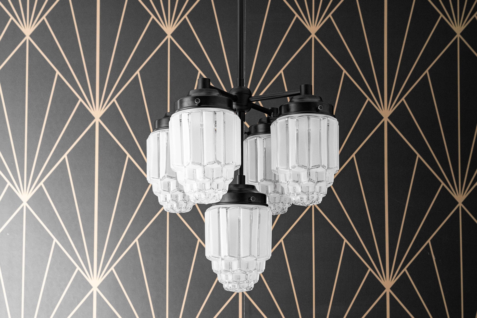 This art deco classic 5 bulb chandelier features clear skyscraper shades with frosted details.