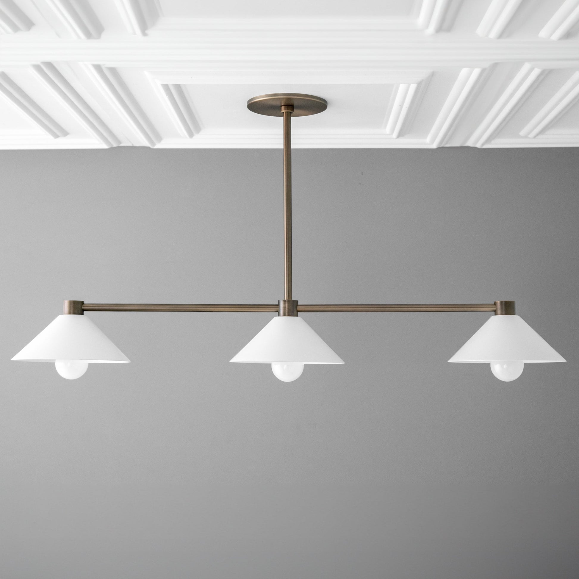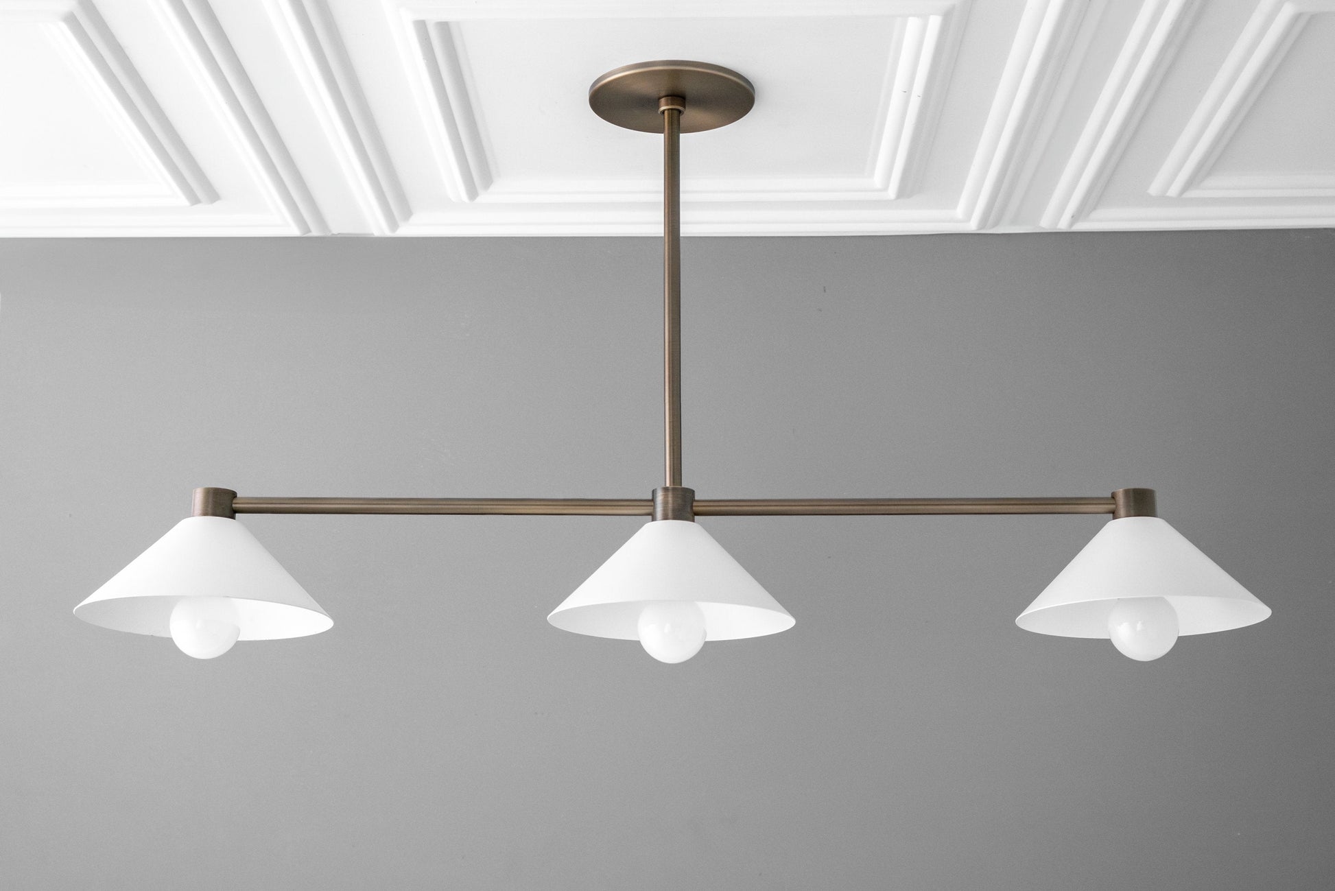 This in-line chandelier features your choice of finish on the drop and supporting arms with cone shades.
