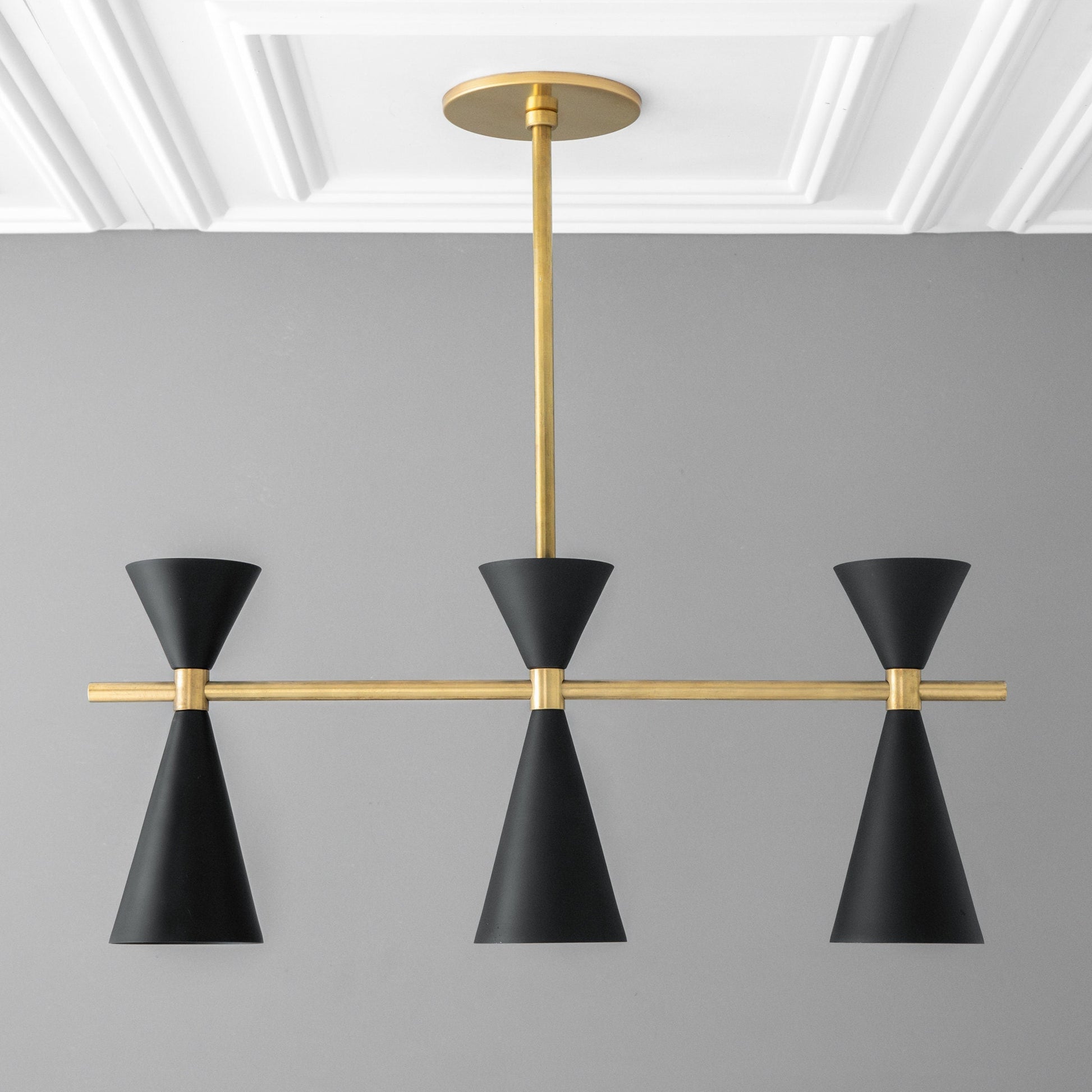 This in-line chandelier features your choice of finish on the drop and supporting arms with cone shades.