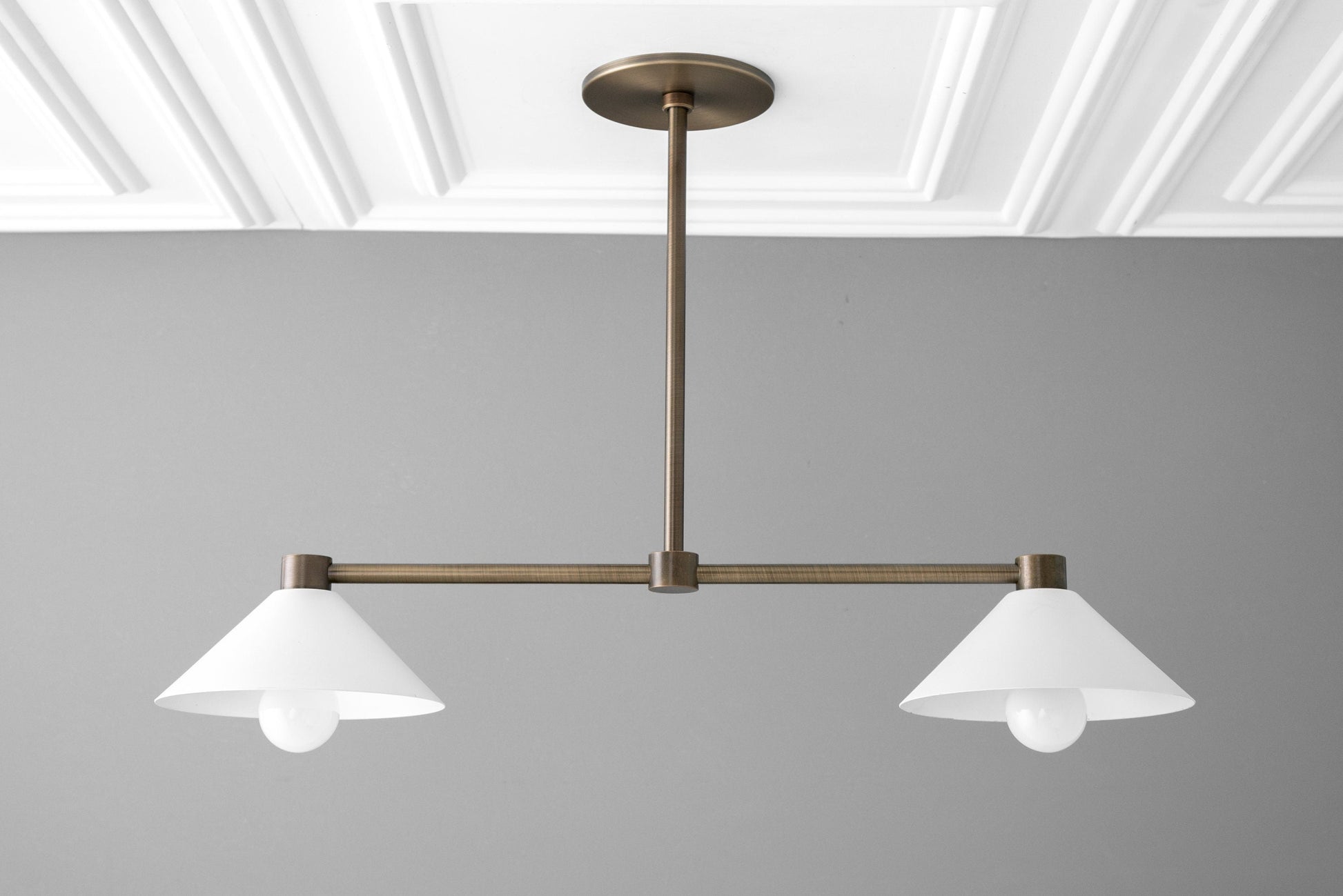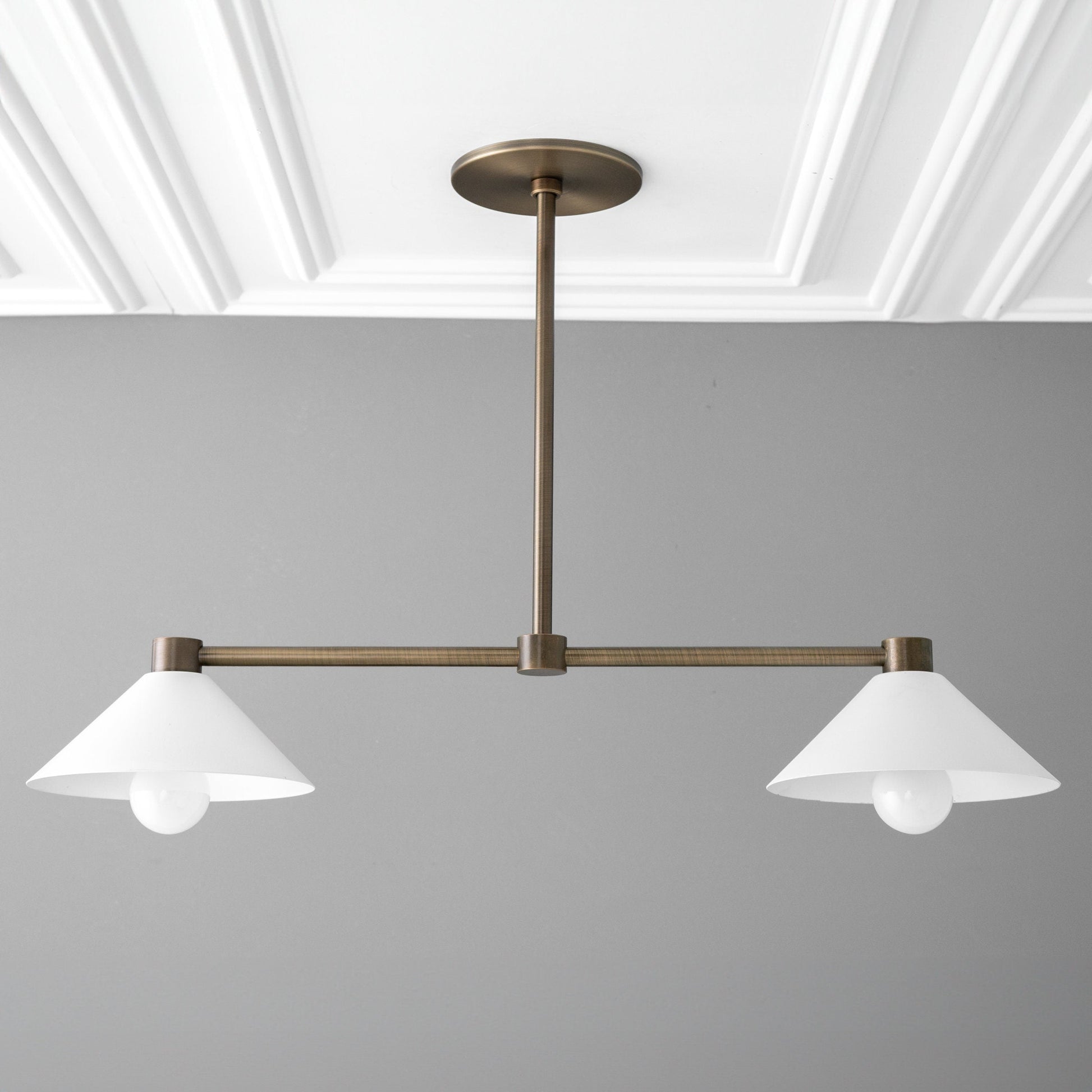 This in-line chandelier features your choice of finish on the drop and supporting arms with cone shades.