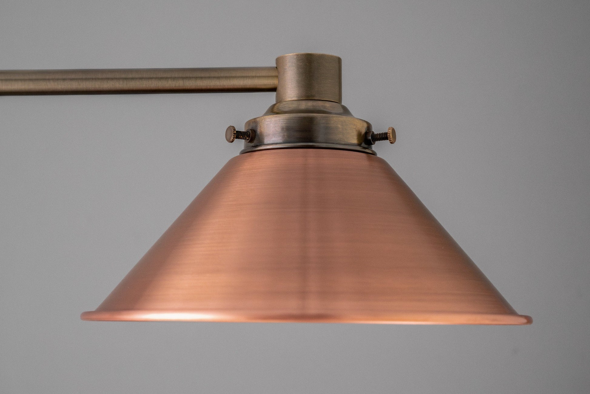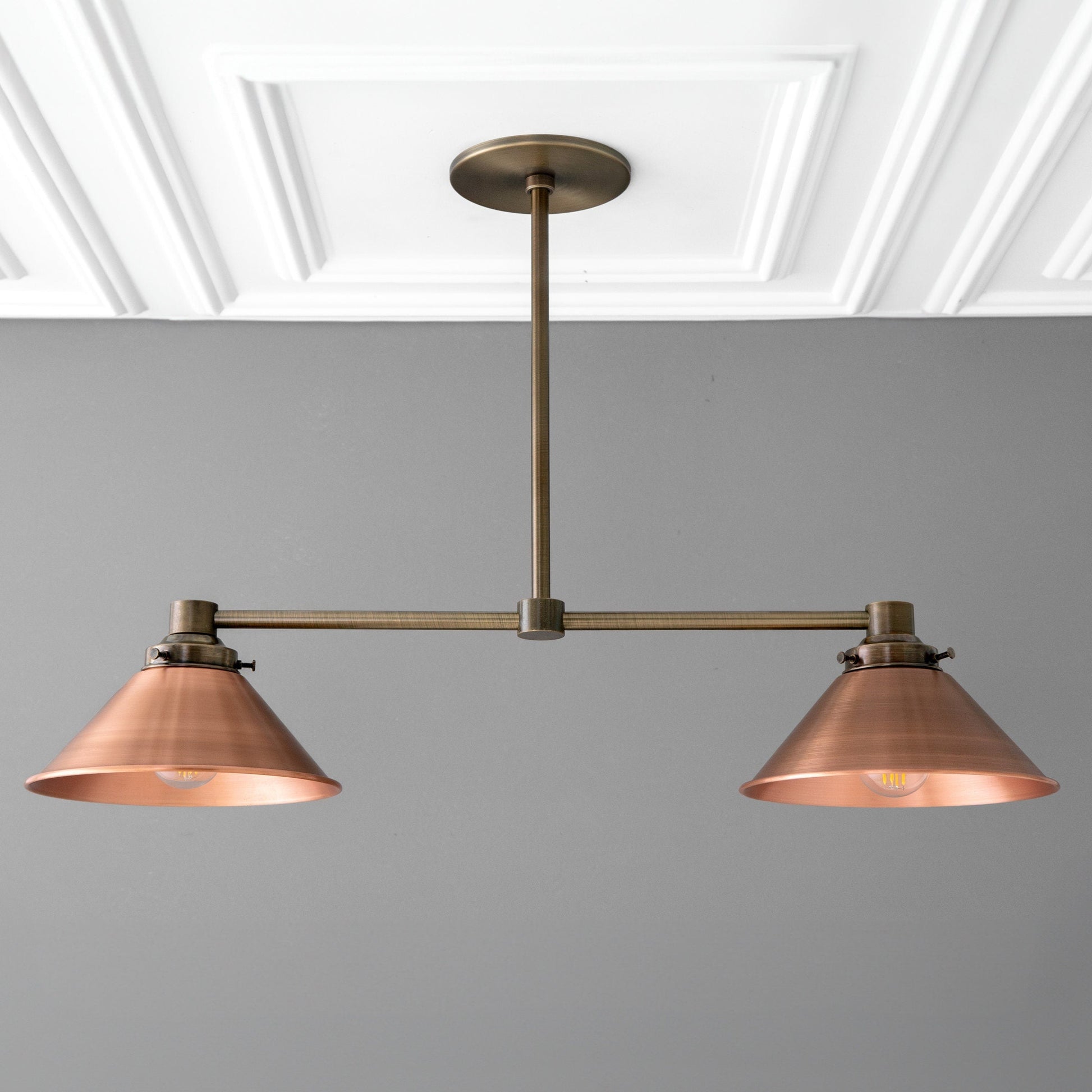 This in-line chandelier features your choice of finish on the drop and supporting arms with copper cone shades.
