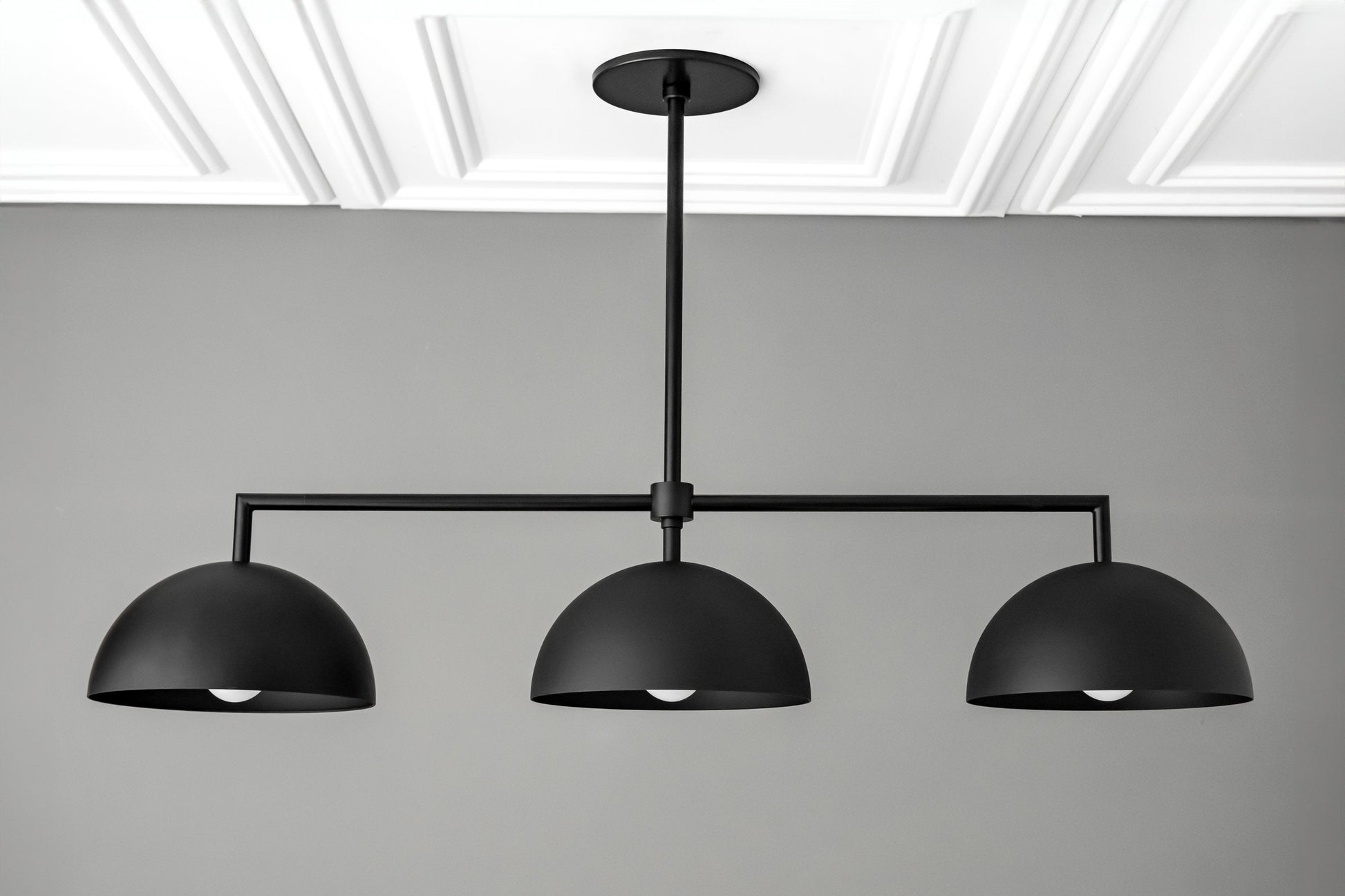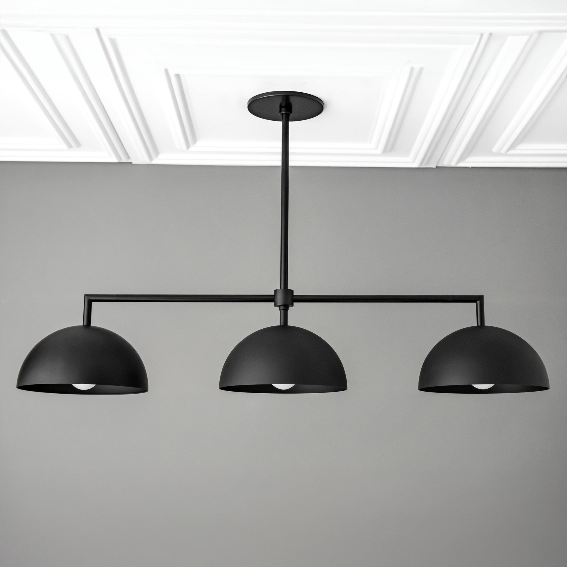 This in-line chandelier features your choice of finish on the drop and supporting arms with large dome shades.