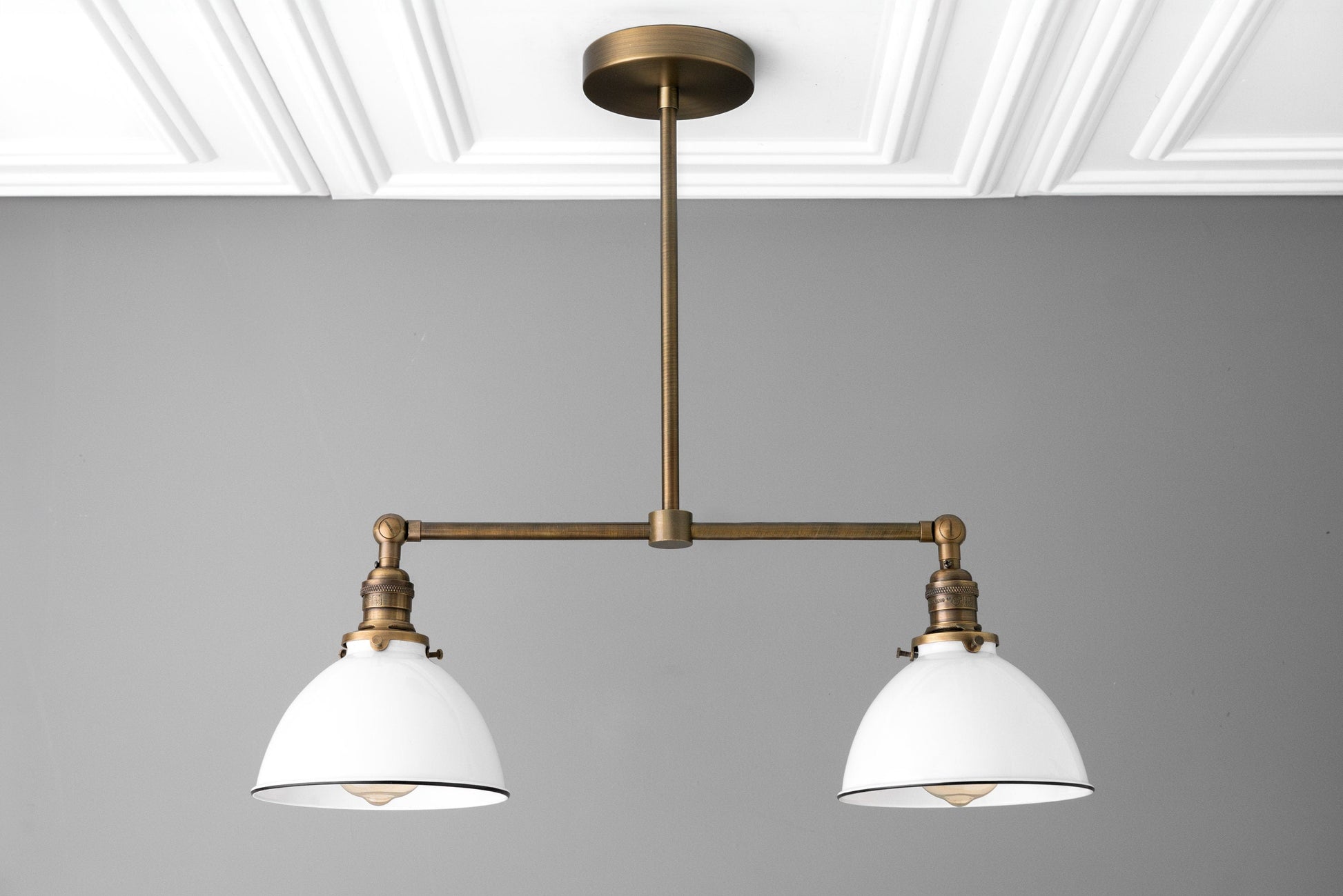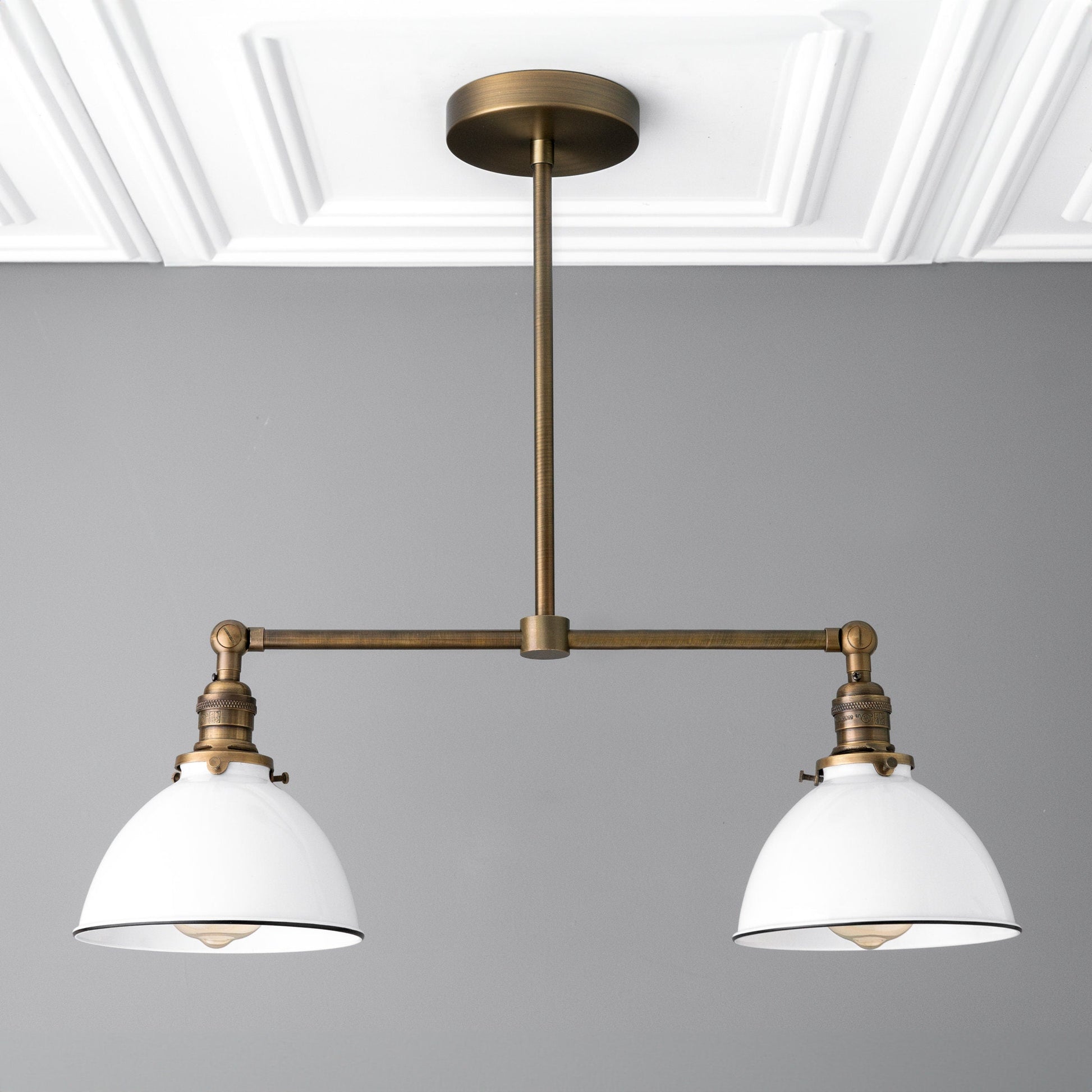 This in-line chandelier features your choice of finish on the drop and supporting arms with white bucket shades.
