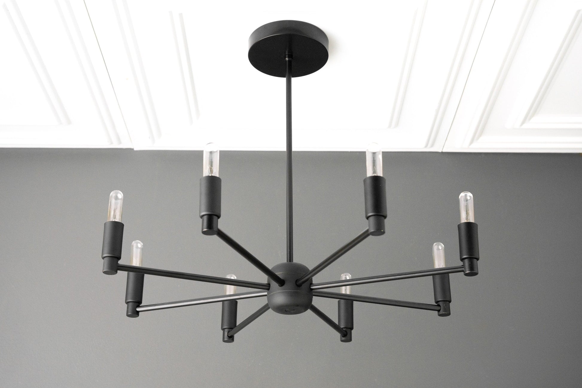 This classic 8 bulb chandelier features T6 tubular bulbs for a mid-century lighting.