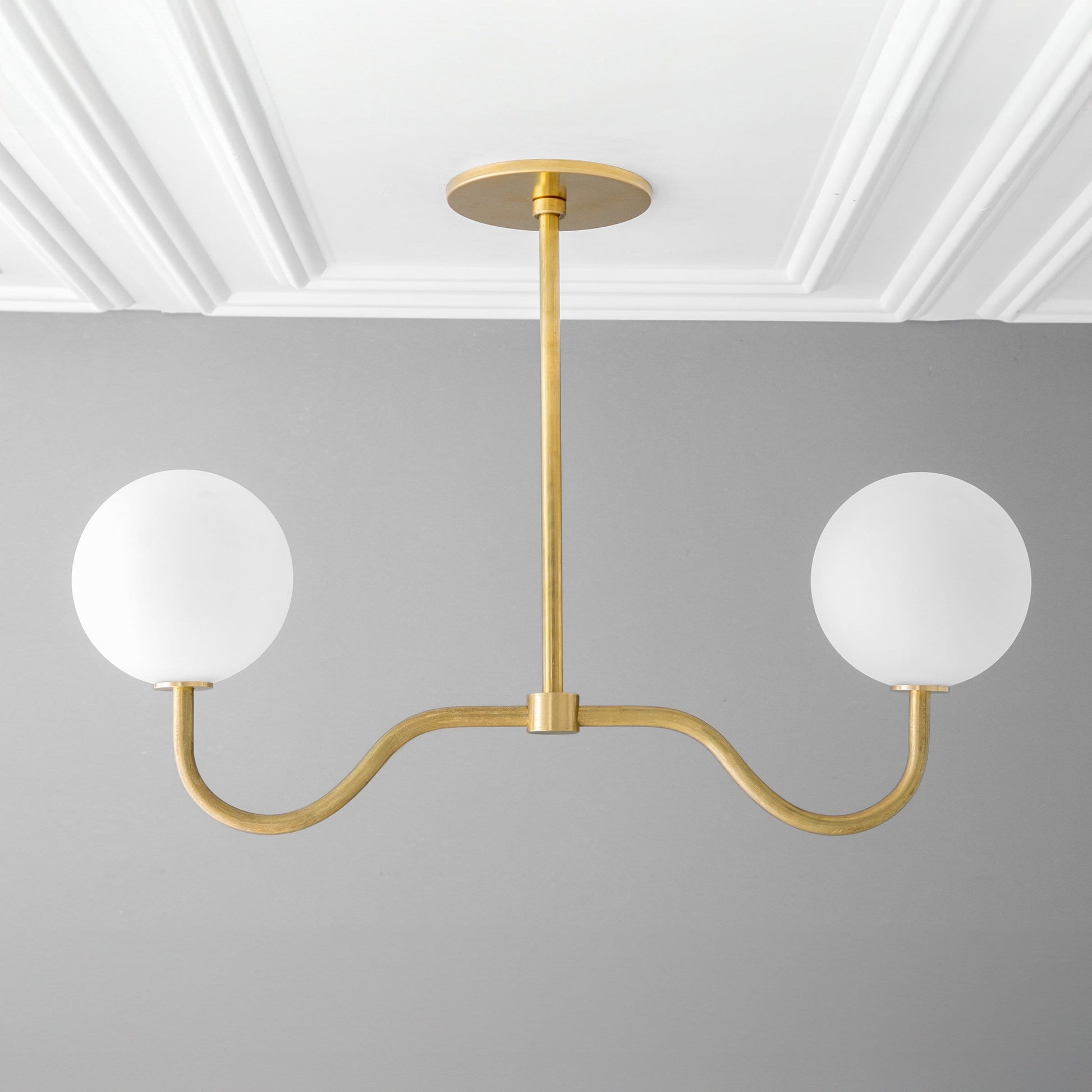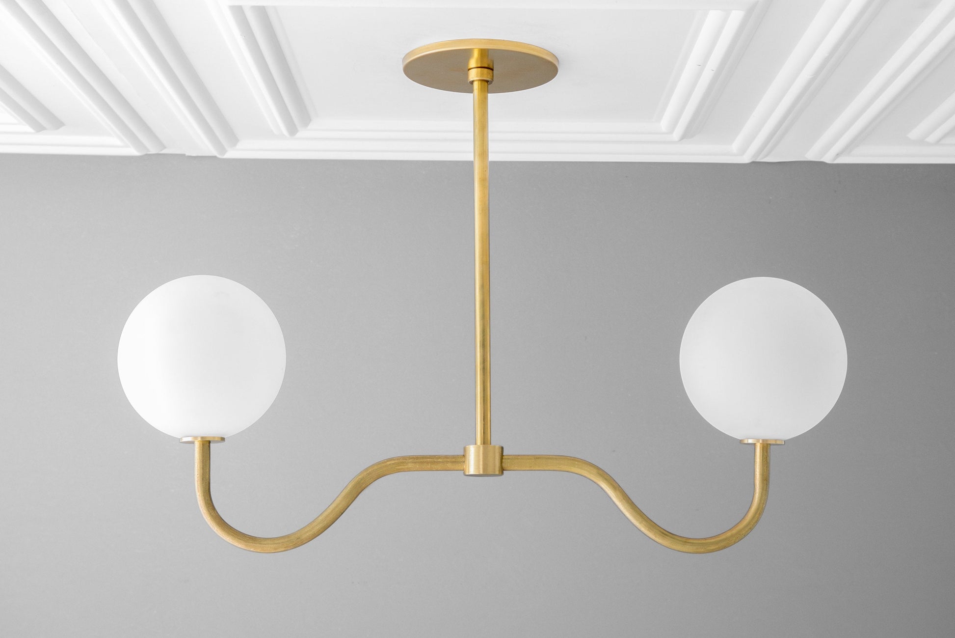 This in-line chandelier features your choice of finish on the drop and supporting arms with white glass globes.