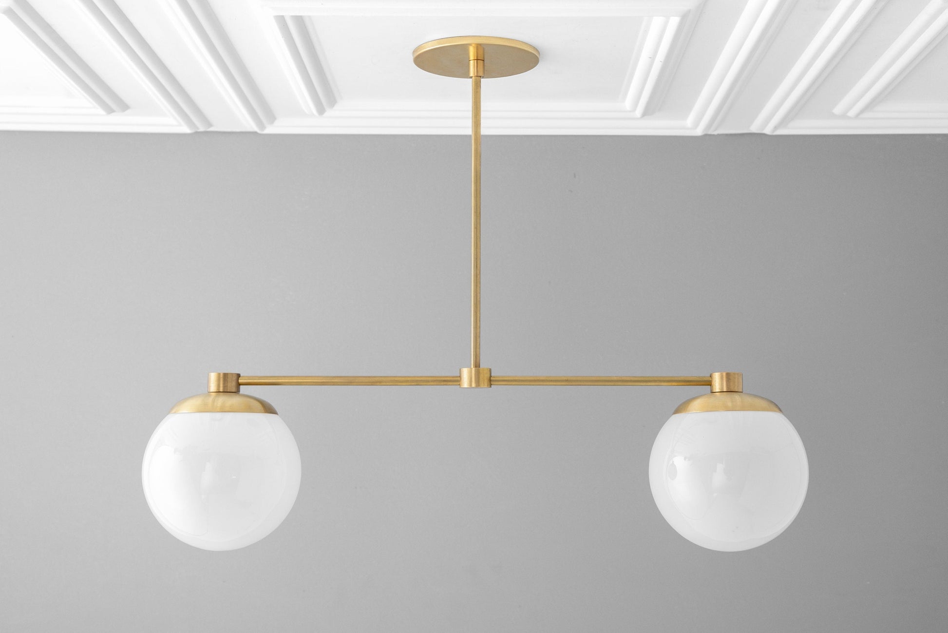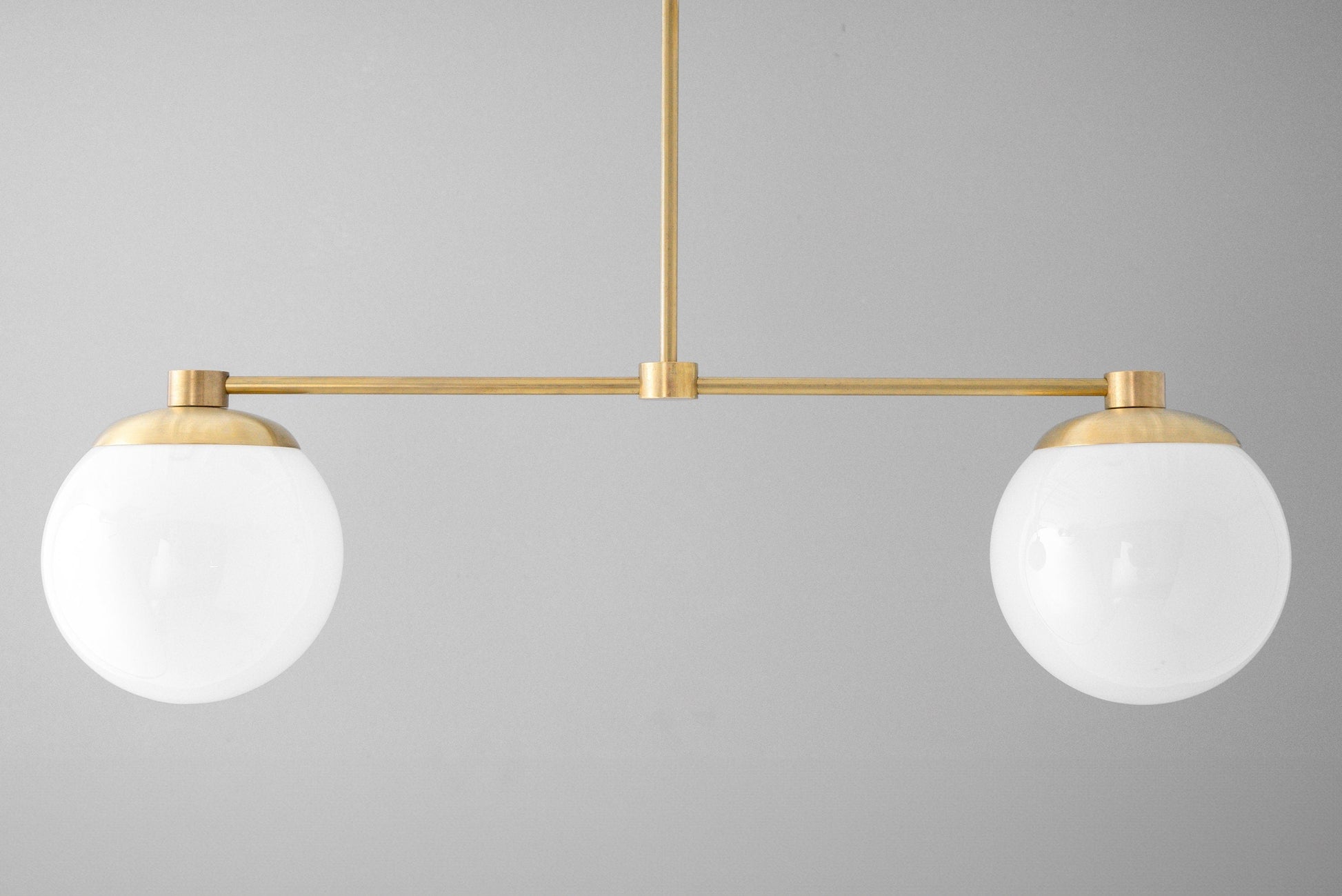 This in-line chandelier features your choice of finish on the drop and supporting arms with white glass globes.