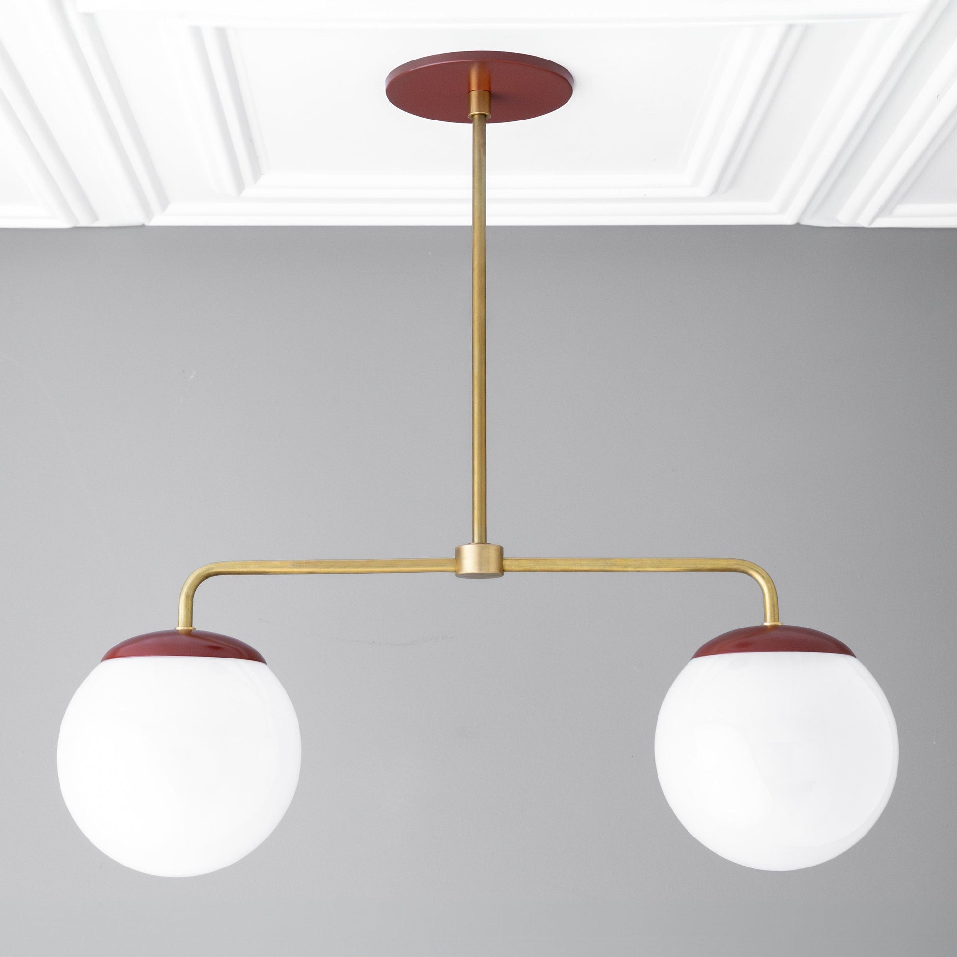 This in-line chandelier features your choice of finish on the drop and supporting arms with white glass globes.
