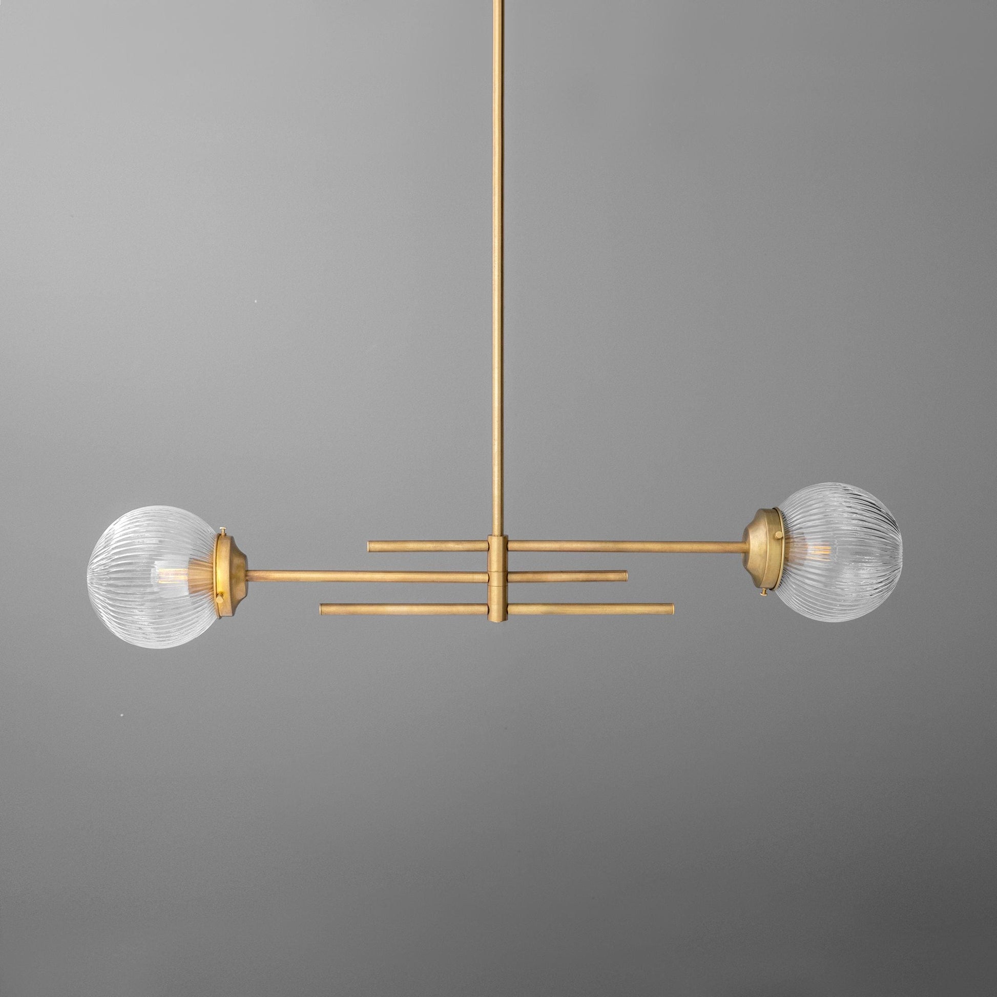 Unveil a touch of modern luxury with this uniquely designed two-light chandelier, featuring a sophisticated gold finish and elegantly ribbed glass shades. The chandelier's asymmetrical structure and clean lines make it a striking centerpiece for any contemporary space, whether in a dining room, kitchen, or living area. The ribbed glass diffuses light beautifully, creating a warm and inviting atmosphere while adding a layer of visual texture. This chandelier is the perfect blend of modern design and timeless appeal, offering both style and function for your home.