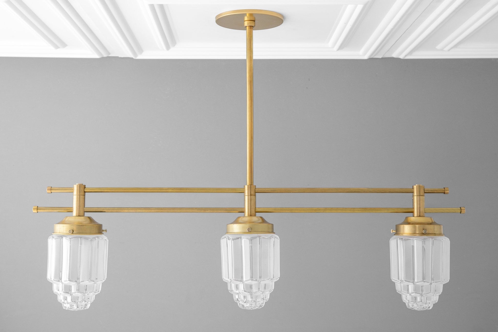 This in-line chandelier features your choice of finish on the drop and supporting arms with skyscraper globes.