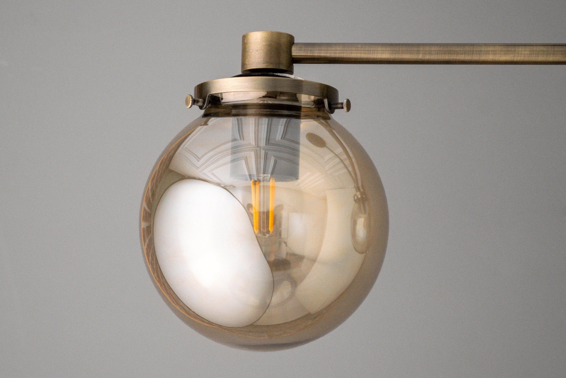 This in-line chandelier features your choice of finish on the drop and supporting arms with smoked glass globes.