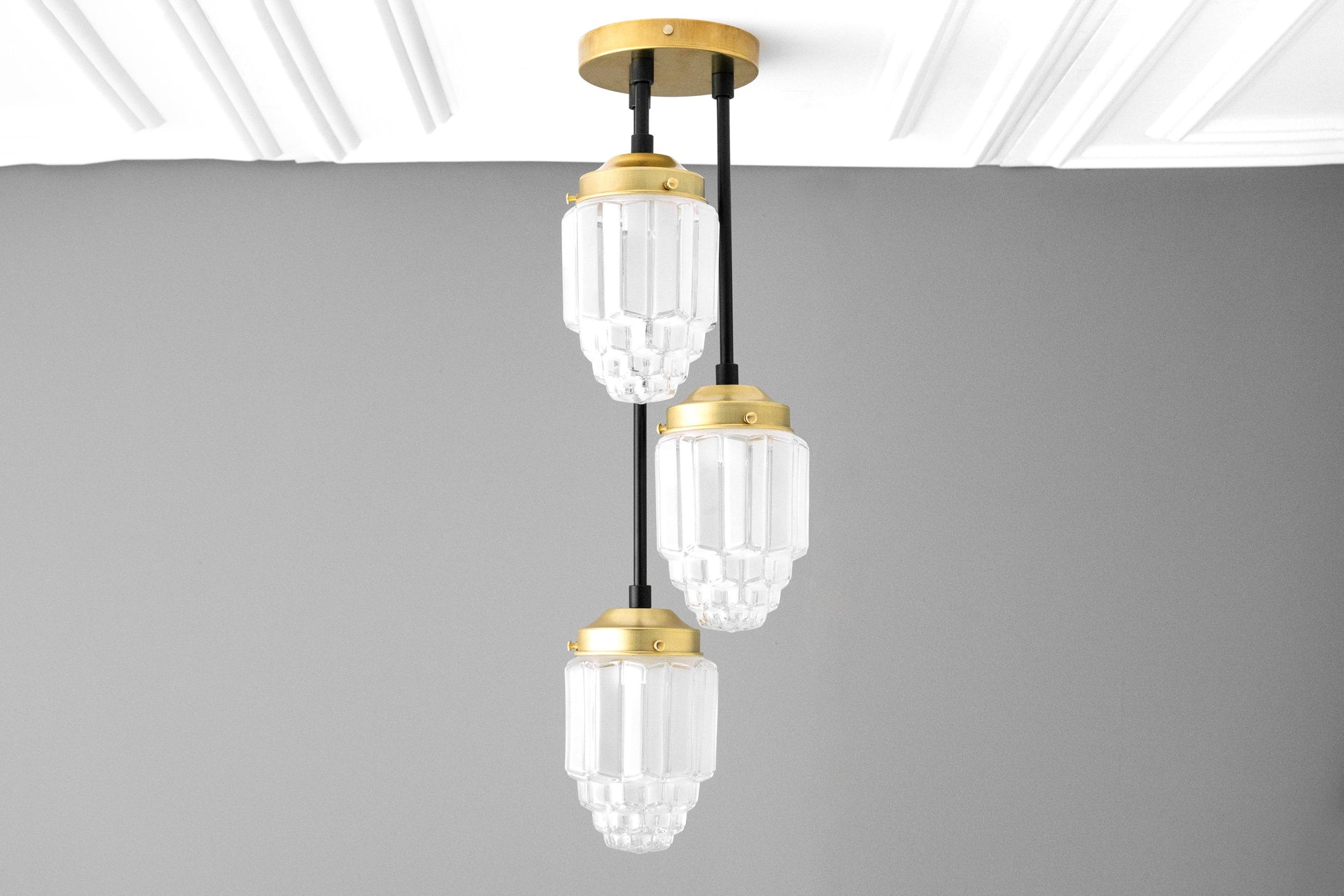 This three tiered Art Deco ceiling light features our unique skyscraper globes. These matte frosted glass globes are delicately trimmed in clear gloss glass giving the globes a sparkling crystal look.
