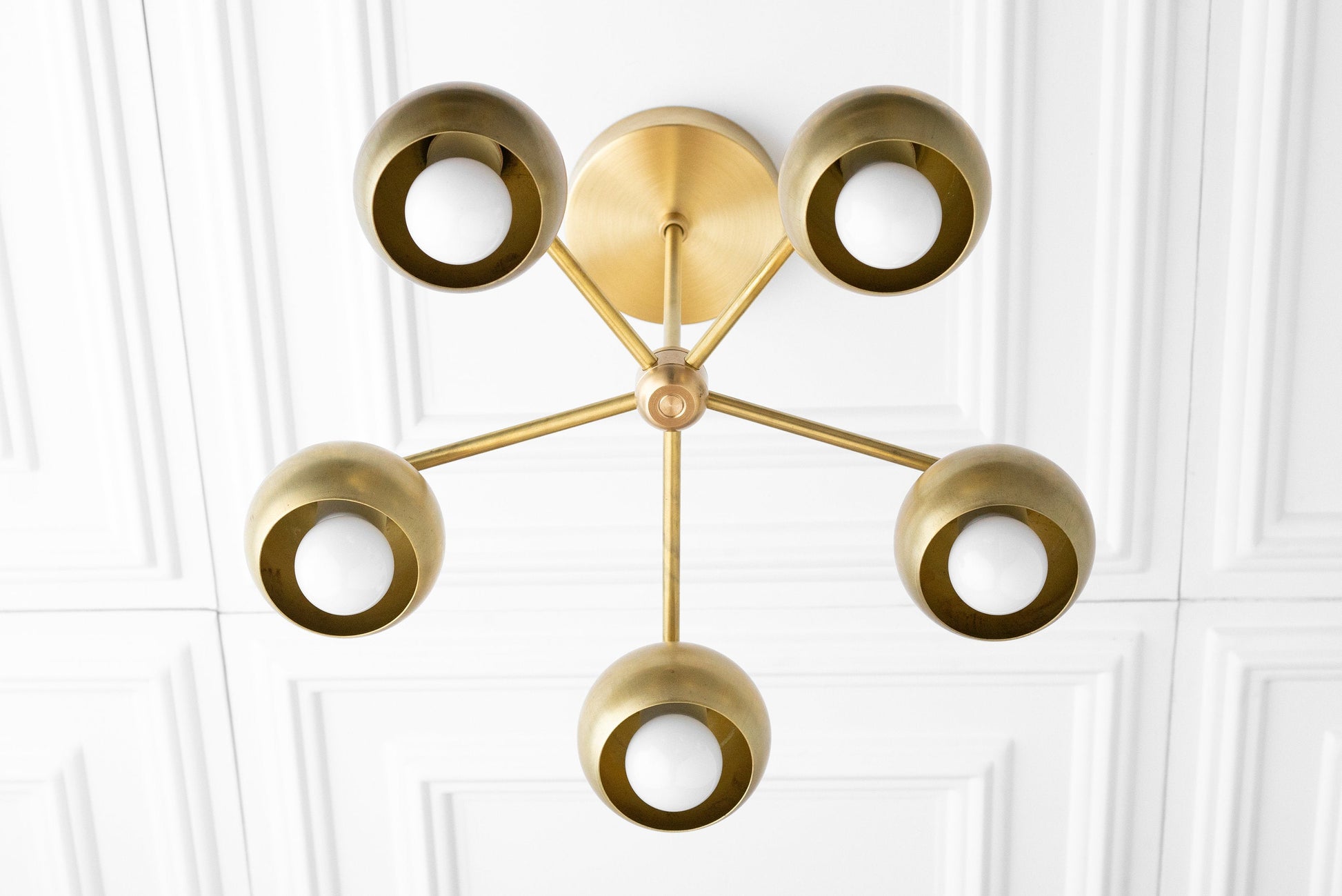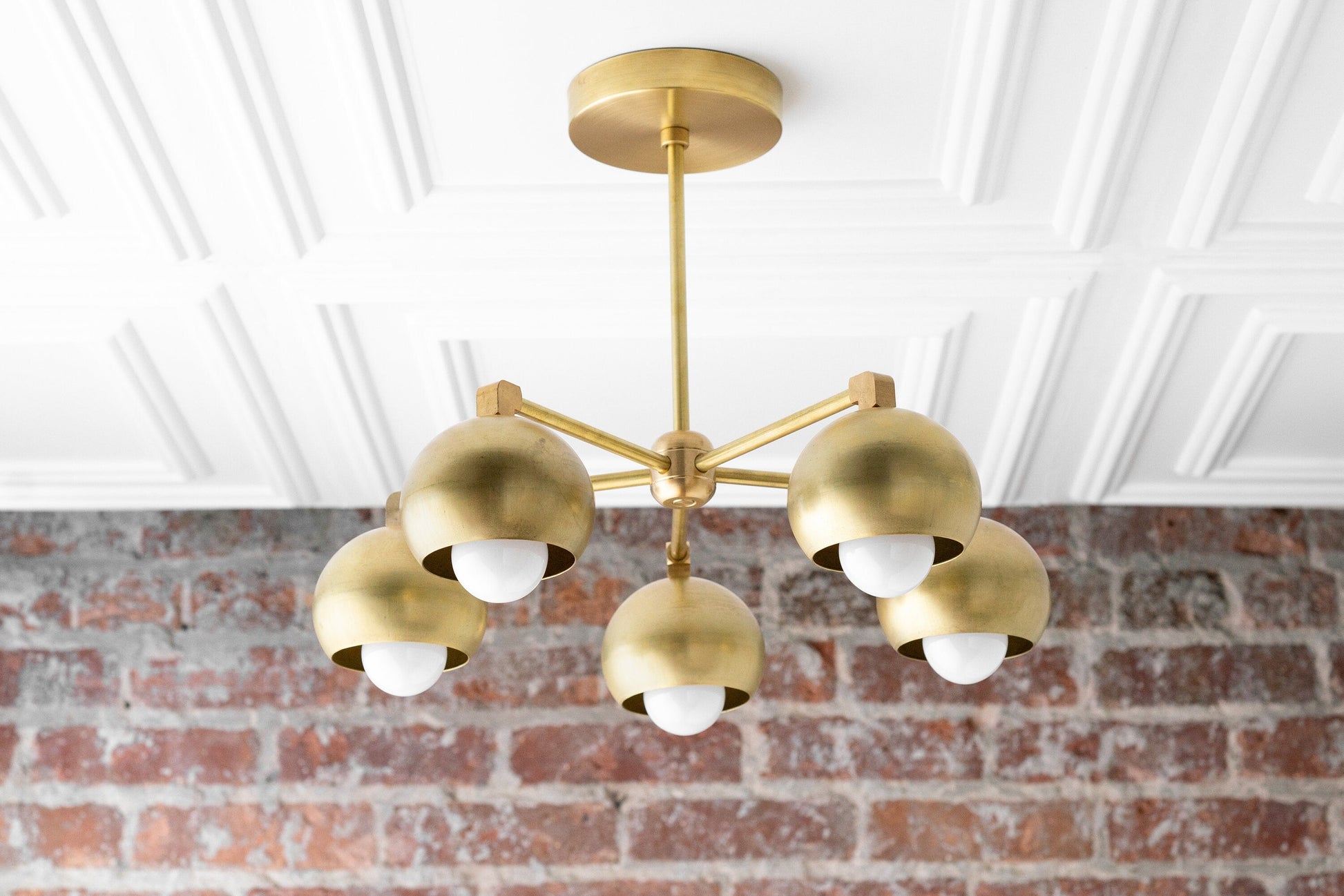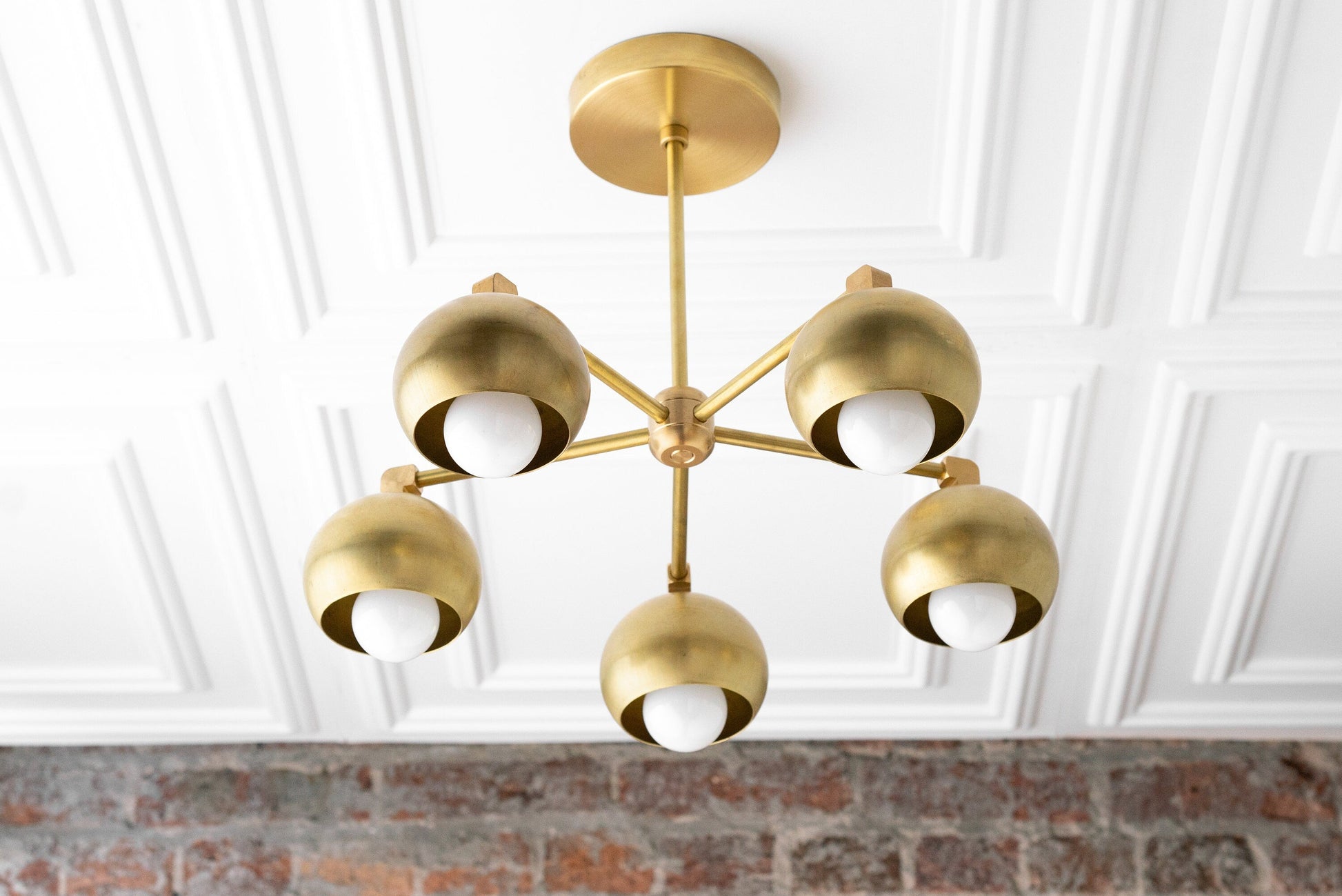 This mid-century modern five bulb traditional ball shade chandelier features our soft natural brass or black finish. The light fixture is available in solid finish, brass with black shades or black with brass shades.