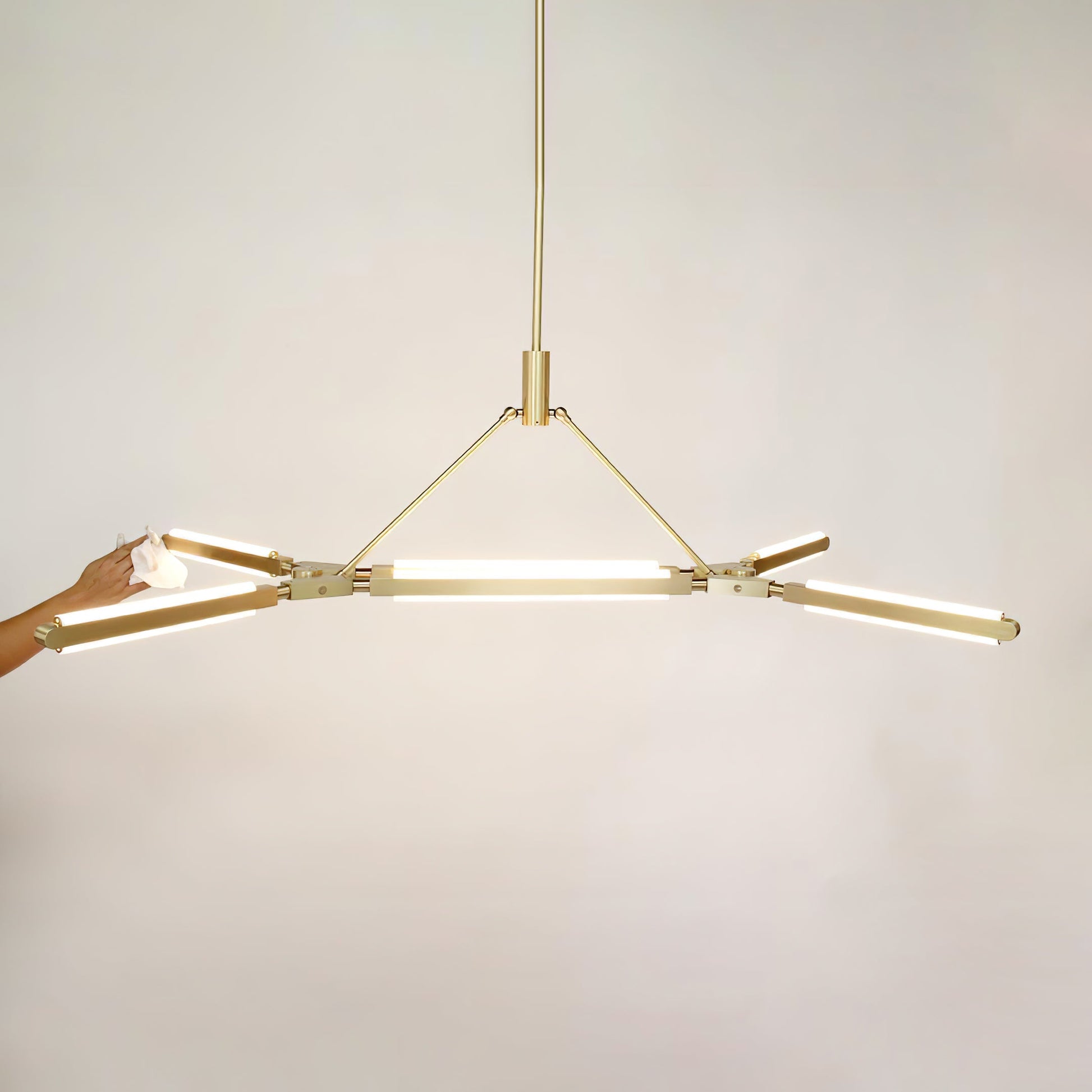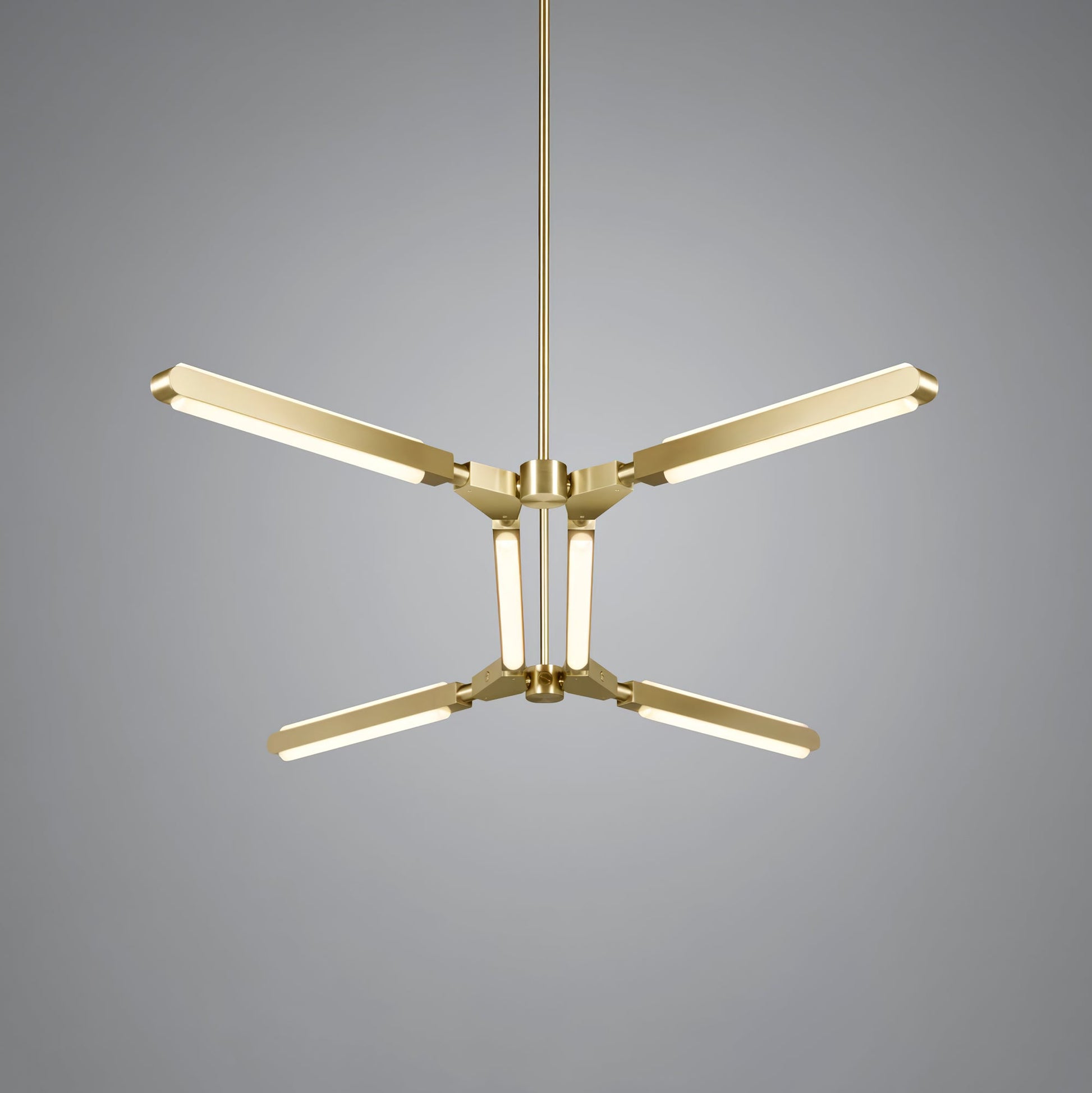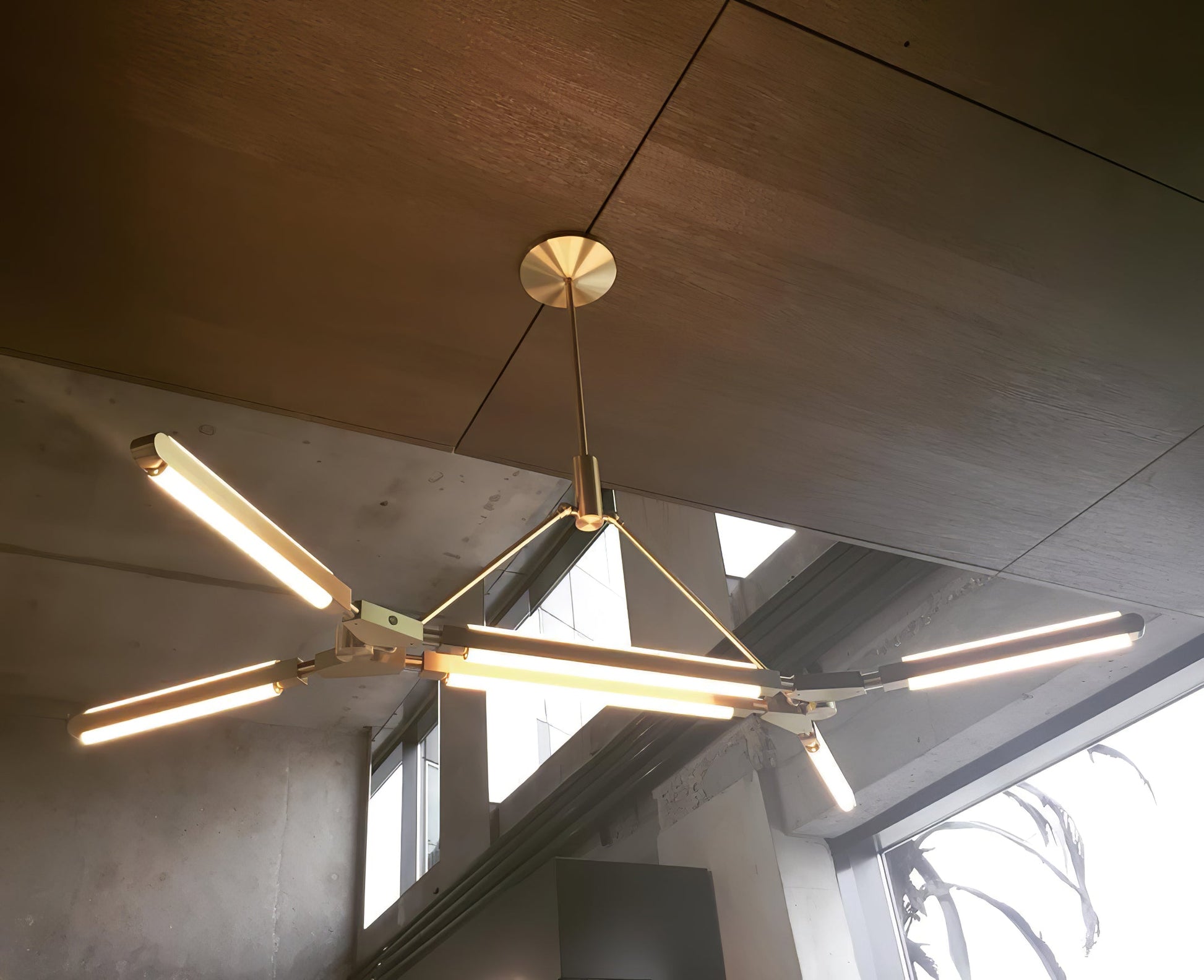 Pris is a slim, sleek lighting system with a futuristic feel. Named after the fembot character in the neo-noir film, Blade Runner, Pris is available in a series of configurations ranging from simple sconces to multi-dimensional chandeliers. Every fixture is an arrangement of machined linear arms, inset with LED light sources. These beams of light, joined by jewel-shaped connectors, are the defining elements of the Pris system. The double-sided LEDs create an immersive environment with warm light. Impeccably stylish, Pris creates an expandable language of visual geometries.