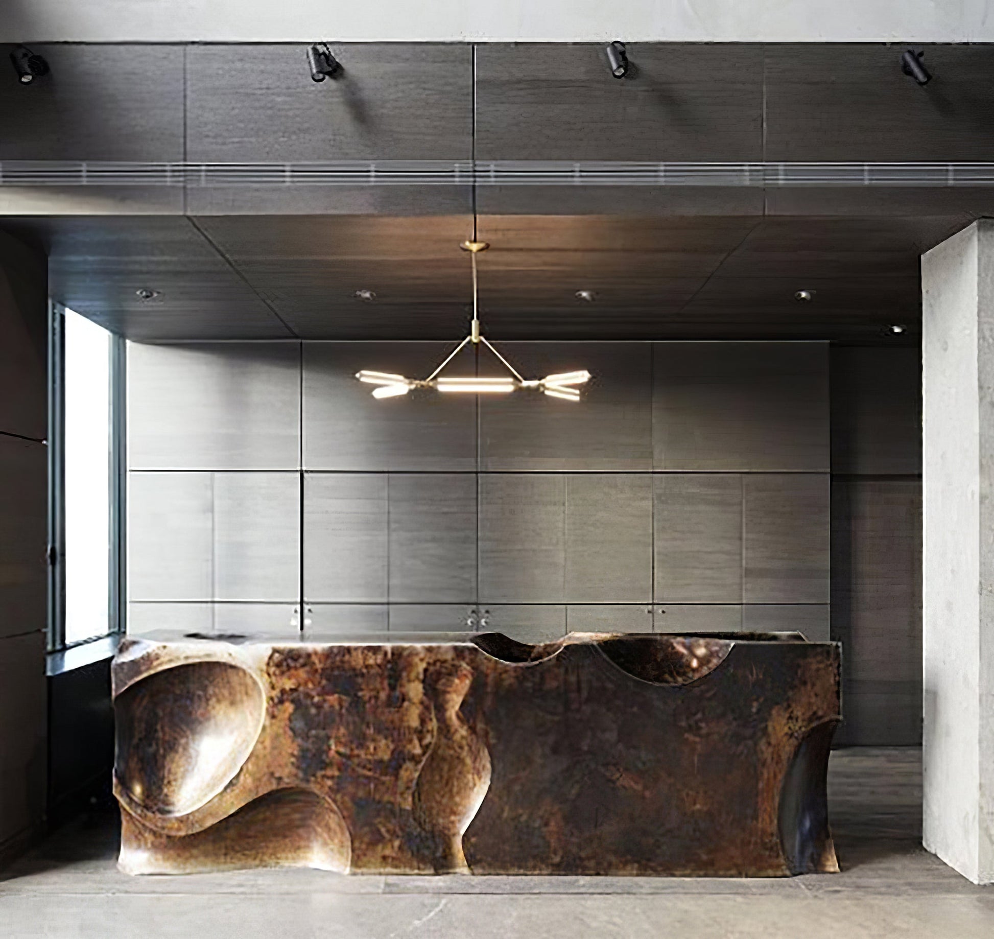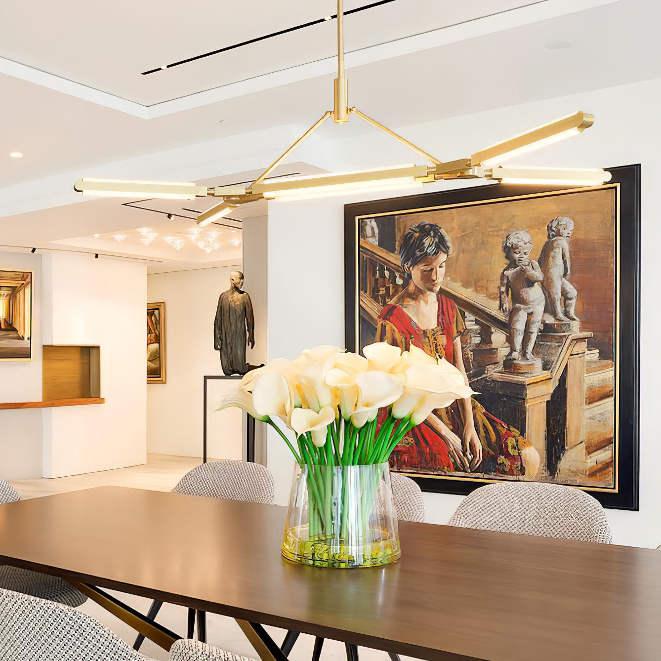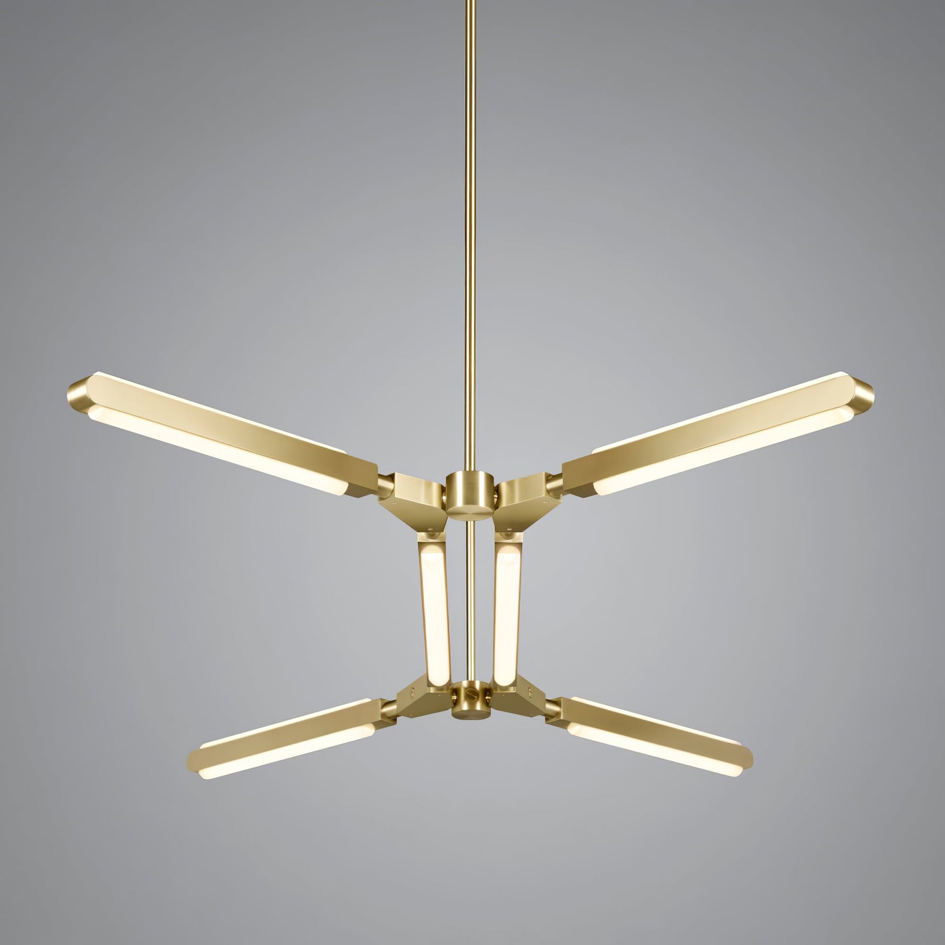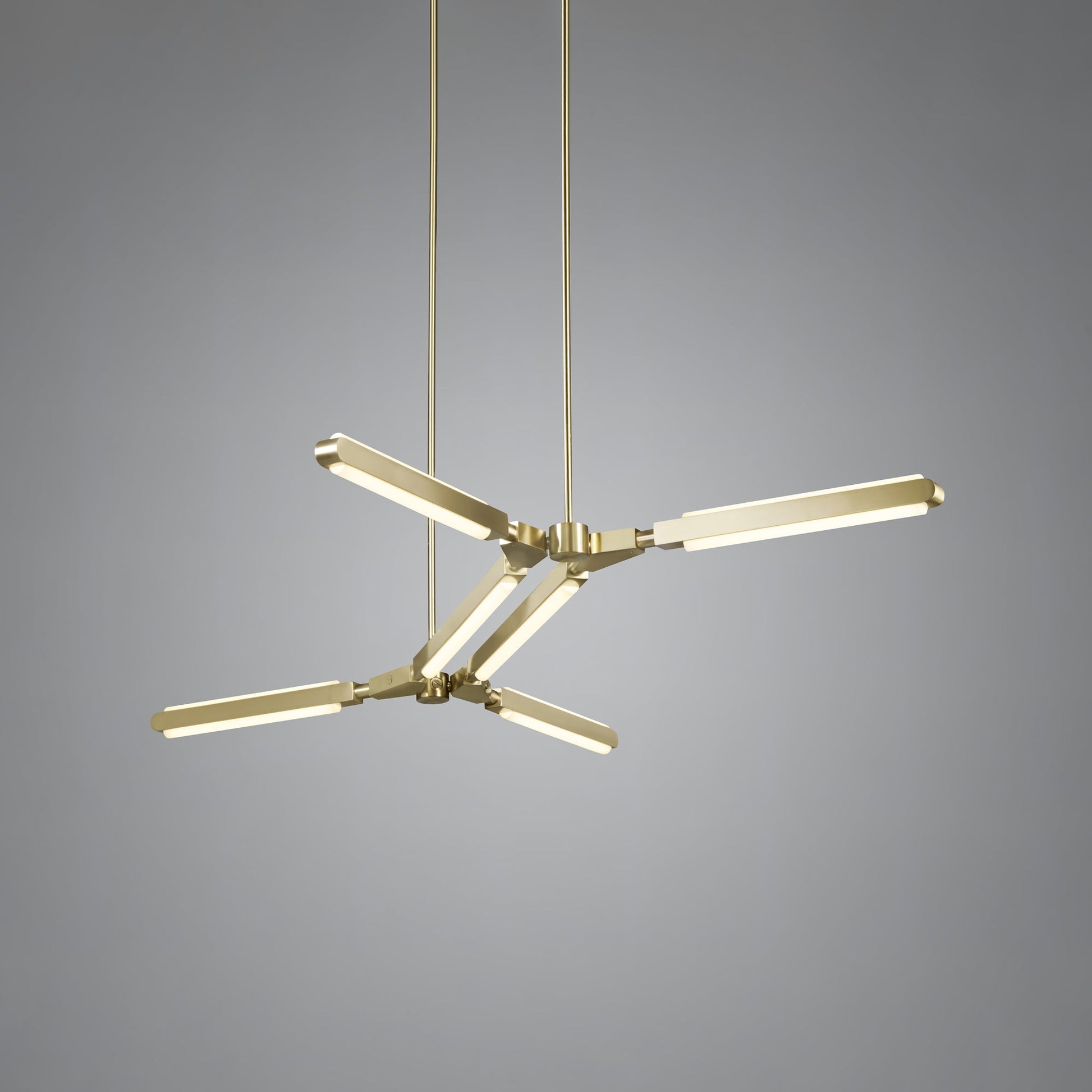 Pris is a slim, sleek lighting system with a futuristic feel. Named after the fembot character in the neo-noir film, Blade Runner, Pris is available in a series of configurations ranging from simple sconces to multi-dimensional chandeliers. Every fixture is an arrangement of machined linear arms, inset with LED light sources. These beams of light, joined by jewel-shaped connectors, are the defining elements of the Pris system. The double-sided LEDs create an immersive environment with warm light. Impeccably stylish, Pris creates an expandable language of visual geometries.
