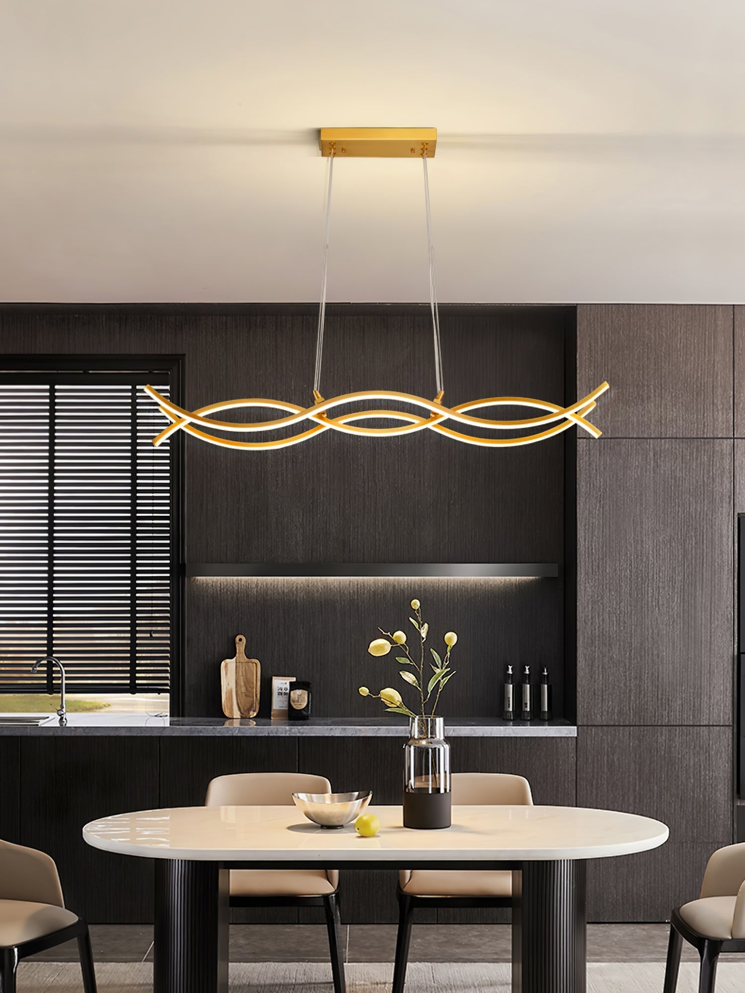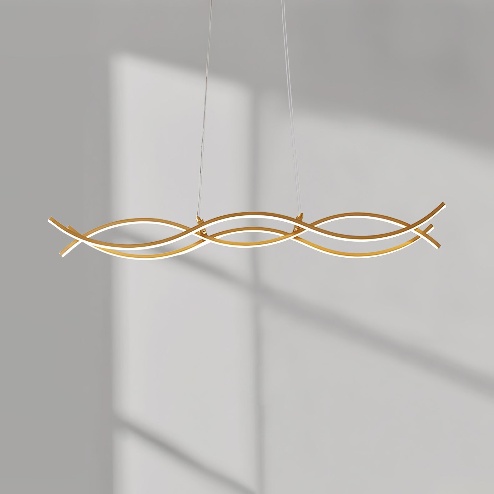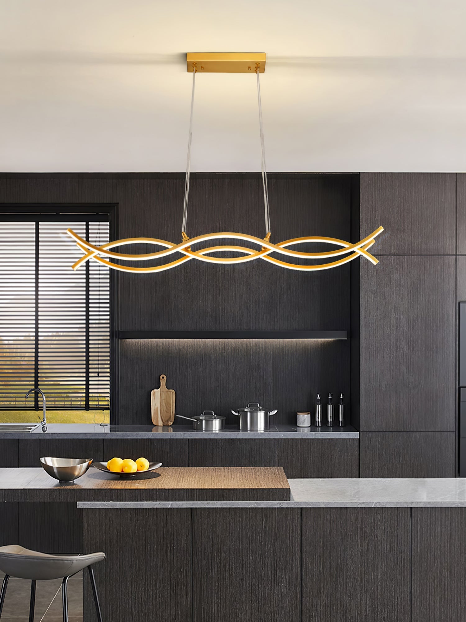 Modern elegance is flaunted by the Wave Island Pendant Light. This hanging lamp is made of plated Brass that displays a refined fusion of wavy lines, with a soft wedge-type radiance. It is the perfect light fitting for the modern adventurous because of its artistic illumination, representing the glowing sun on top of mountain ranges.