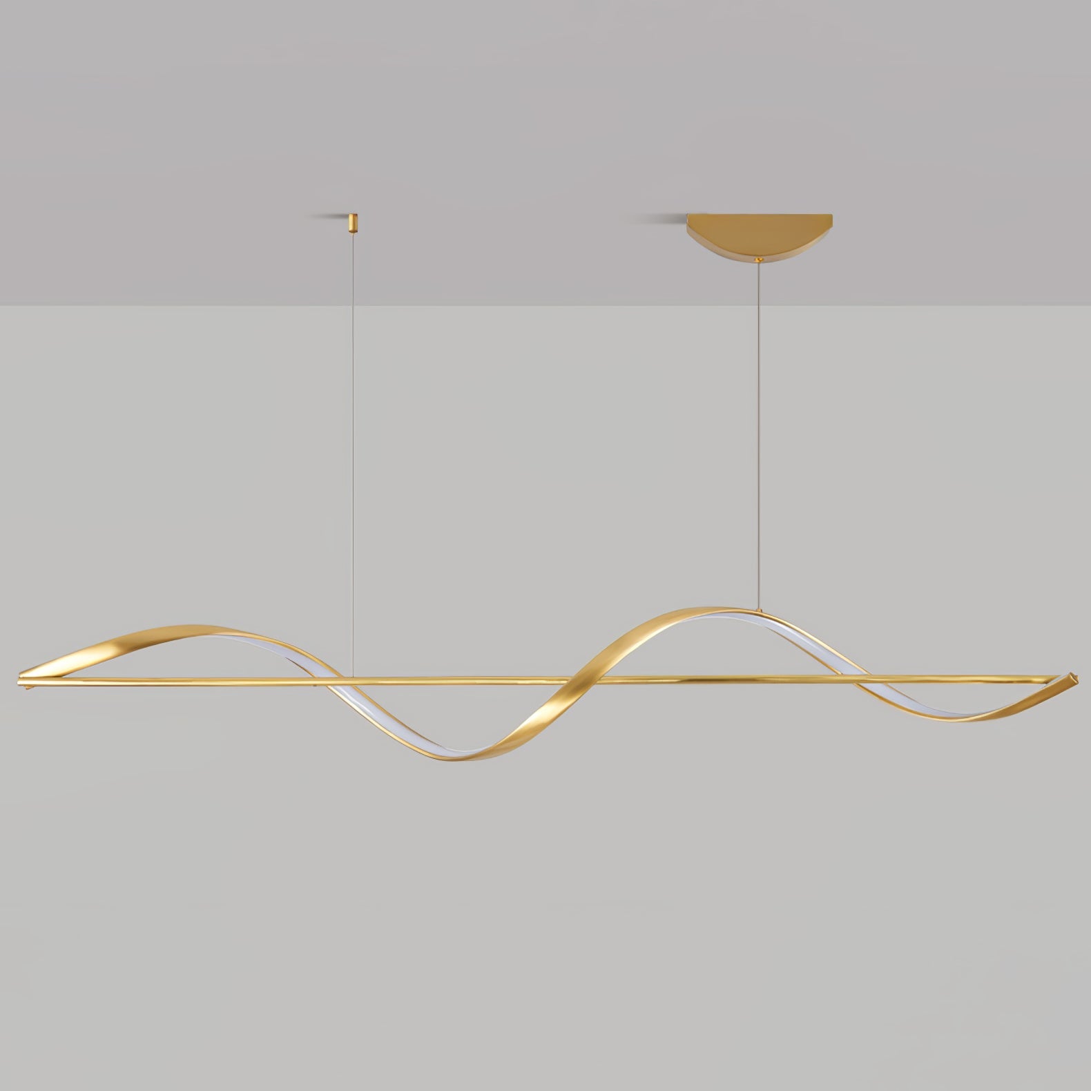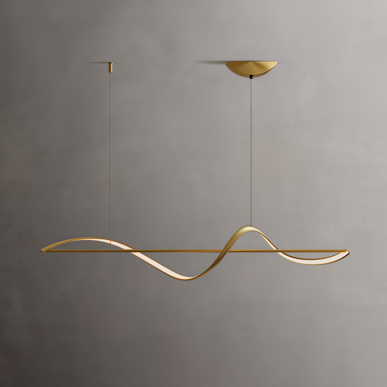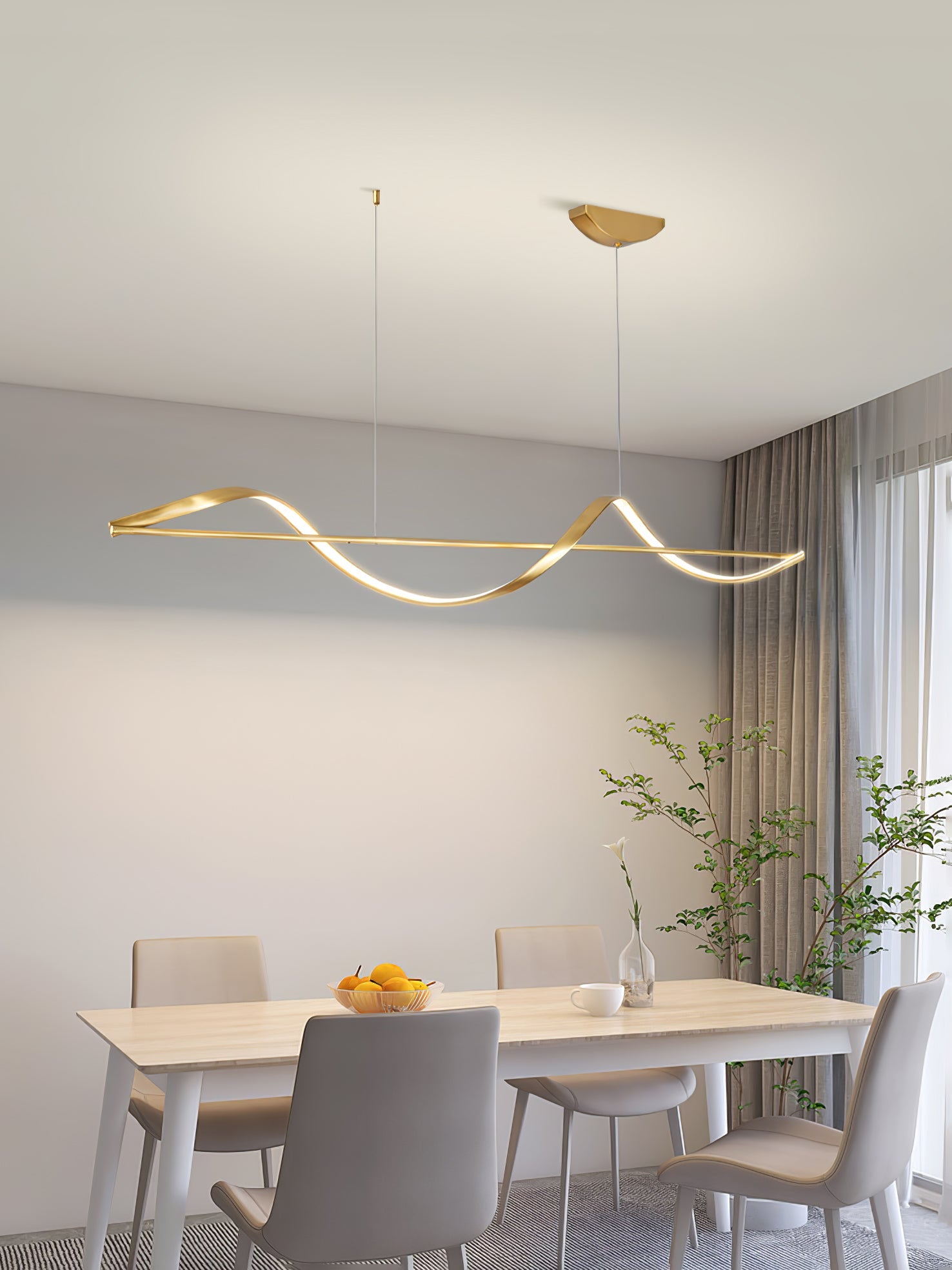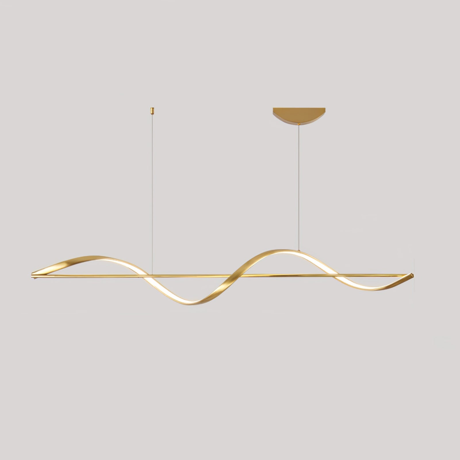 Modern elegance is flaunted by the Whisper Linear Island Light. This hanging lamp is made of plated aluminum that displays a refined fusion of wavy lines, with a soft wedge-type radiance. It is the perfect light fitting for the modern adventurous because of its artistic illumination, representing the glowing sun on top of mountain ranges.