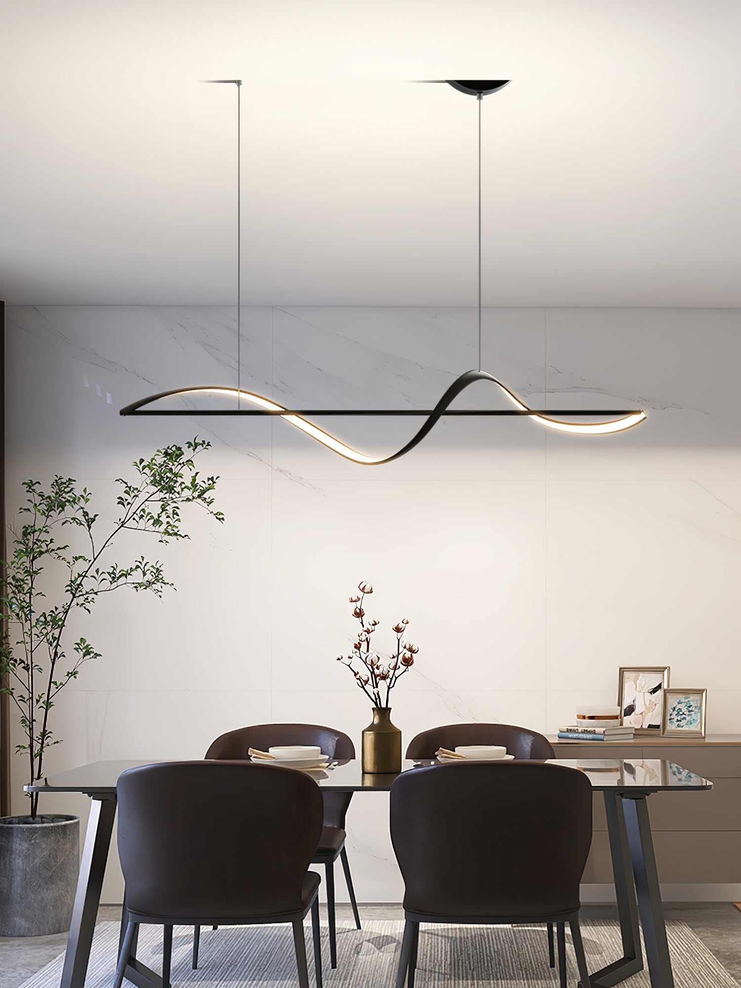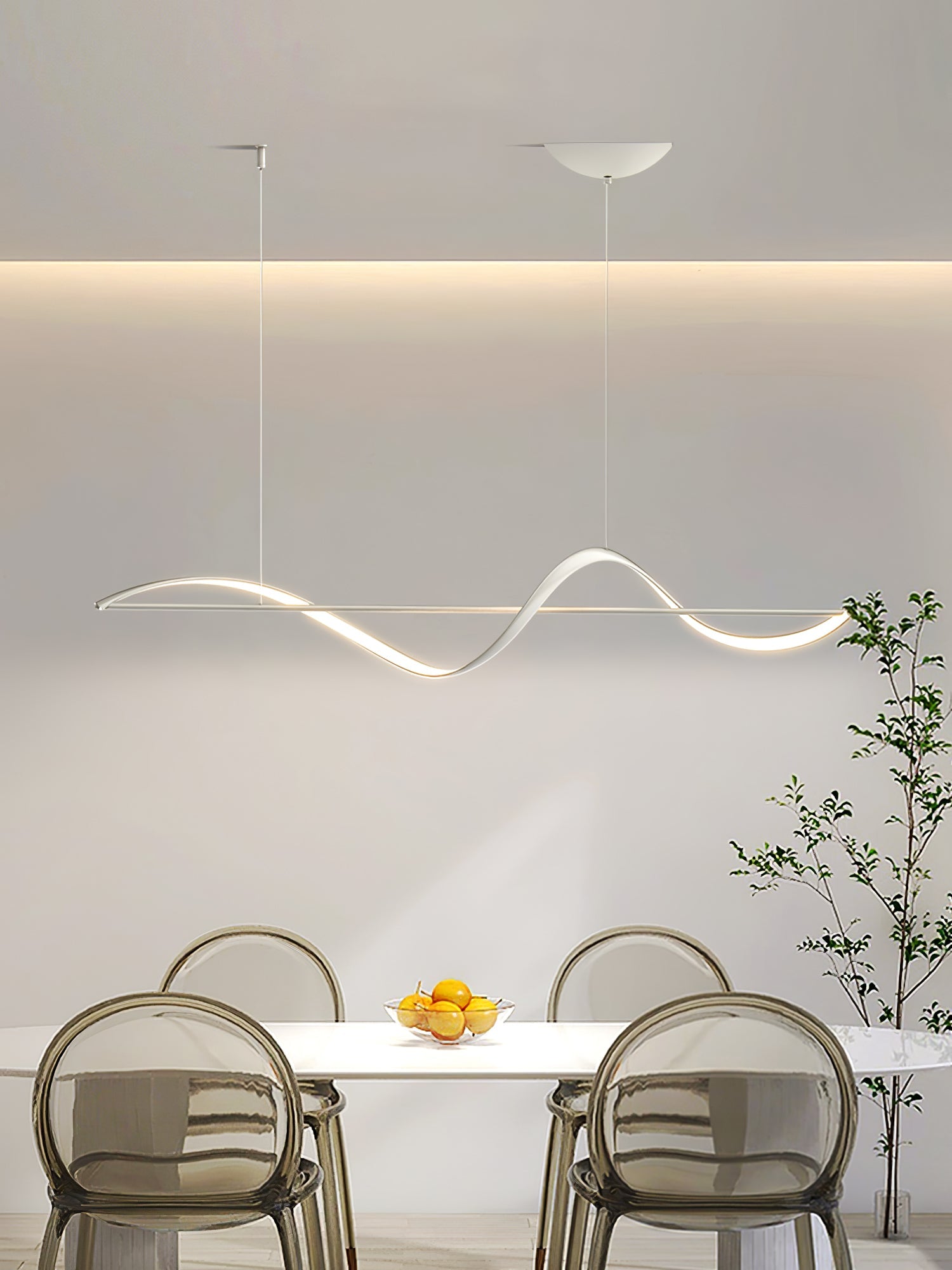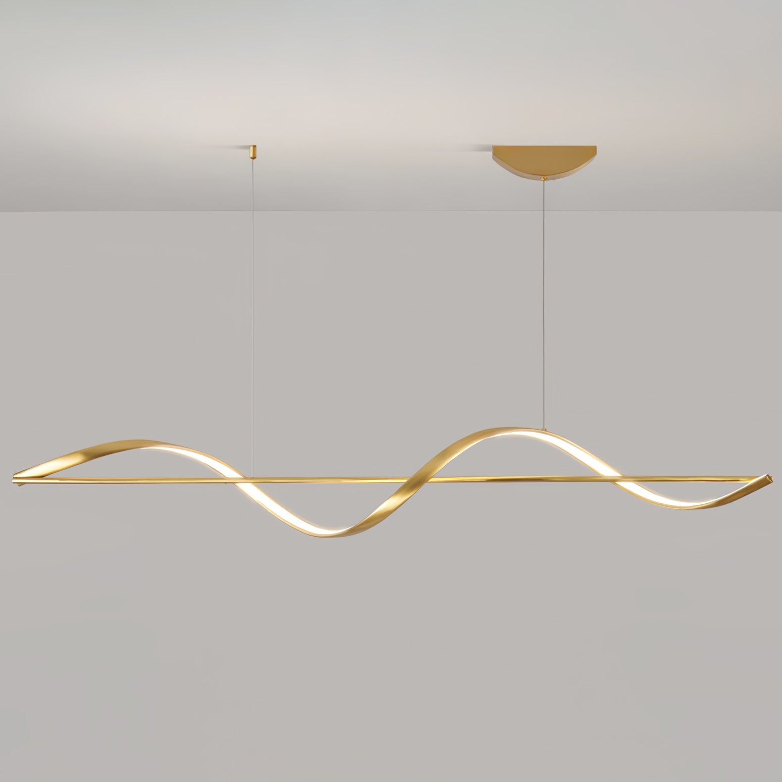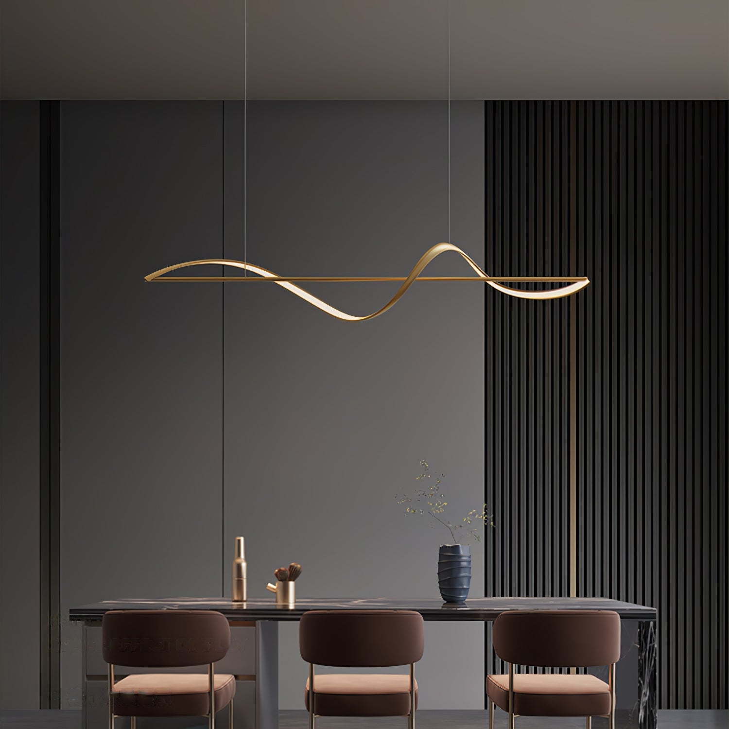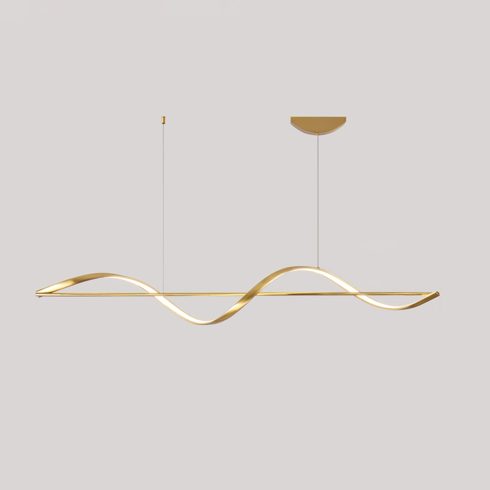 Modern elegance is flaunted by the Whisper Linear Island Light. This hanging lamp is made of plated aluminum that displays a refined fusion of wavy lines, with a soft wedge-type radiance. It is the perfect light fitting for the modern adventurous because of its artistic illumination, representing the glowing sun on top of mountain ranges.