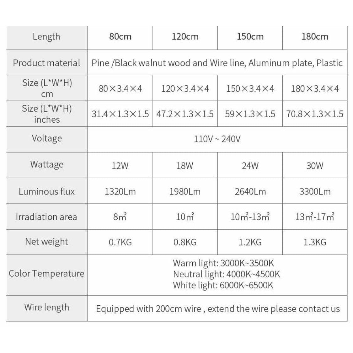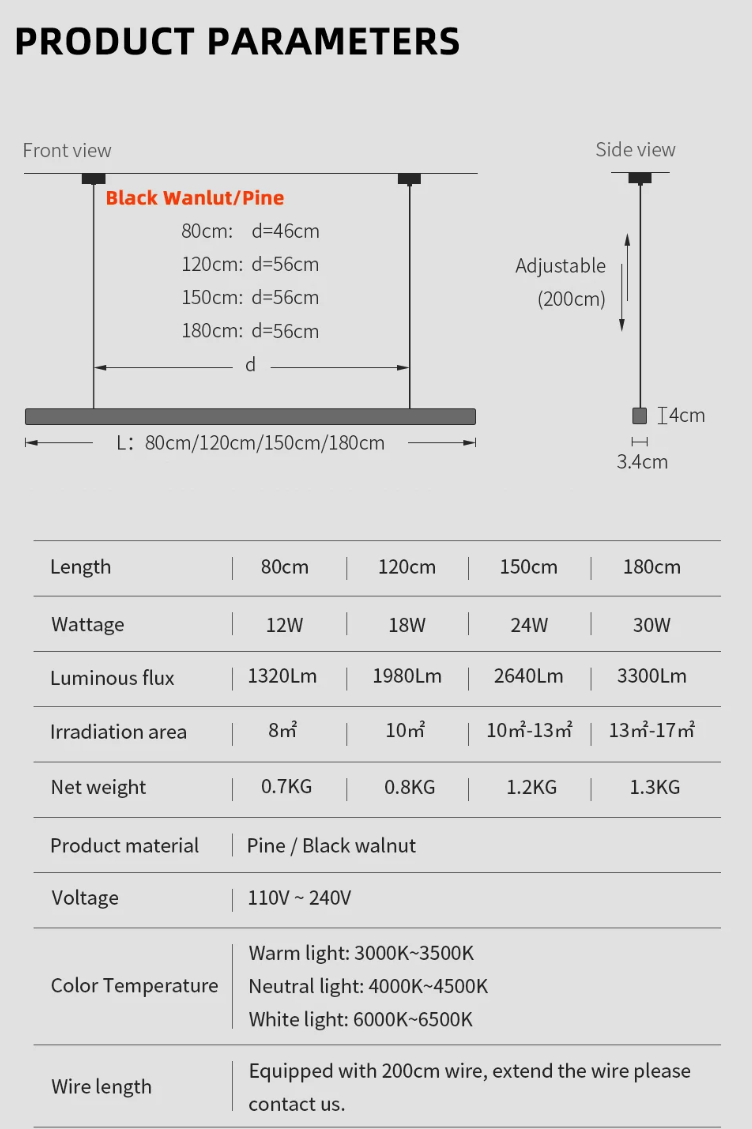 80cm lamp with 50cm canopy (high 2 cm, width 3.4 cm) 80CM = 31.5”, 120CM = 47.2”, 150CM = 59”, 180CM = 70.9” |