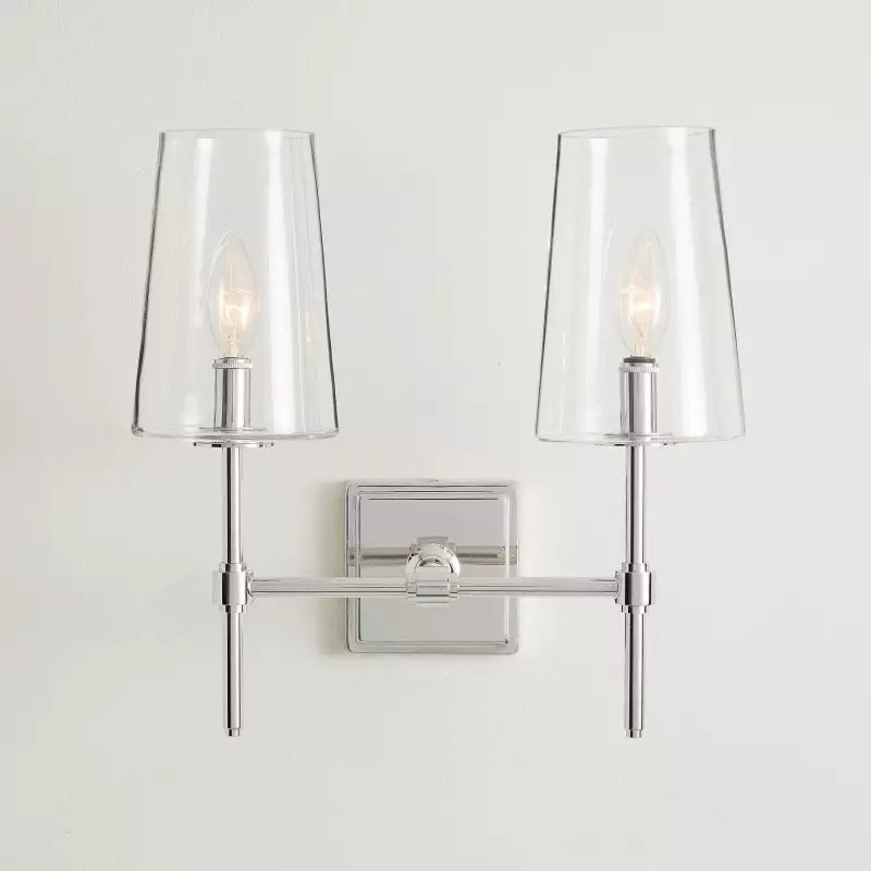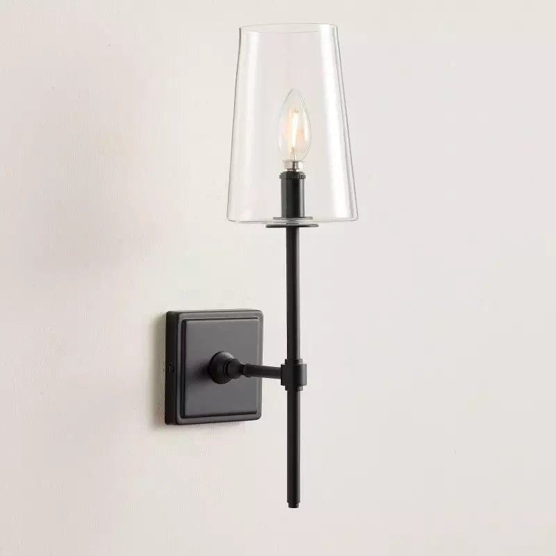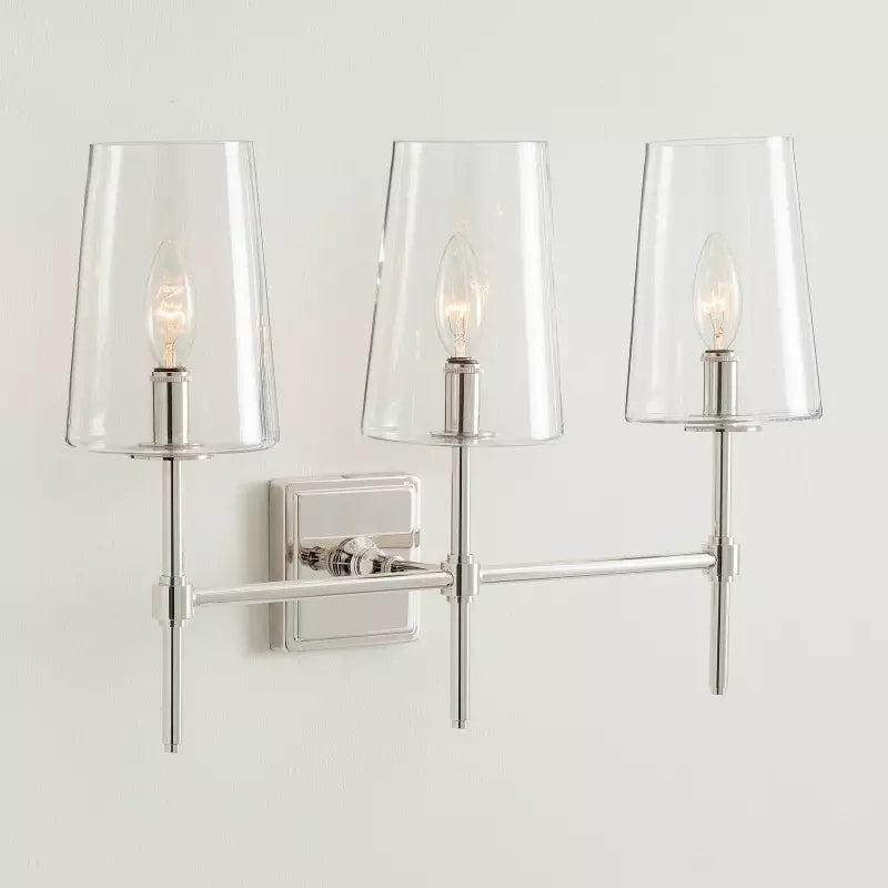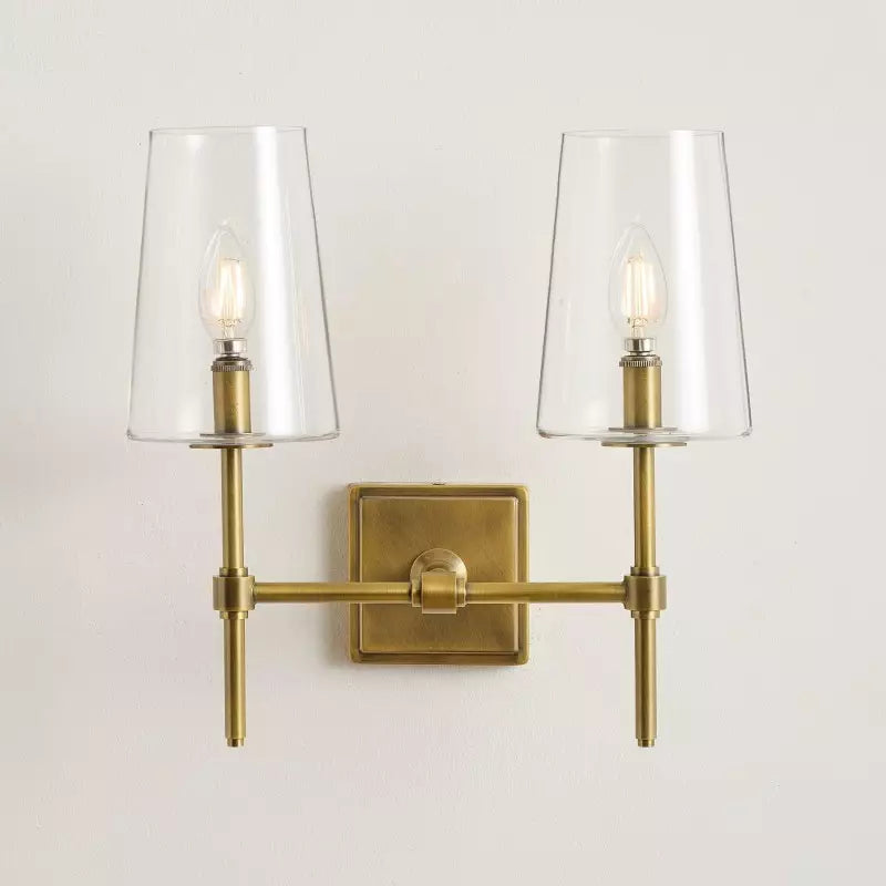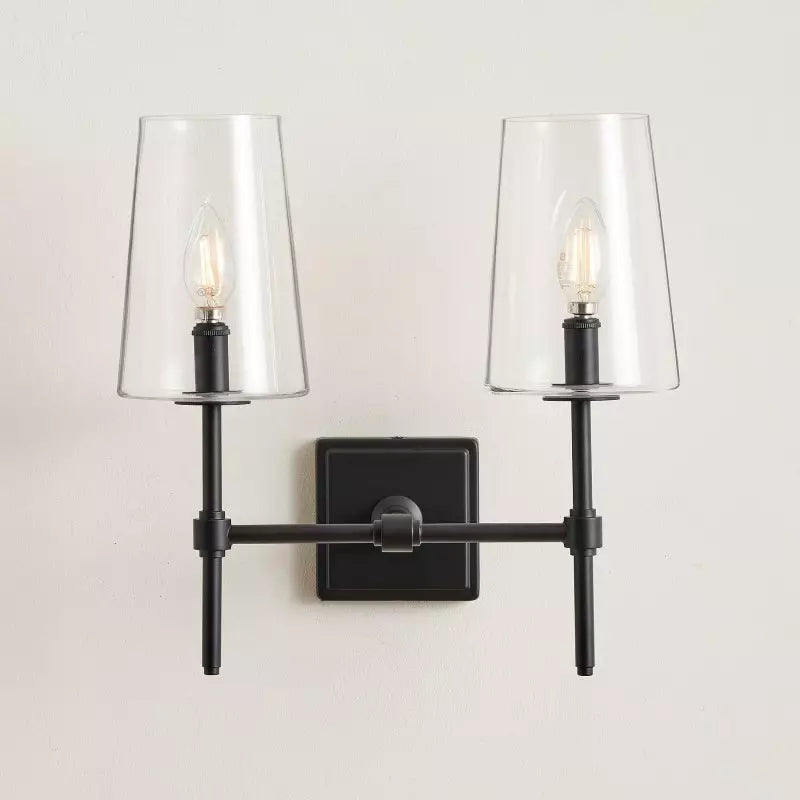 Made of durable metal in Warm Brass, Matte Black, or Polished Nickel, it combines classic farmhouse charm with modern lines. Featuring 1, 2, or 3 arms with clear glass shades, it adds vintage character while providing bright, refined lighting.