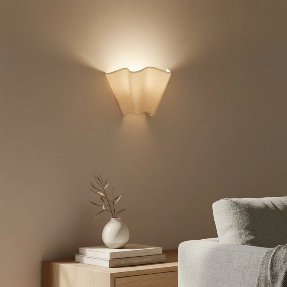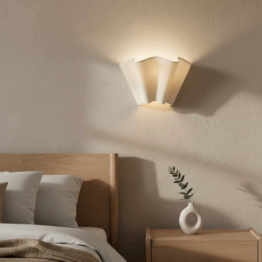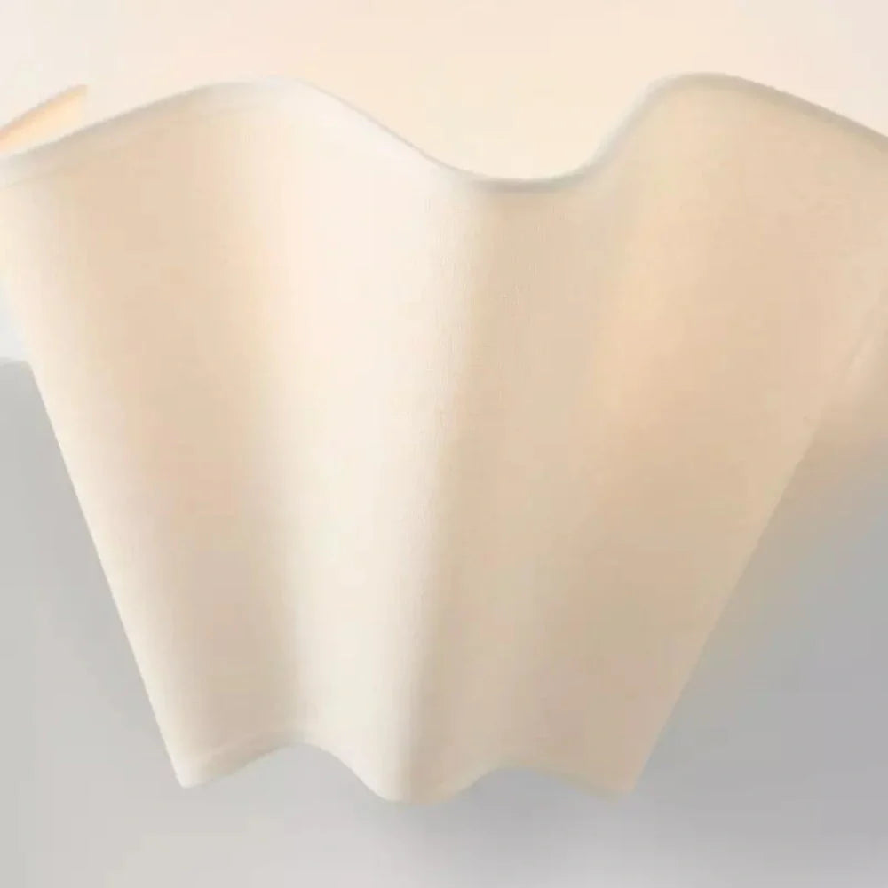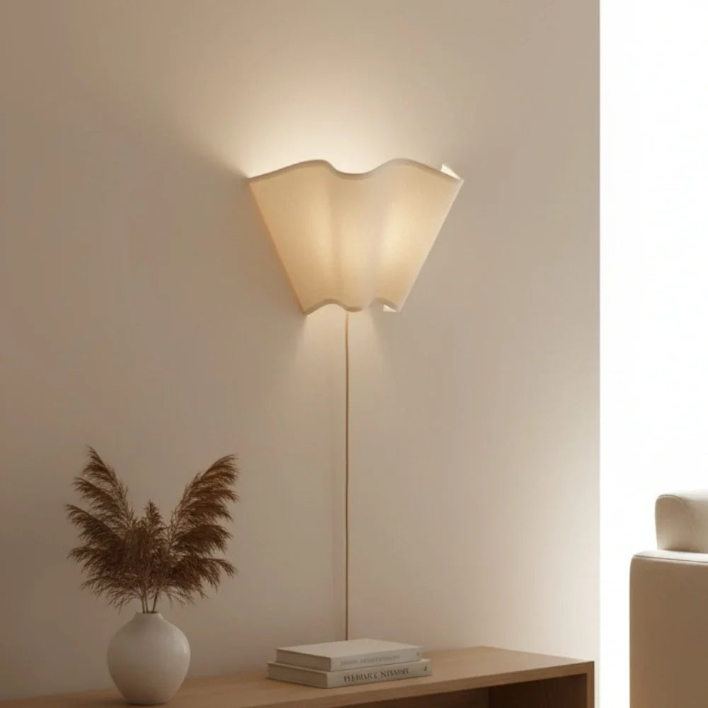 This wall lamp is made of ivory linen in the shape of a flower and is suitable for installation in bedrooms and living rooms.