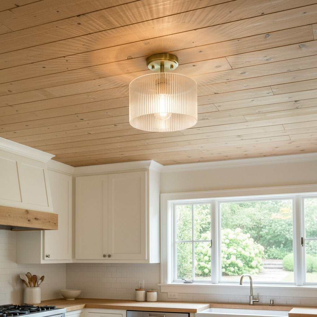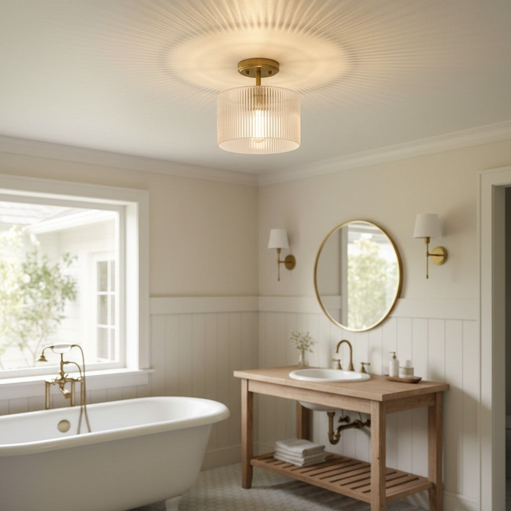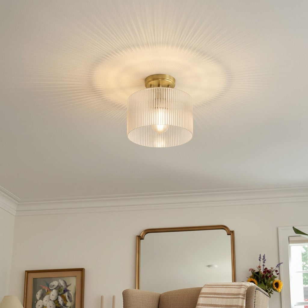 Modern glam semi-flush ceiling light with a matte brass finish. Features an elegant ribbed glass shade. Perfect for any room.