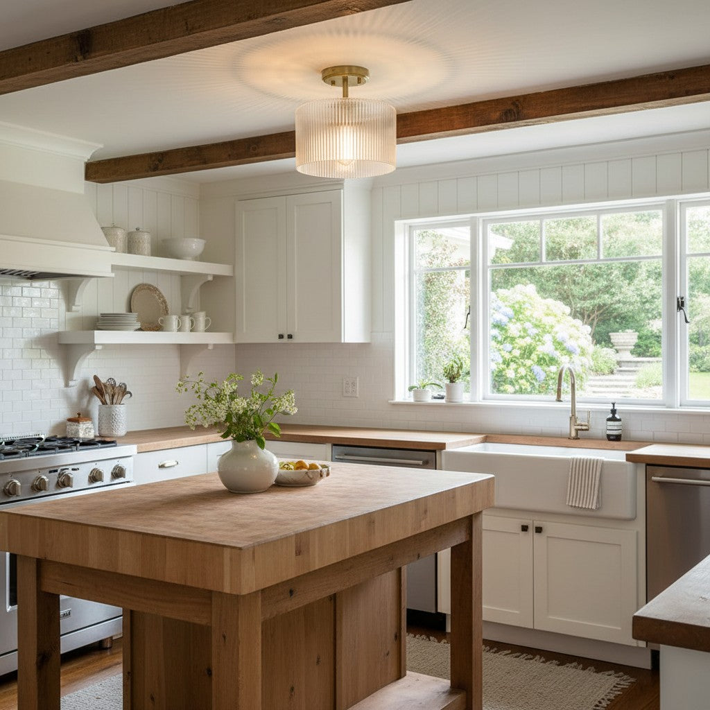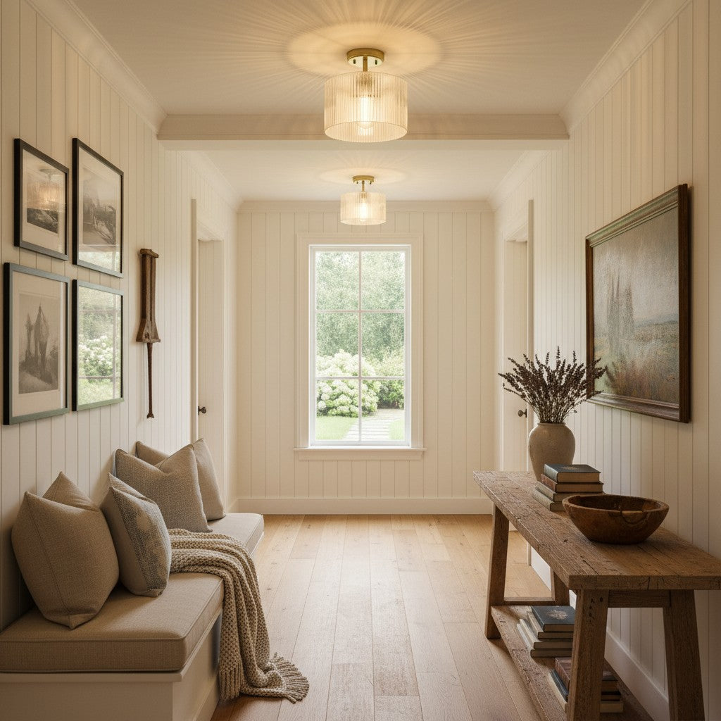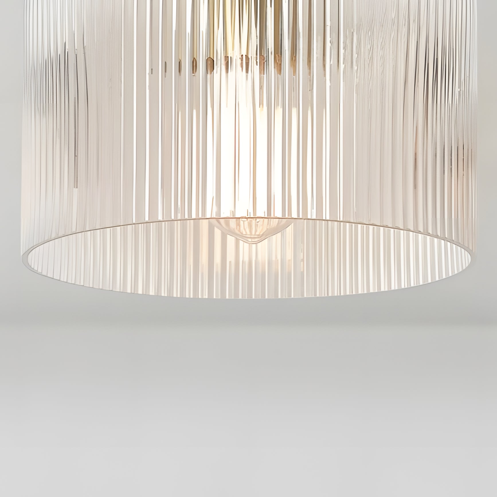 Modern glam semi-flush ceiling light with a matte brass finish. Features an elegant ribbed glass shade. Perfect for any room.
