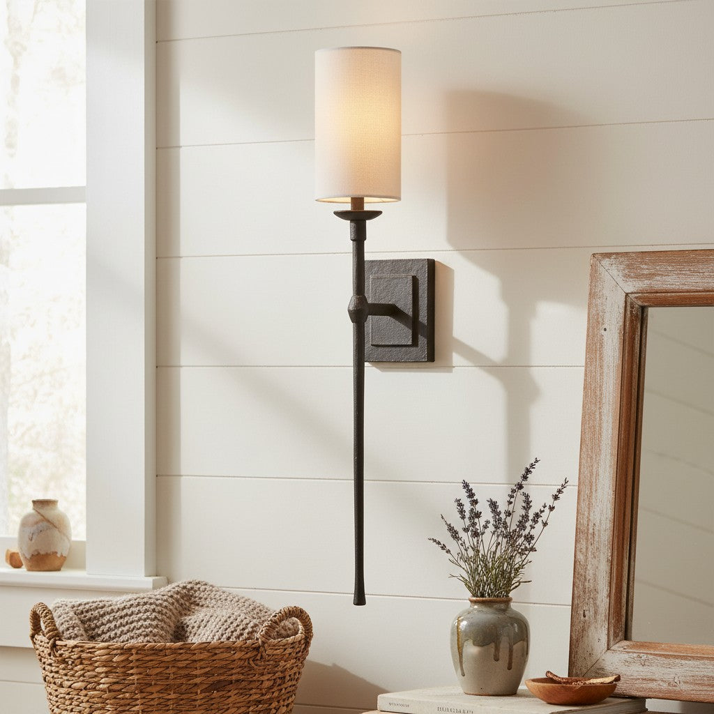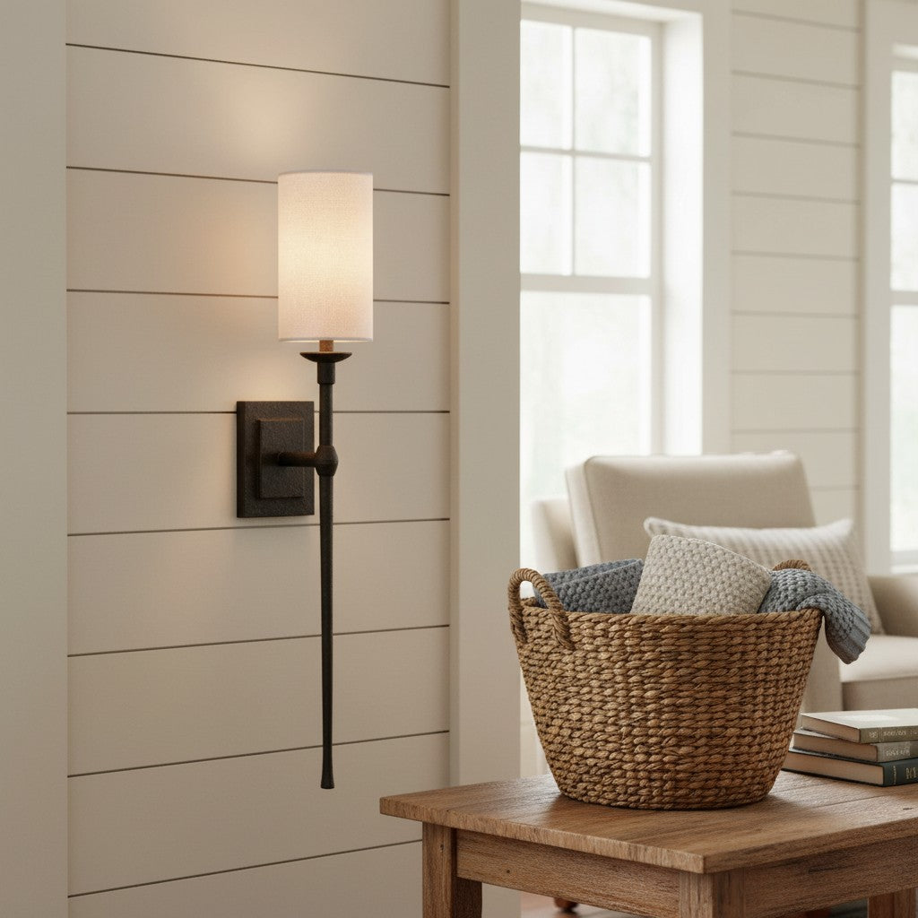 This wall sconce features a slim metal body paired with a soft fabric shade, offering timeless elegance and warm ambient lighting for any space.