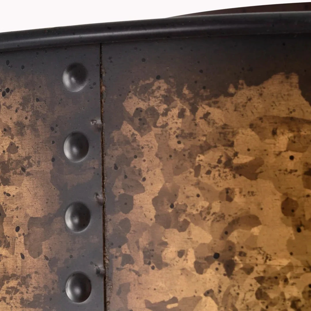 Its drum-shaped design, crafted from weathered brass and oxidized bronze, offers an industrial yet modern aesthetic, perfect for any space you desire.