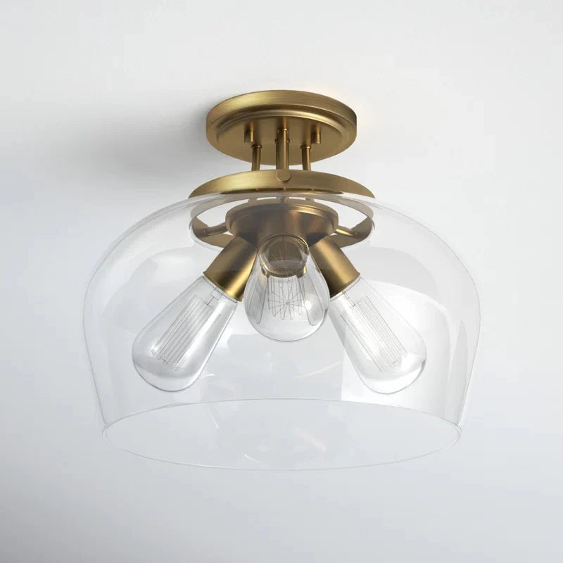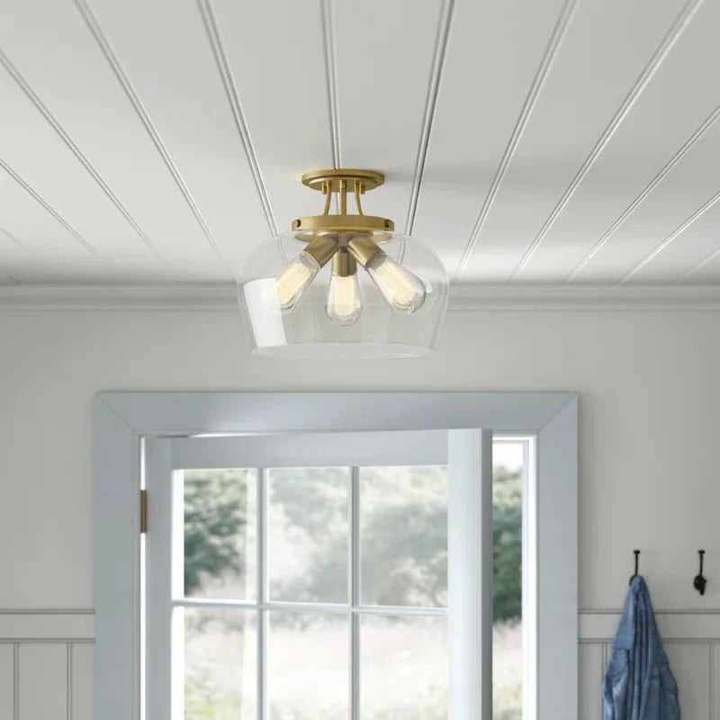 Combining modern farmhouse charm with sleek design, the Tyrus 3-Light Semi-Flush Mount brings rustic elegance to kitchens, hallways, or covered porches. The clear glass shades diffuse warm illumination evenly, while the aged brass-finished base adds vintage character.