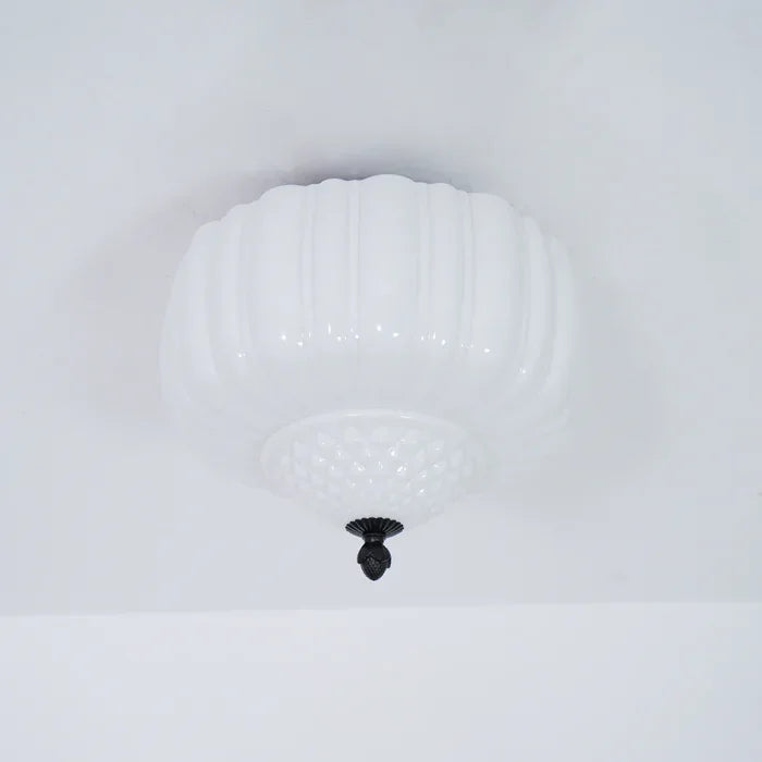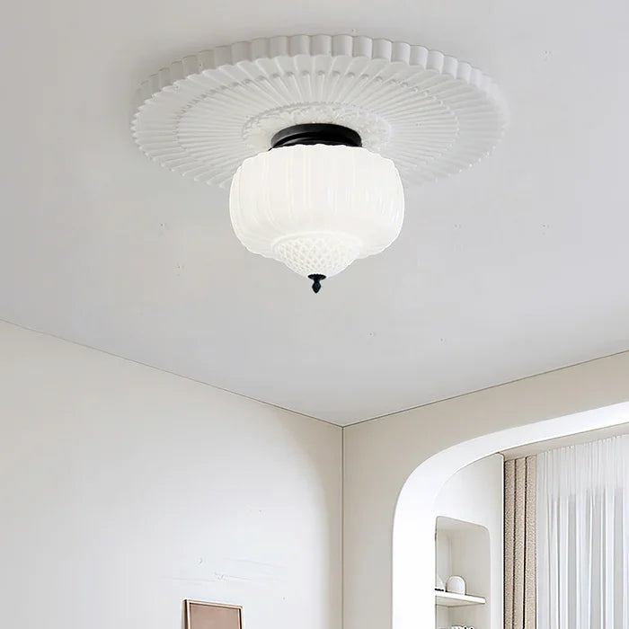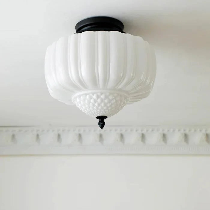 Add a touch of modern elegance to your space with the Giada Ceiling Light. Its white milk glass with a ribbed texture and black metal accents blend seamlessly for a classic yet contemporary look. Perfect for bedrooms, hallways, and living areas.