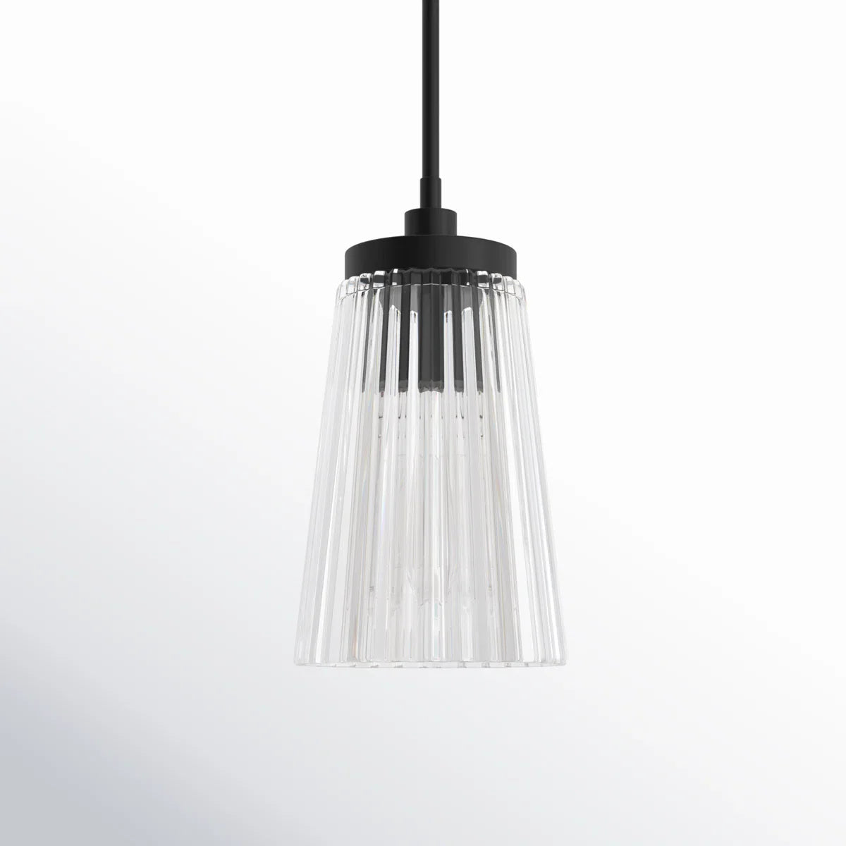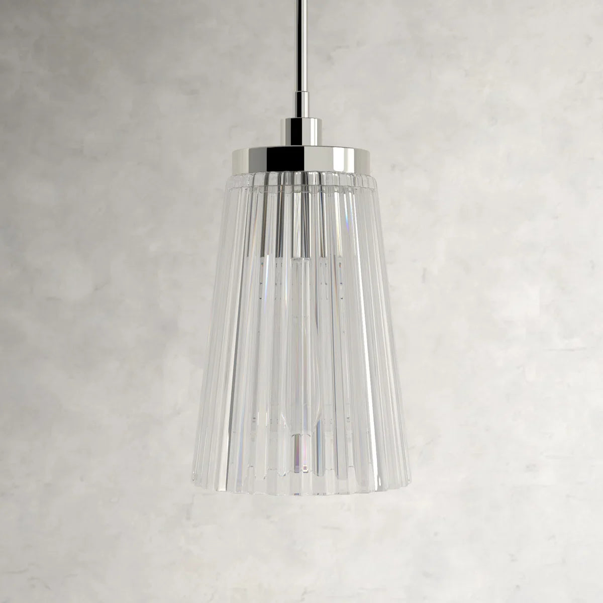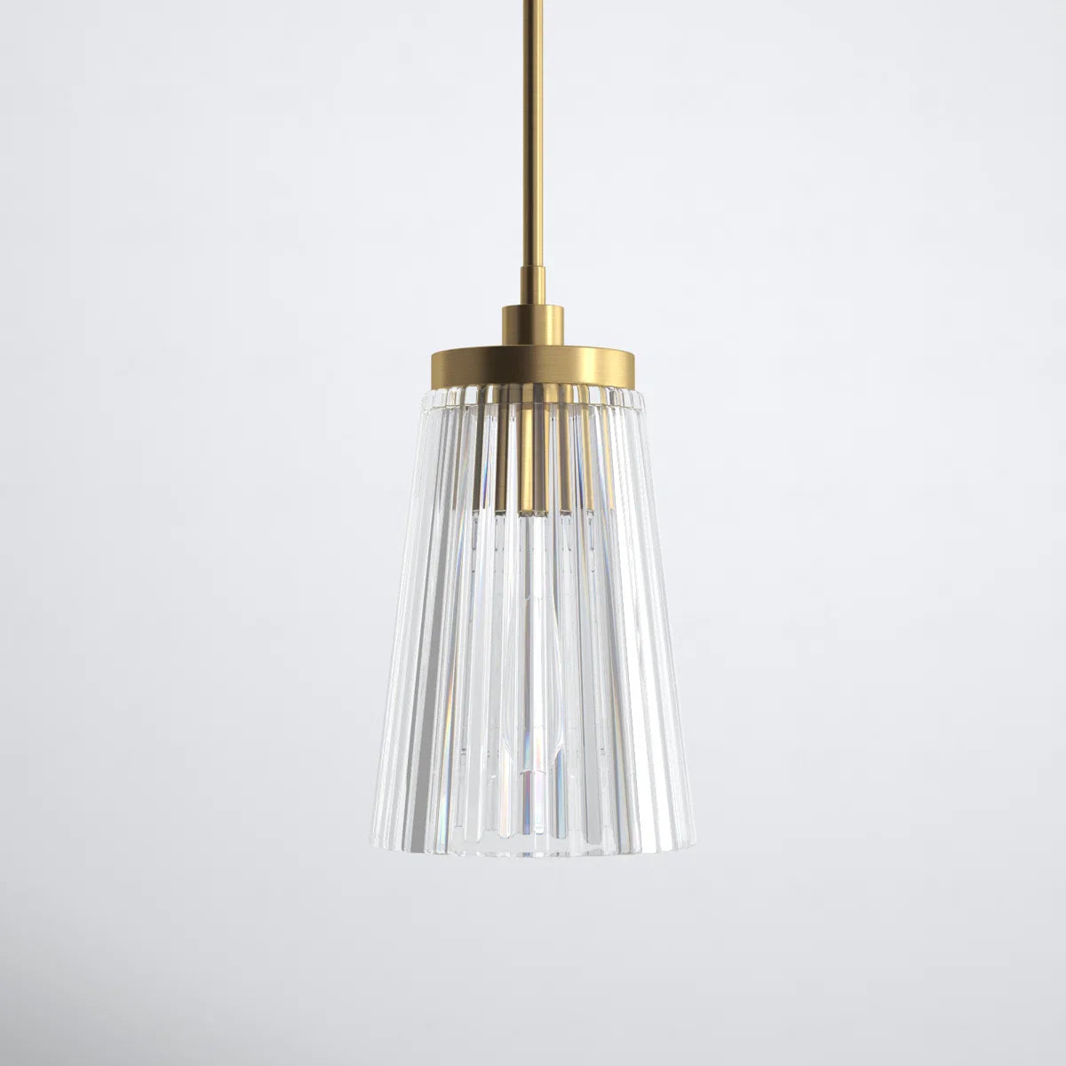 The Hypnos Pendant Light features a textured clear ribbed glass shade that catches the eye. Offered in Brass, Matte Black, and Nickel finishes, it brings distinctive character to kitchens, dining rooms, and living areas.