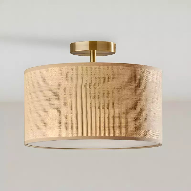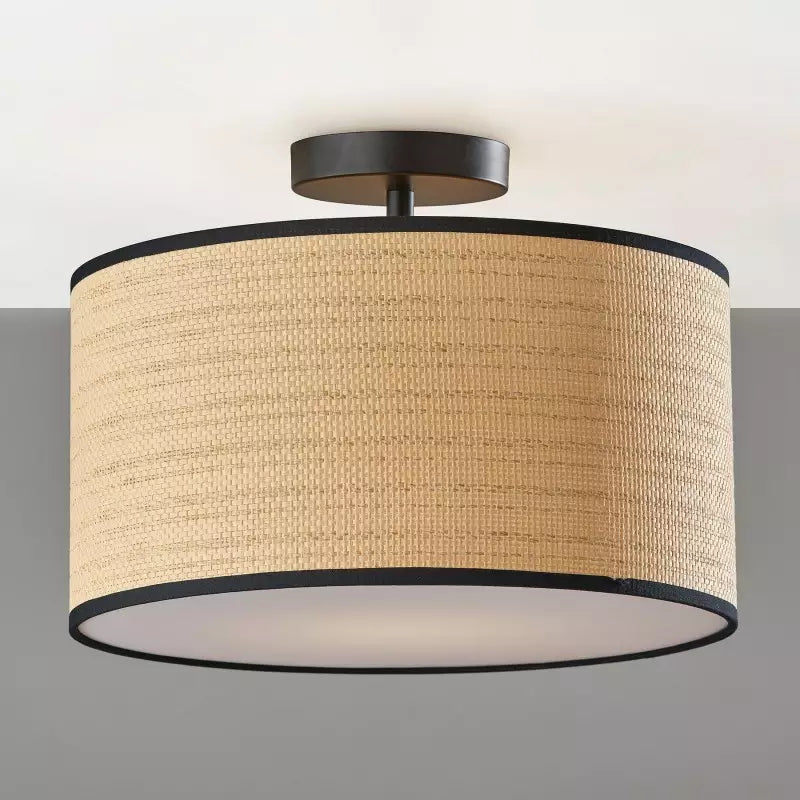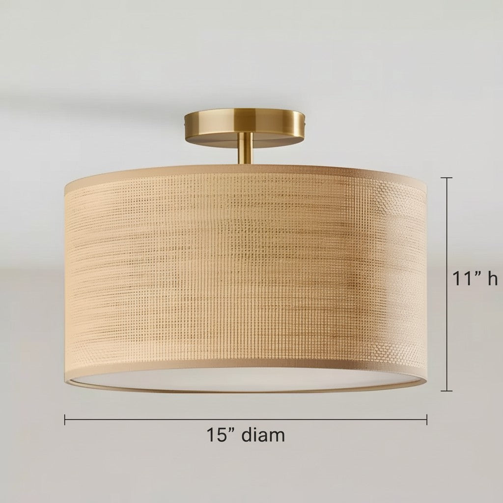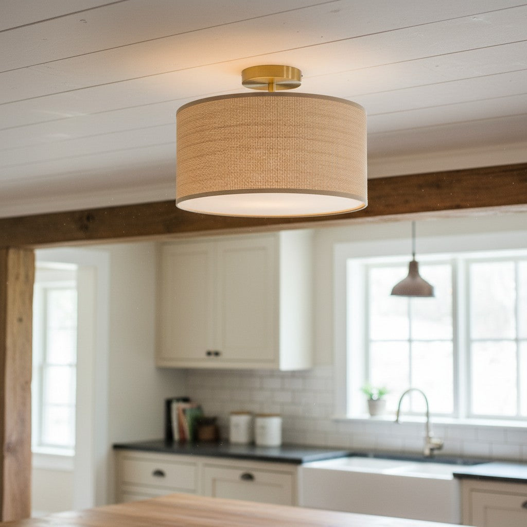 Enhance a living space or dining nook with the texture and warmth of this modern coastal flush mount ceiling light. A natural woven drum shade brings depth and organic character, complemented by a refined metal finish for a contemporary touch. A soft fabric diffuser gently filters the light, creating a warm and comfortable glow well suited for casual, coastal, or relaxed modern interiors.