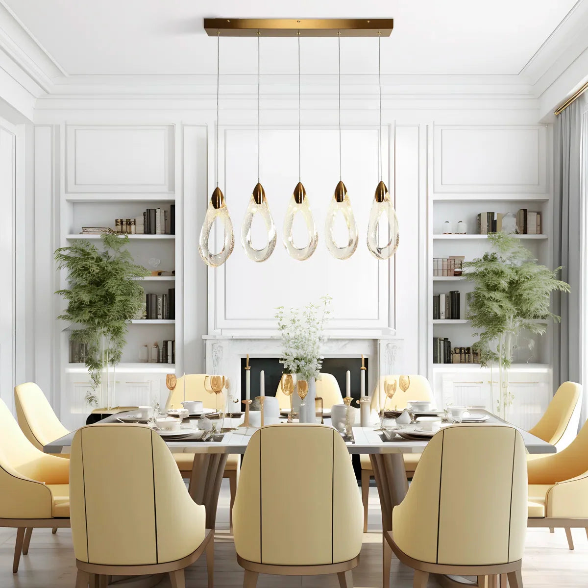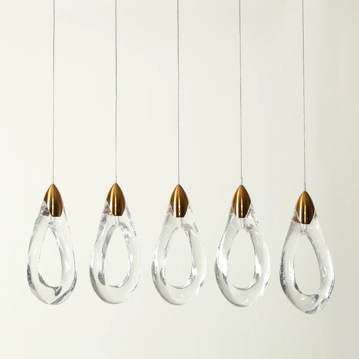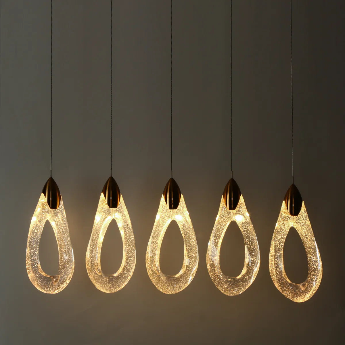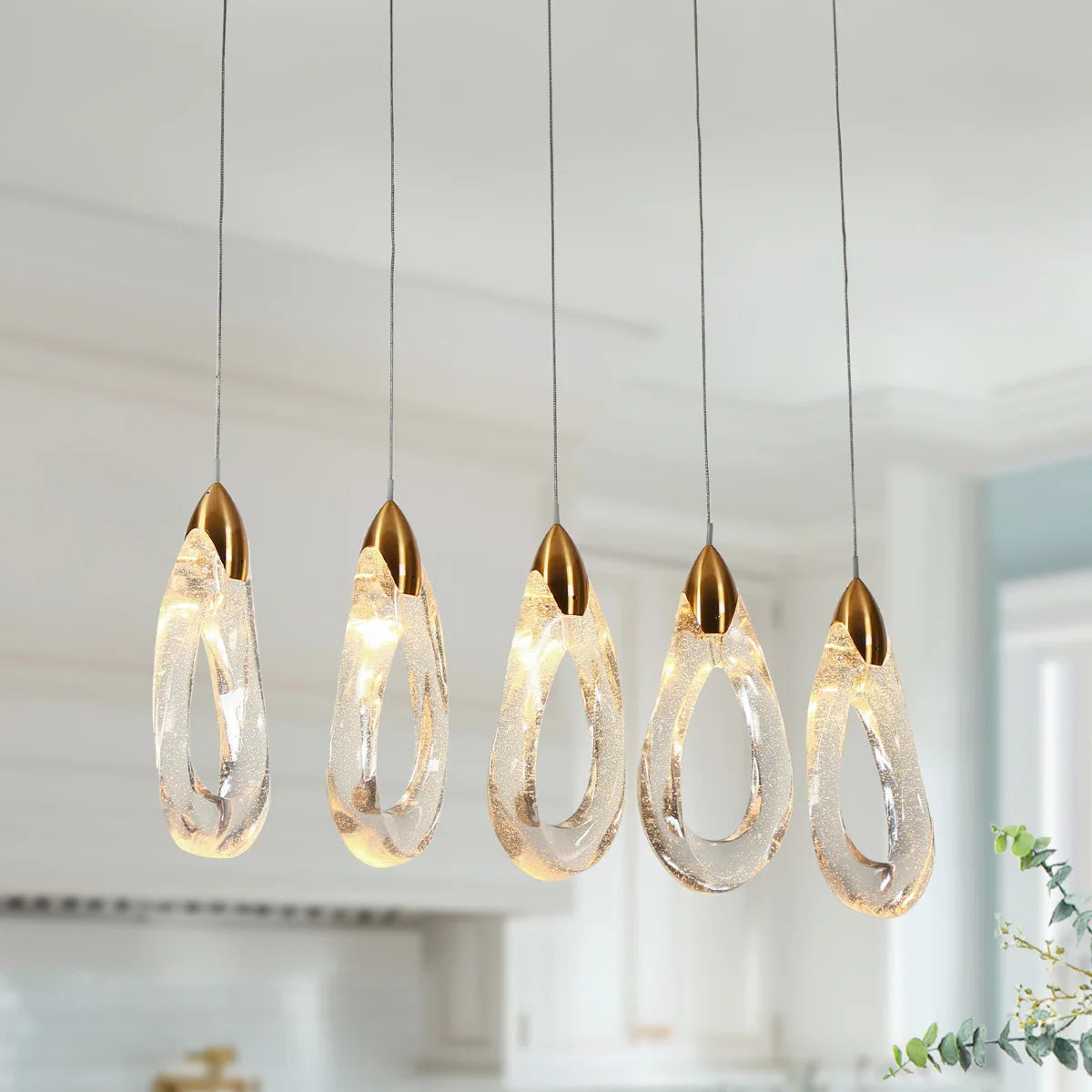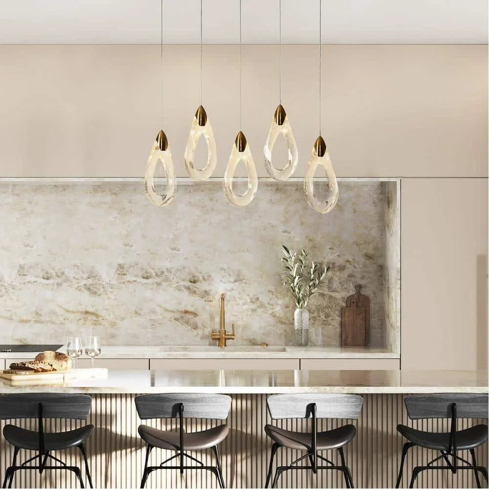 The Eirik Modern Resin LED Pendant Light blends contemporary elegance with sculptural artistry. Featuring 5 transparent resin rings in irregular hollow shapes and a faux brass finish, it evokes dewdrops and offers a warm ambient glow, ideal for dining rooms, bedrooms or kitchens.