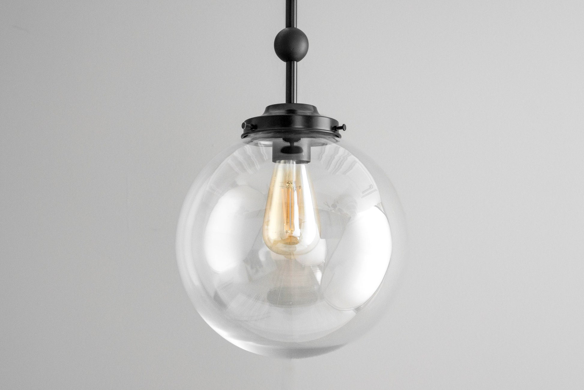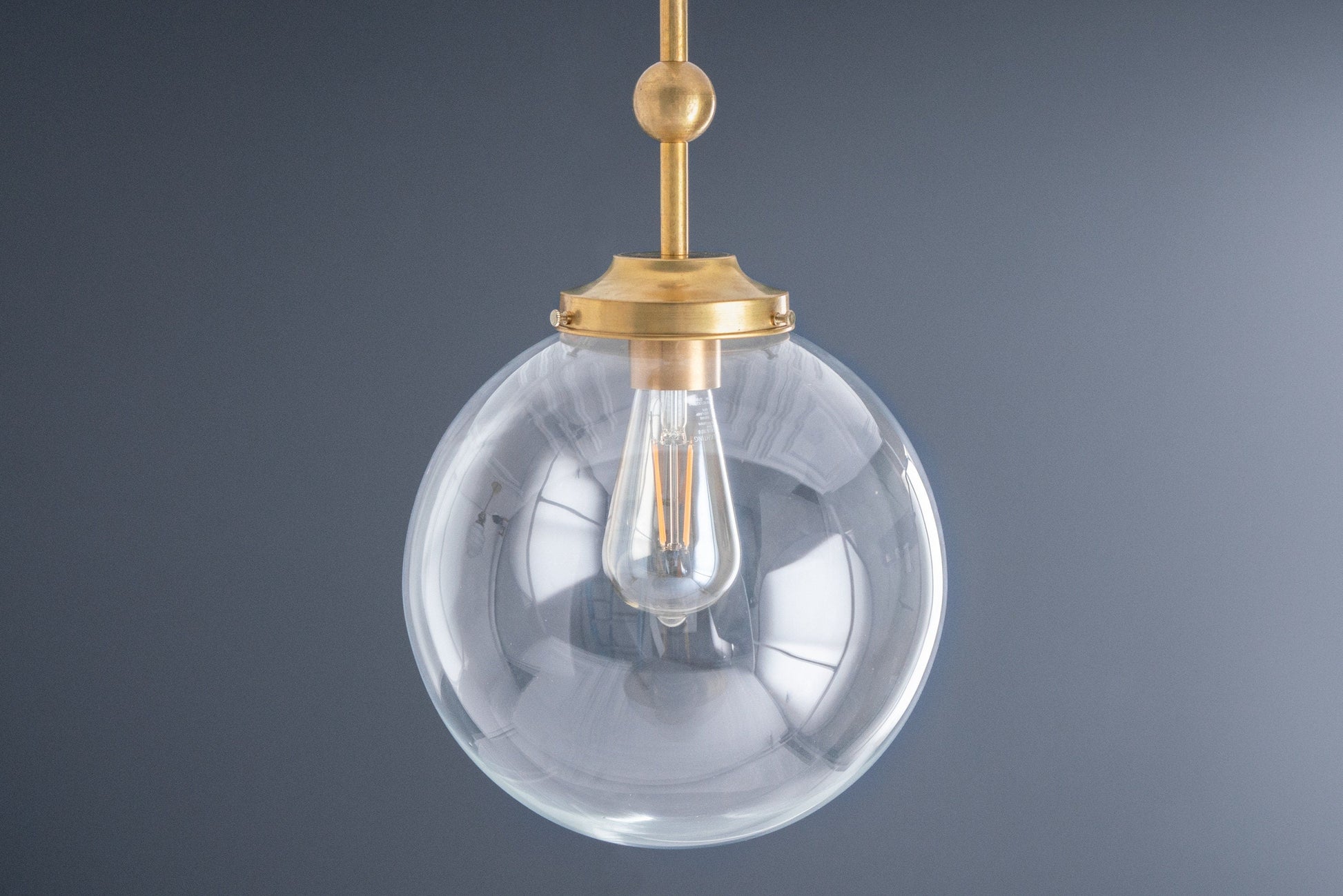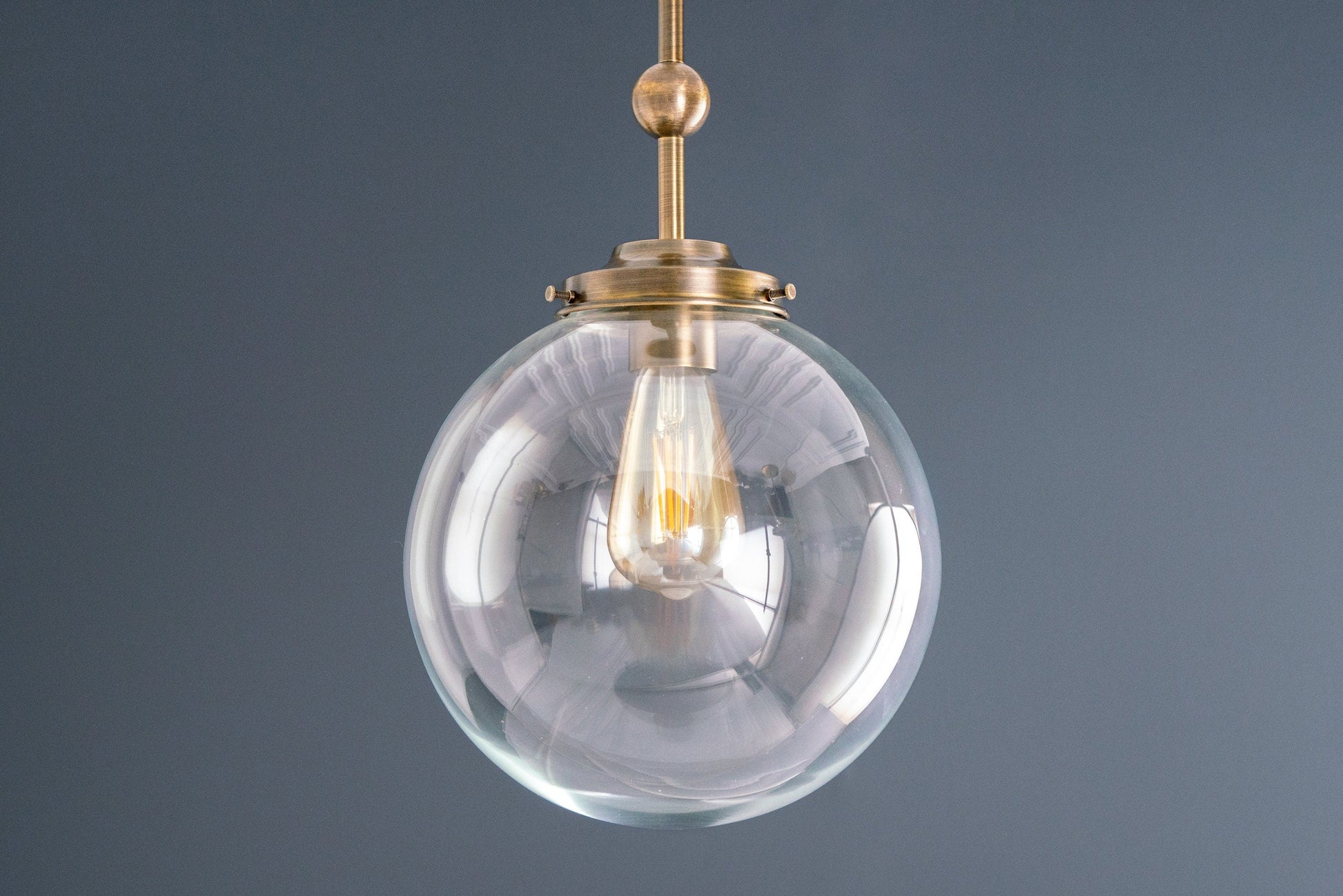 This Art Deco inspired pendant light fixture features a solid brass decorative ball followed by a 10inch handblown clear glass globe.