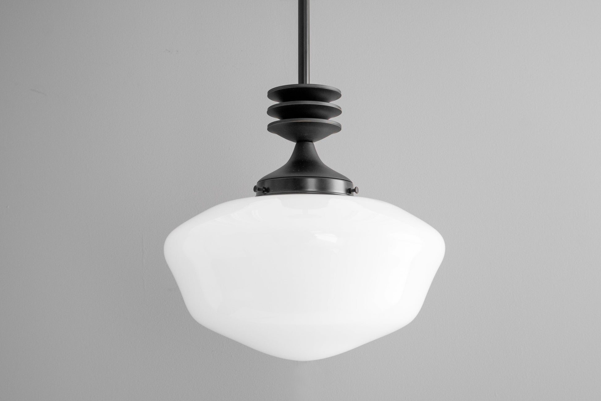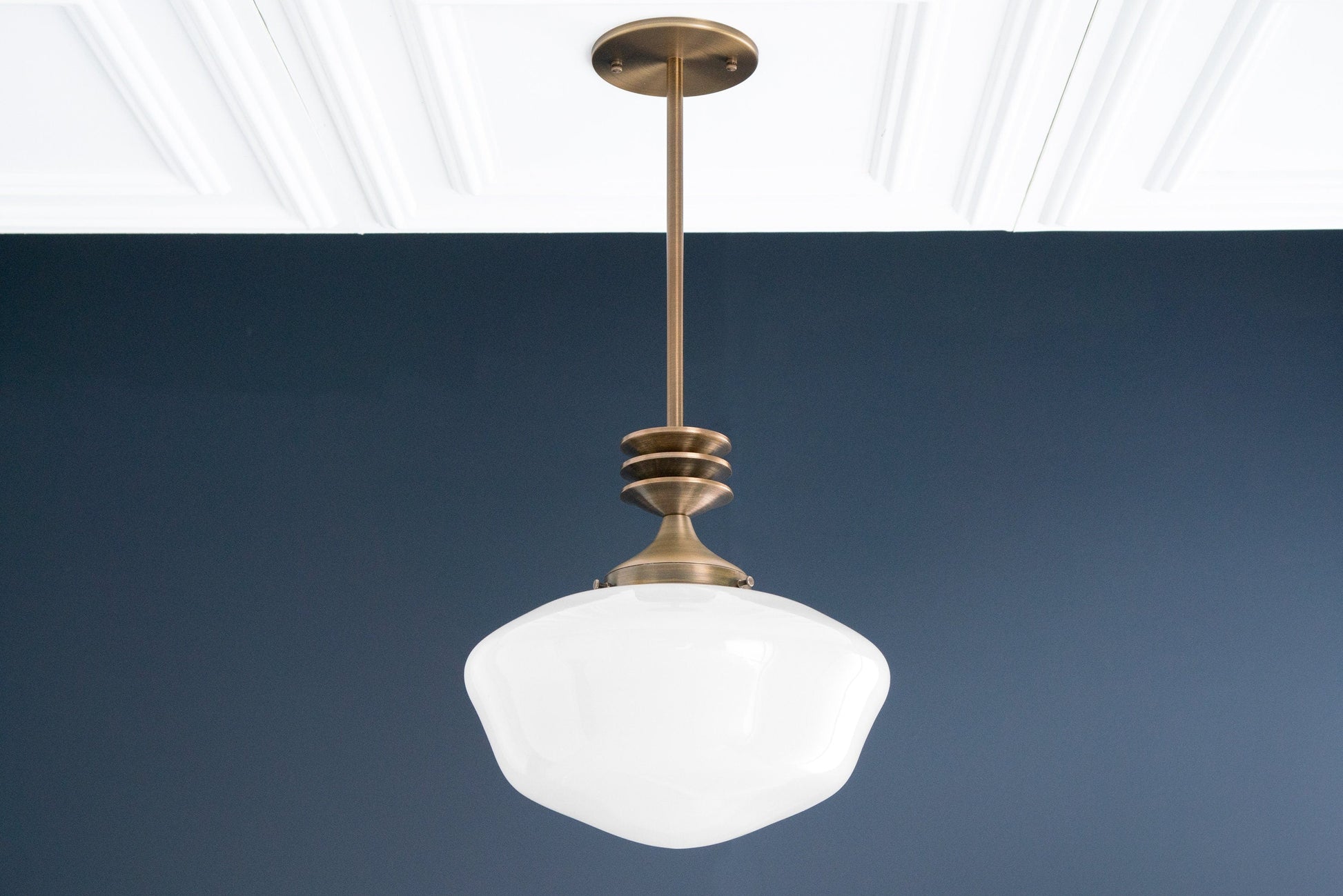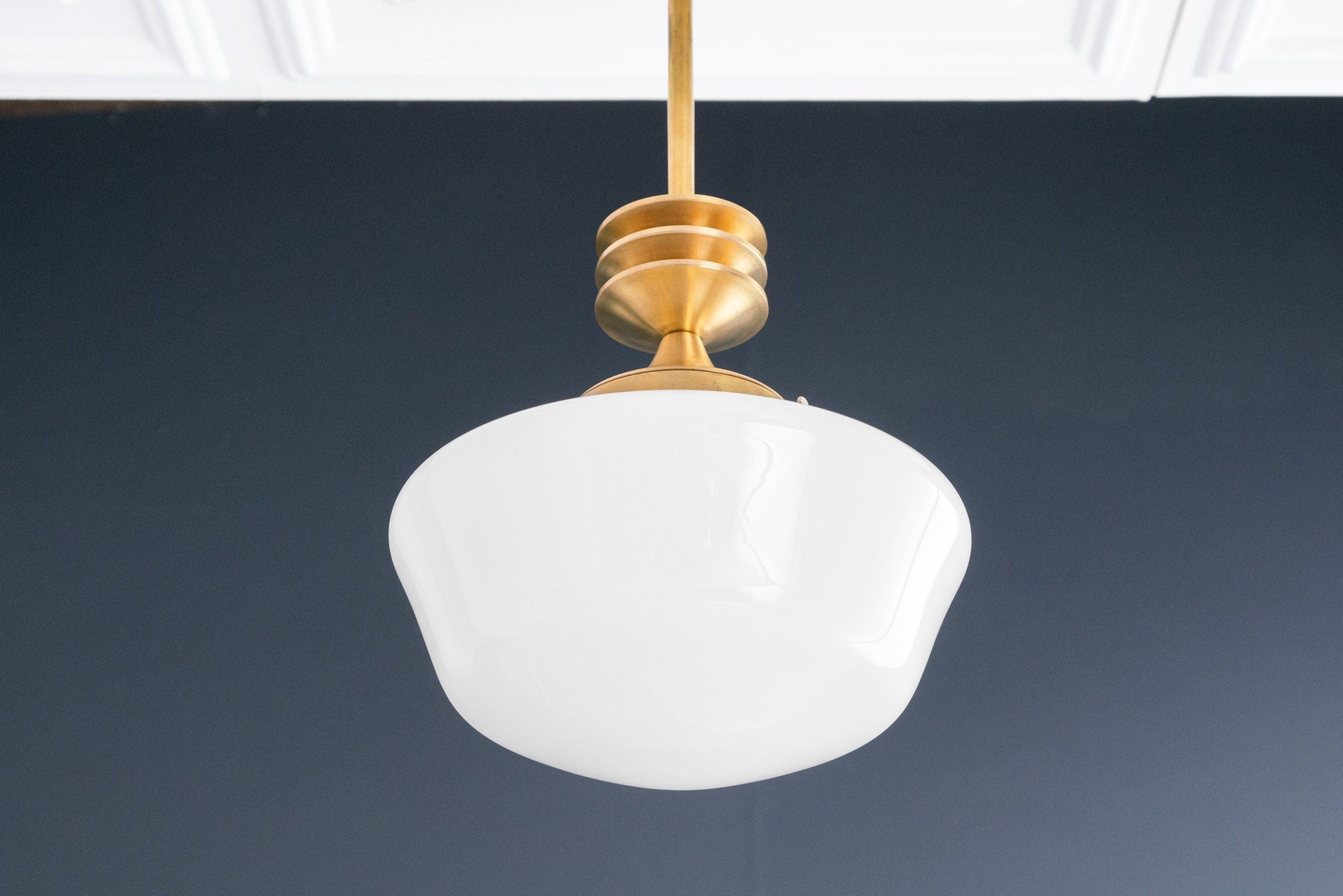 This Art Deco pendant light fixture features a unique brass embellishment and a 12" white opal milk glass schoolhouse style globe. This thick glass globe was hand blown in an American glass foundry.