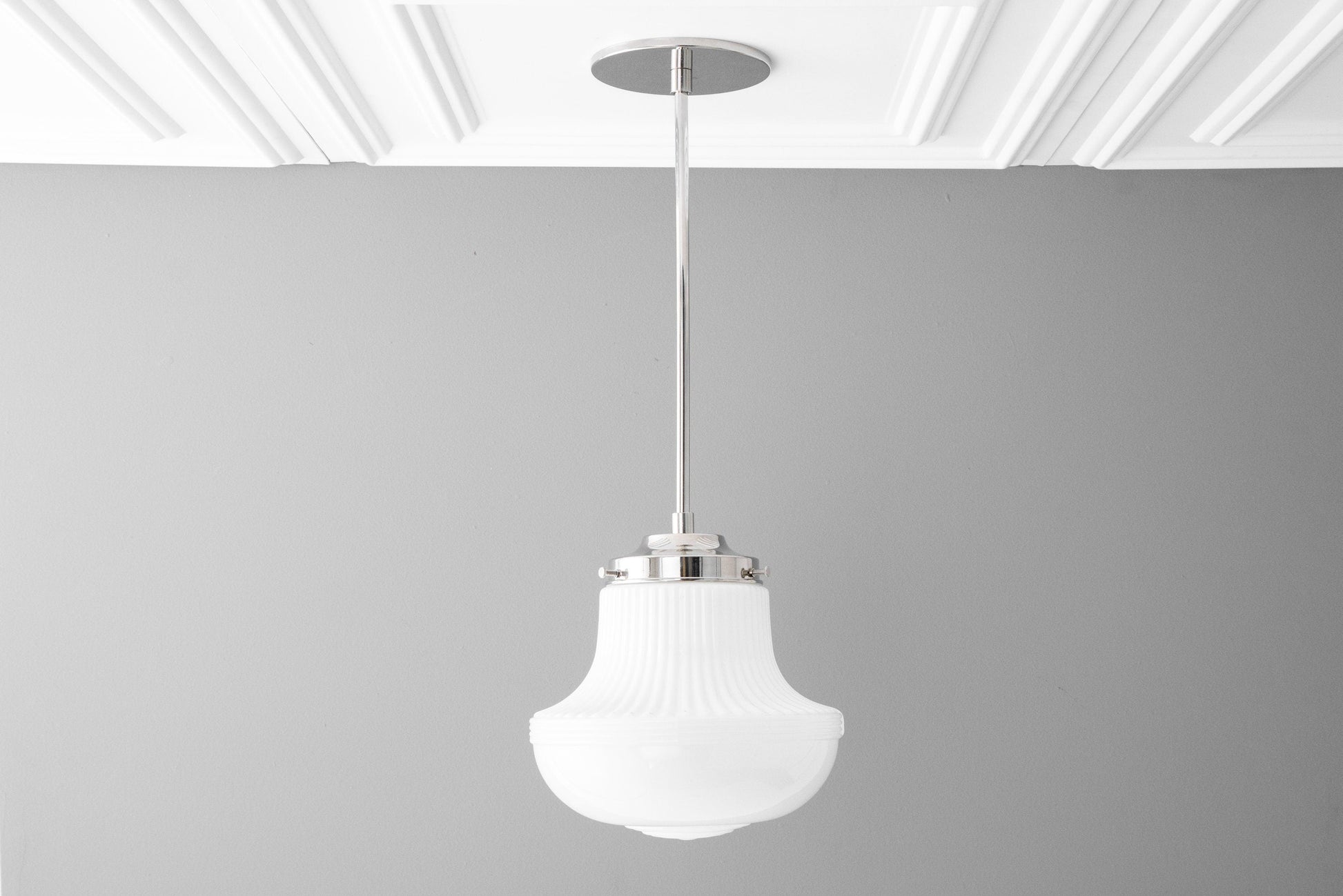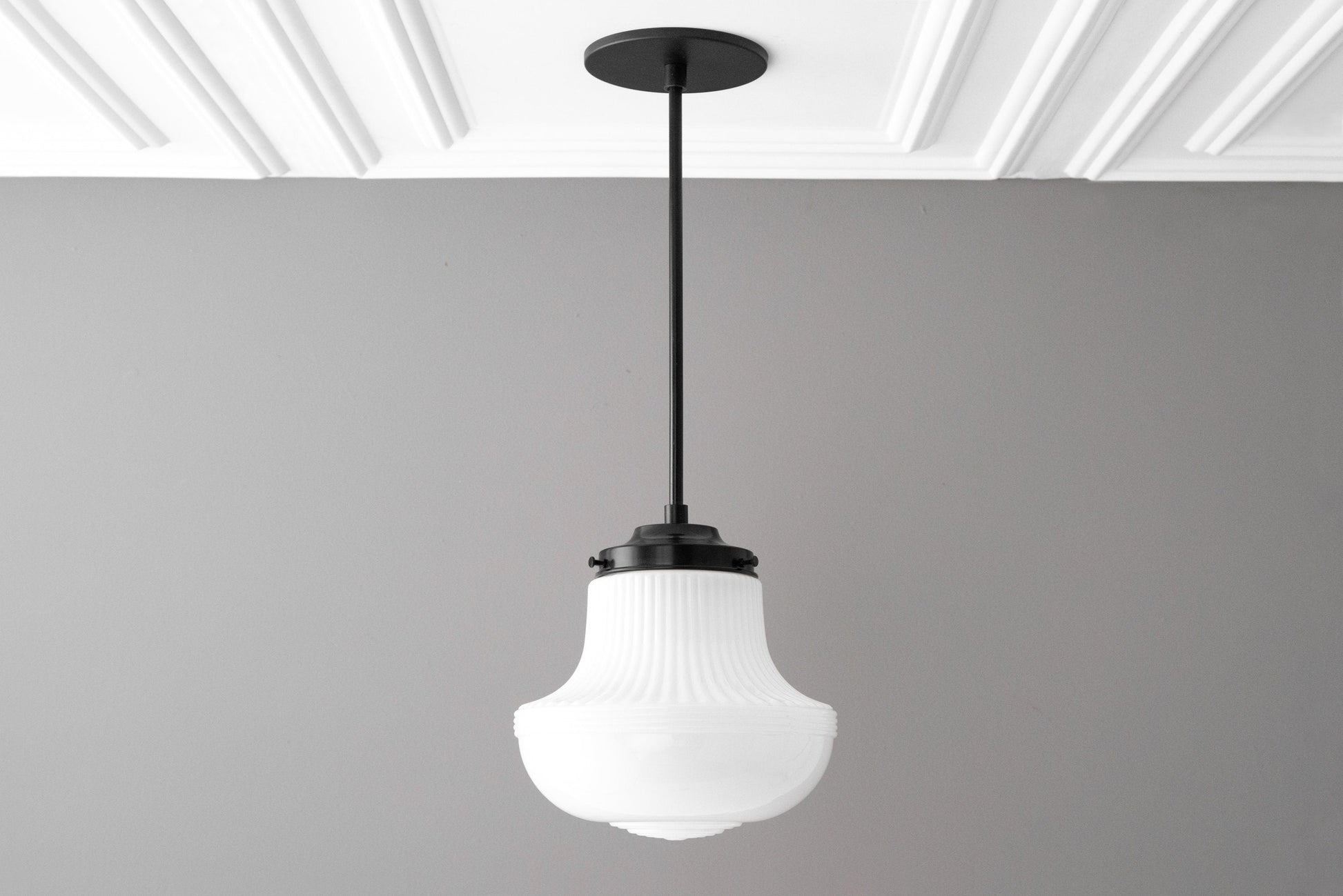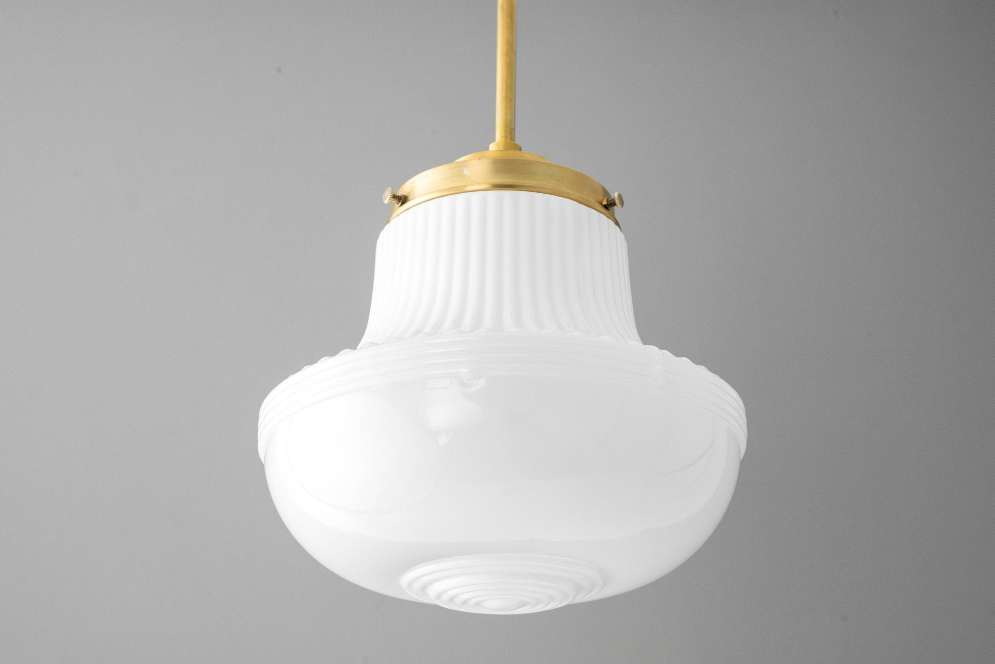 This Art Deco pendant light fixture features a white opal milk glass ribbed scalloped globe. This thick glass globe was hand in an American Glass foundry.