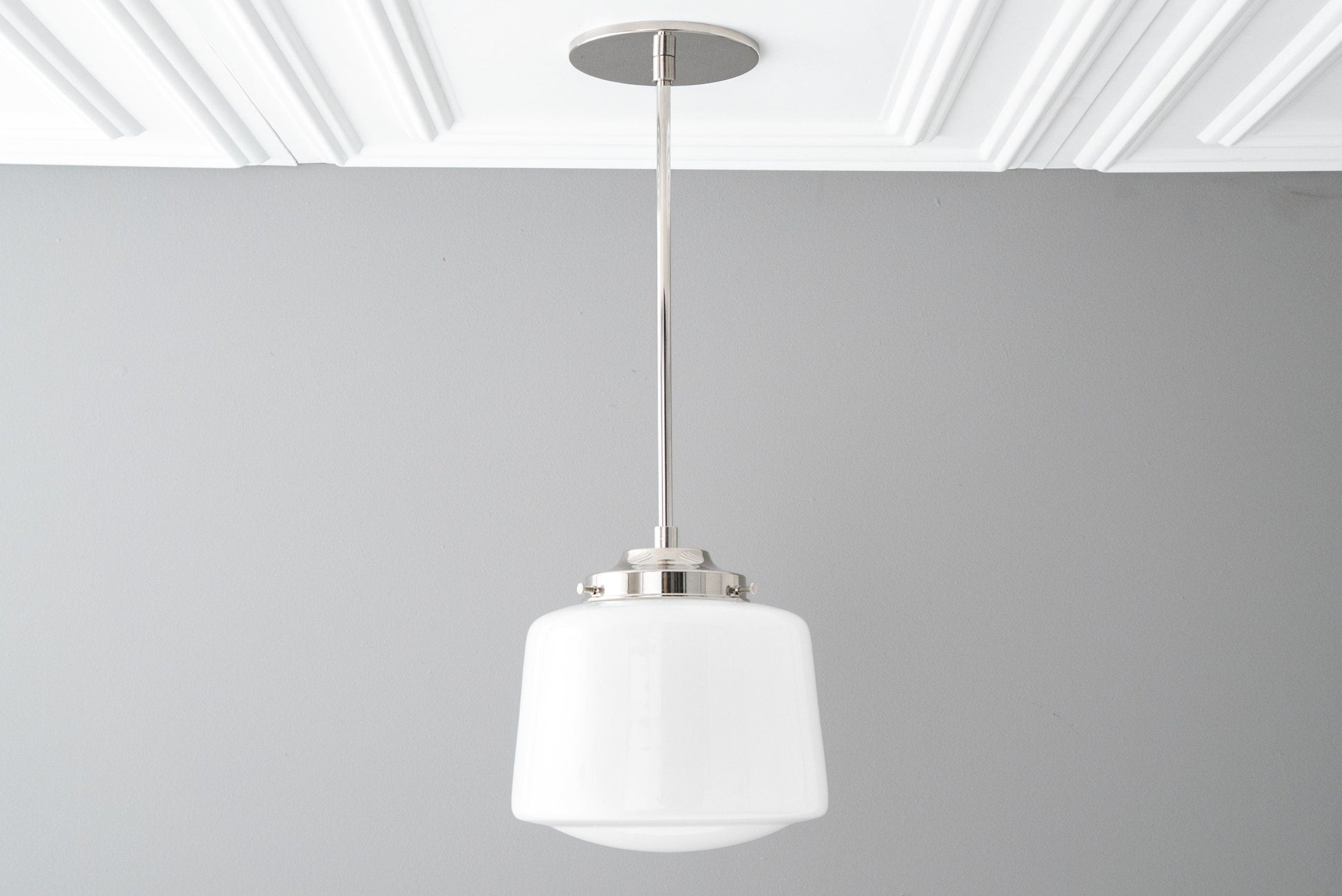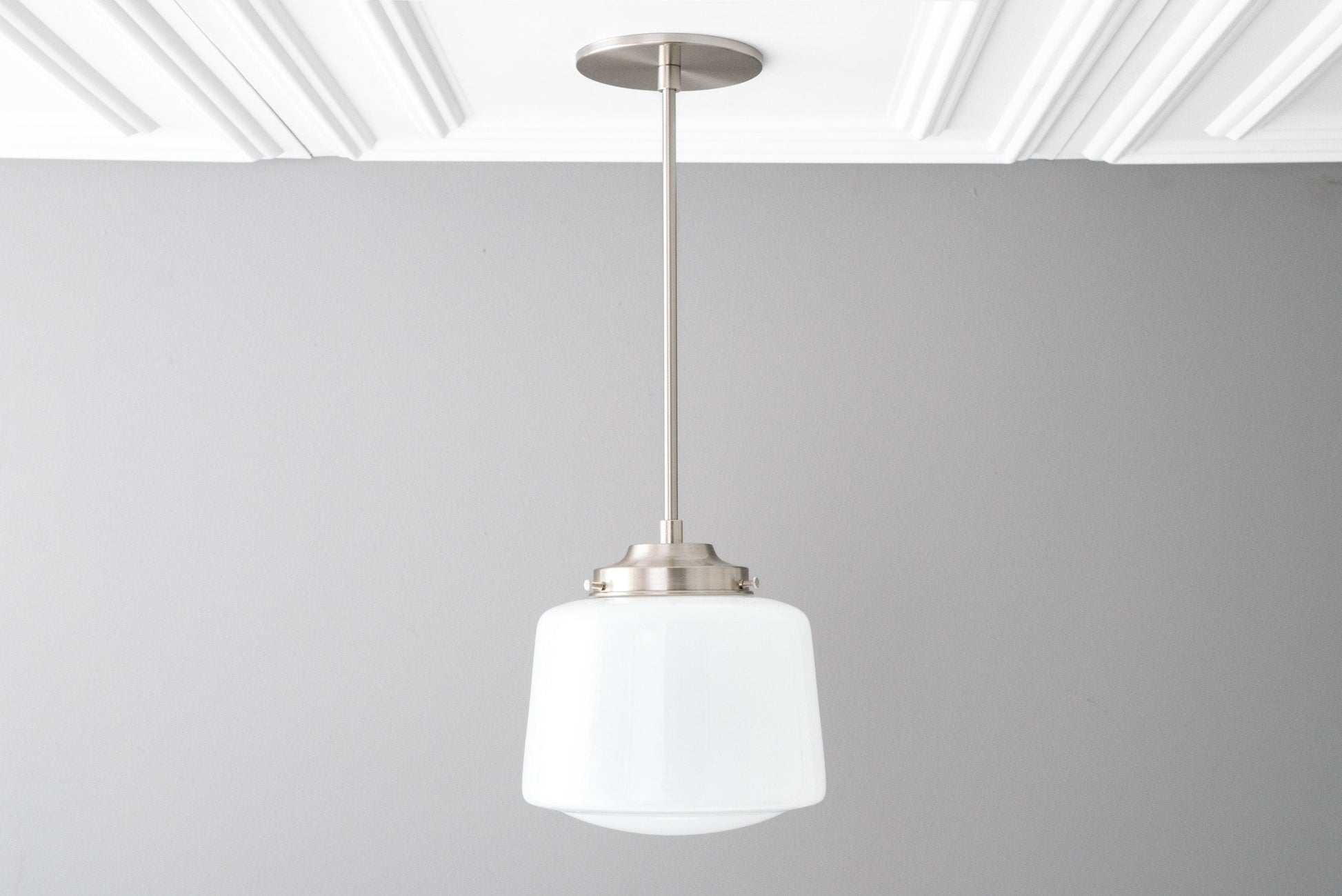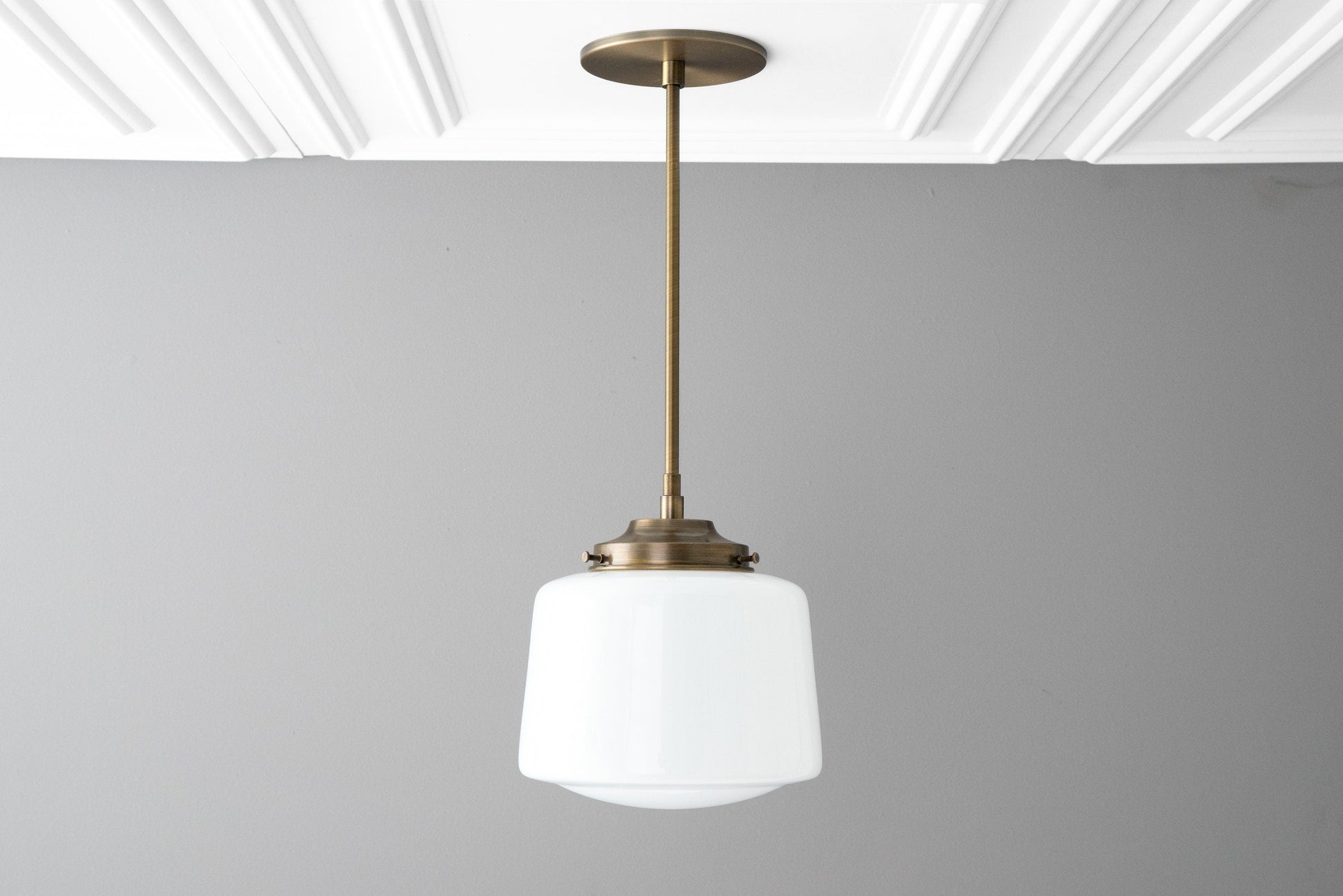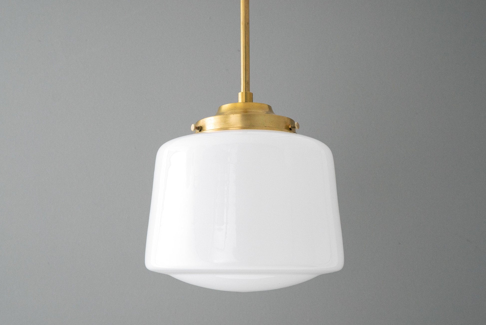 This pendant light fixture features a low profile canopy and an 8inch white opal milk glass Schoolhouse style drum globe. This thick glass globe was handblown in an American glass foundry using traditional techniques.