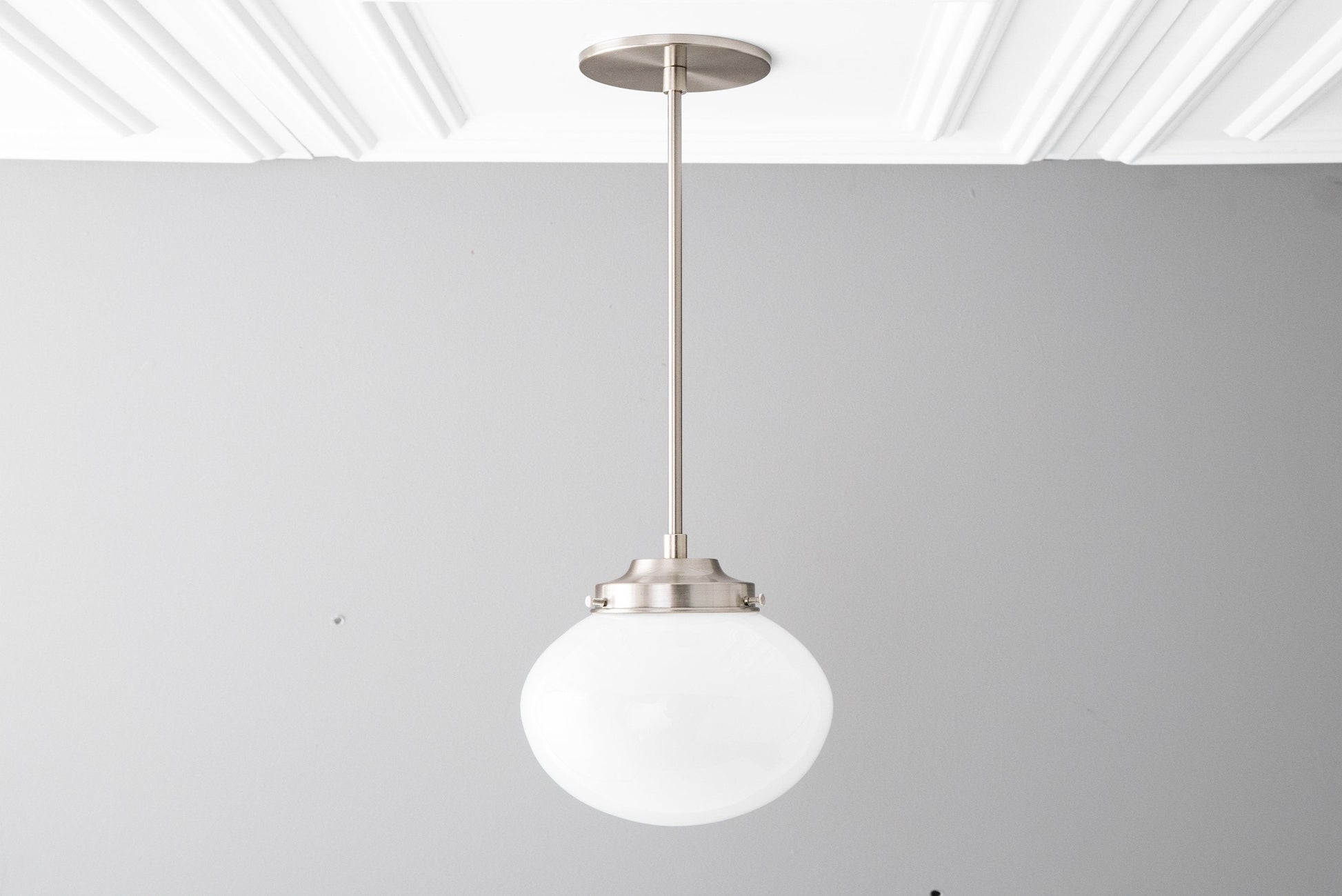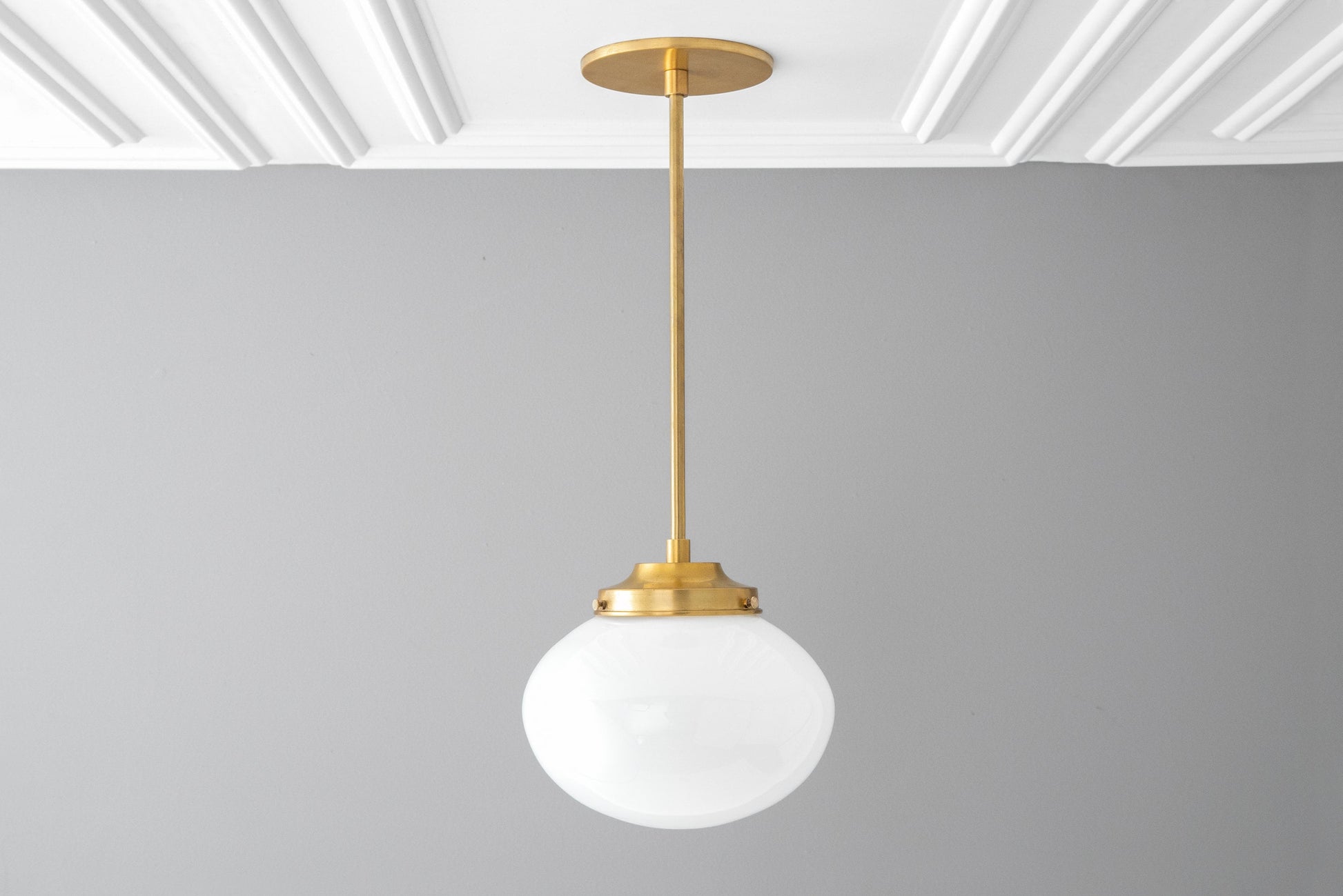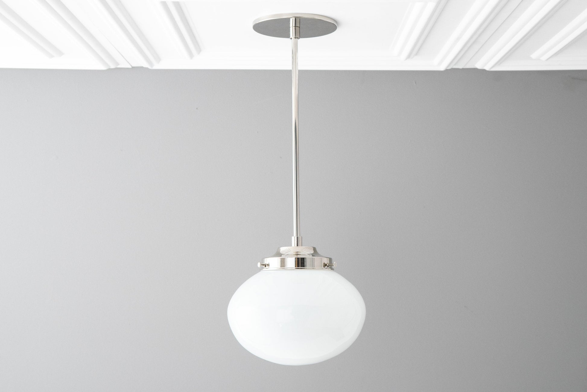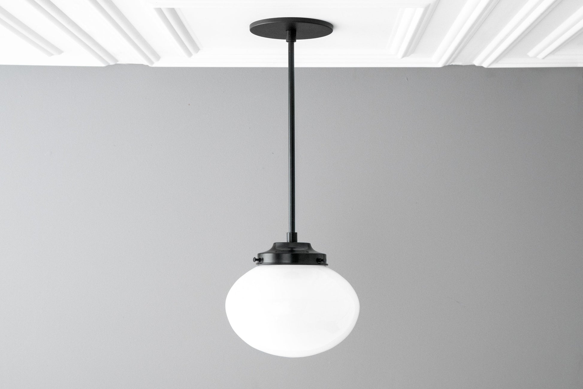 This Art Deco pendant light fixture features an 8" white opal milk glass oval shaped globe. This unique squat globe was handblown in an American glass foundry using traditional glassblowing techniques.