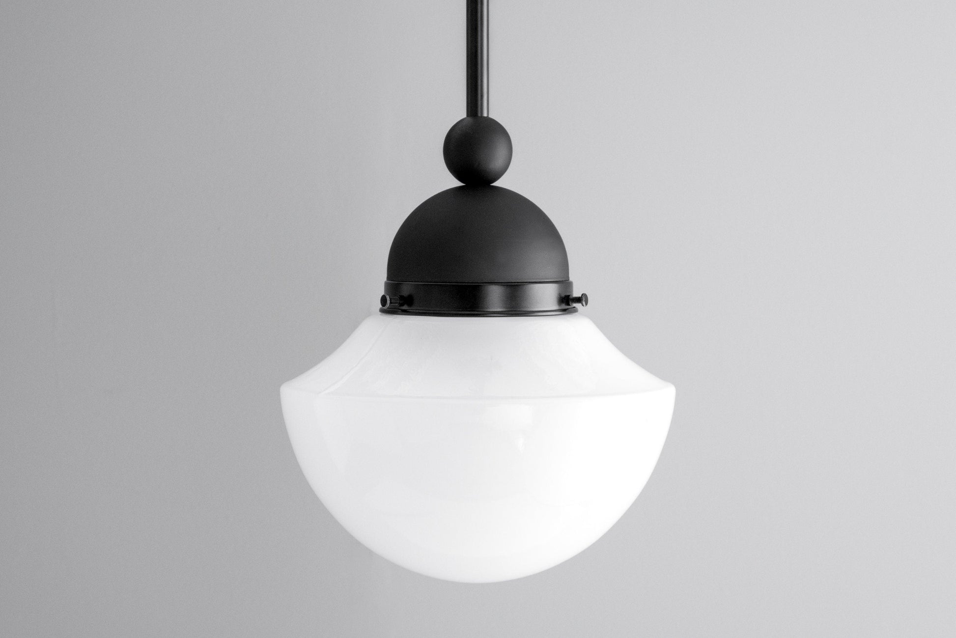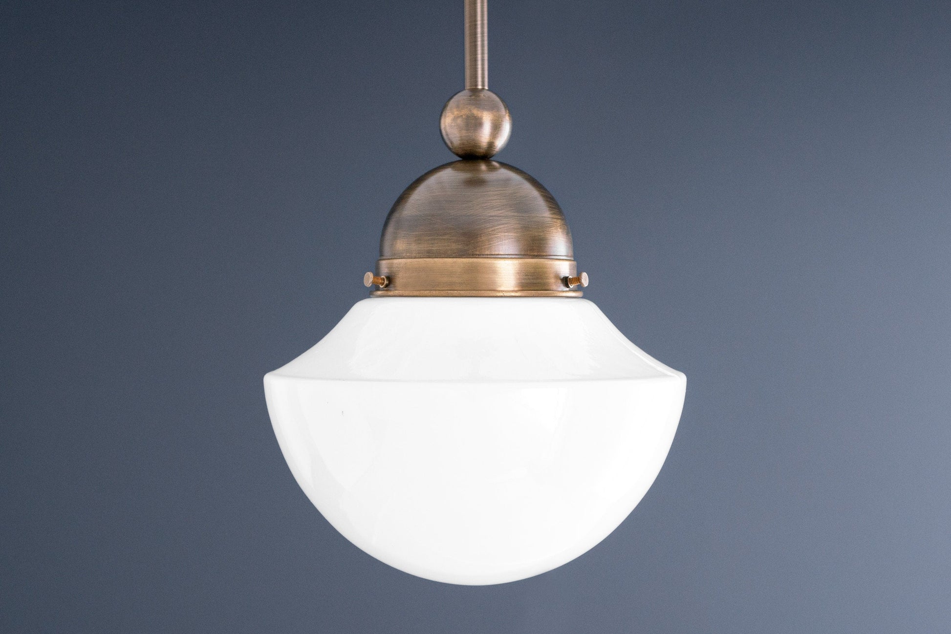 This Art Deco pendant light fixture features a unique dome design, a solid brass decorative ball, and a thick white opal milk glass dropping half ball style globe. This globe was handblown in an American glass foundry using traditional techniques.