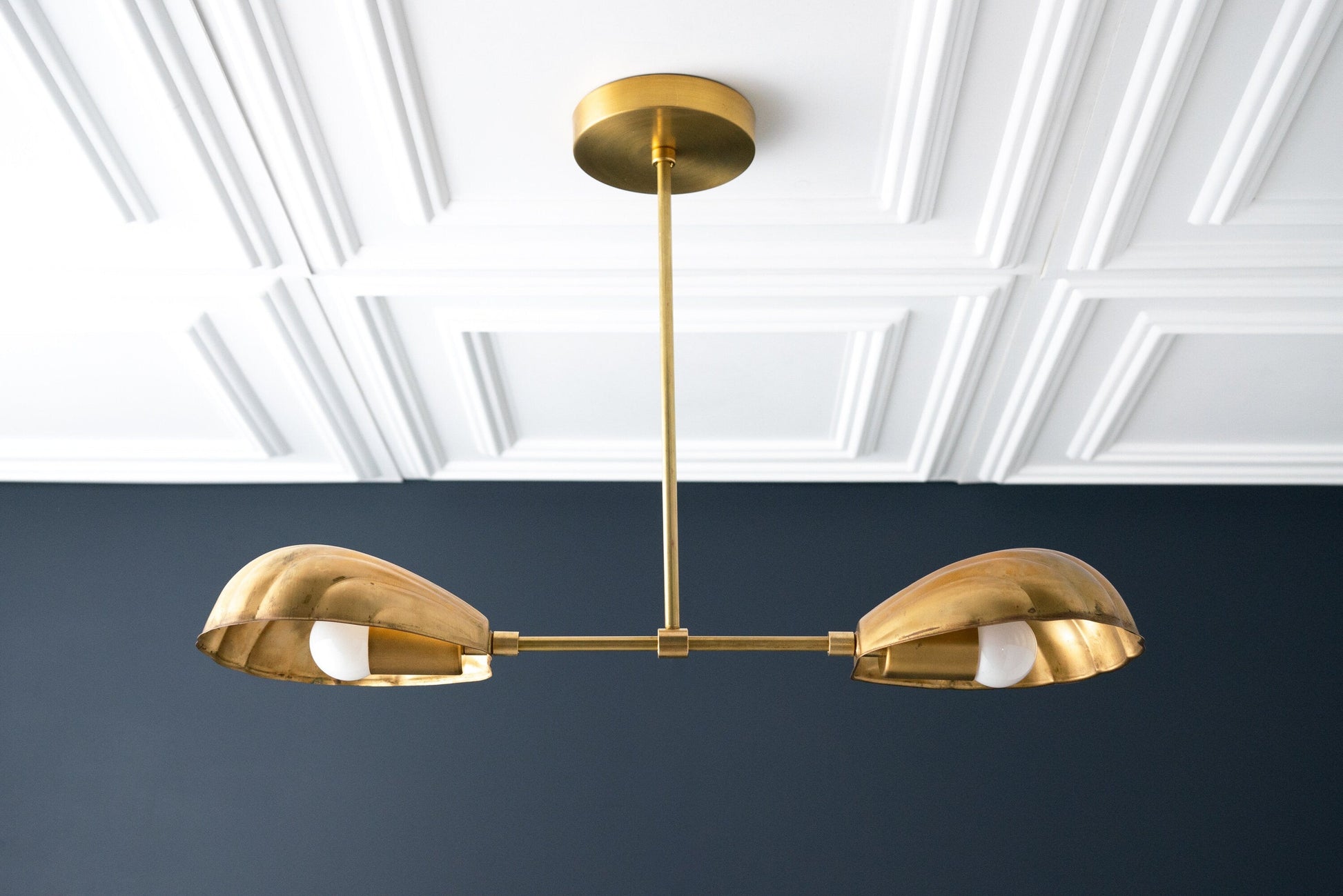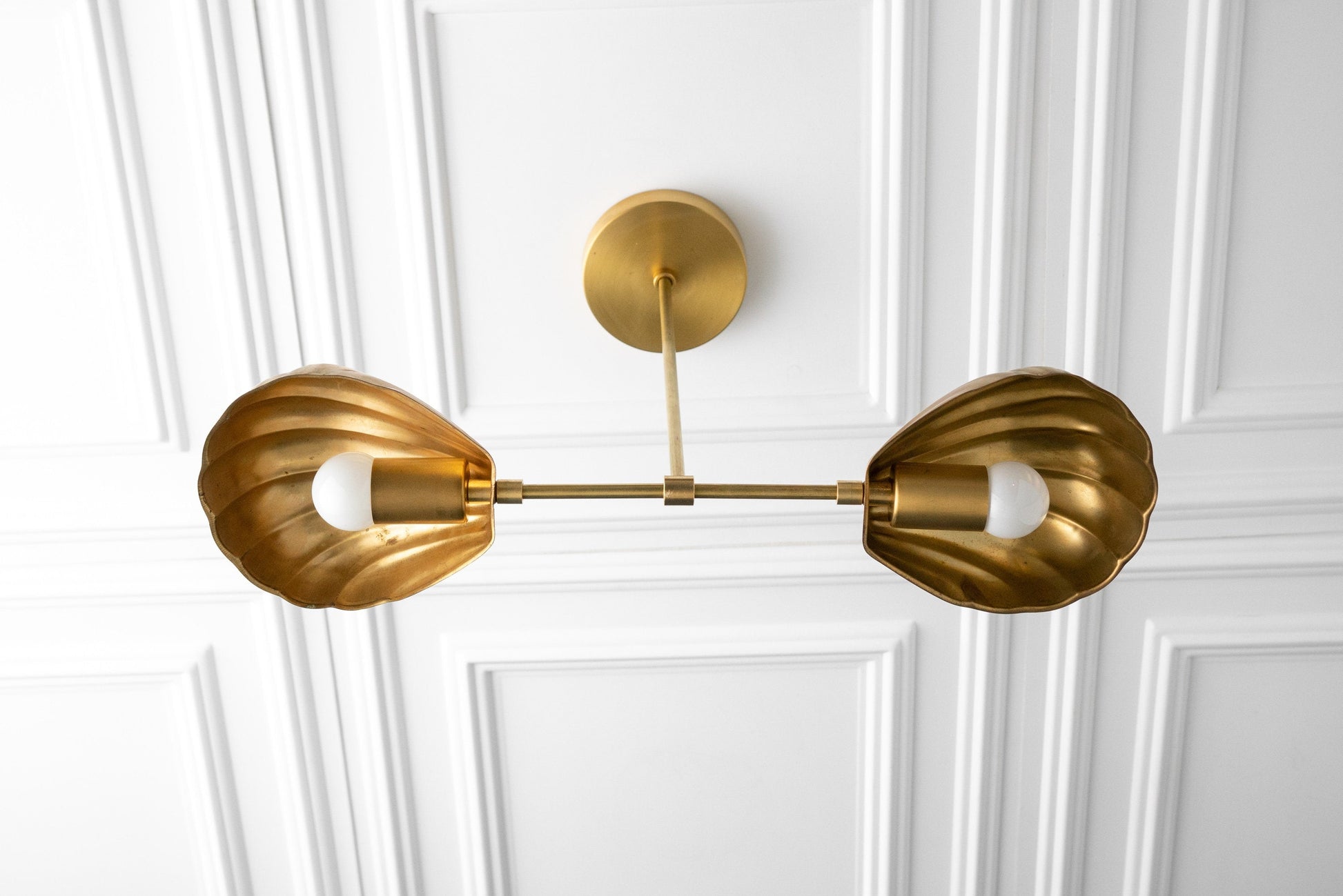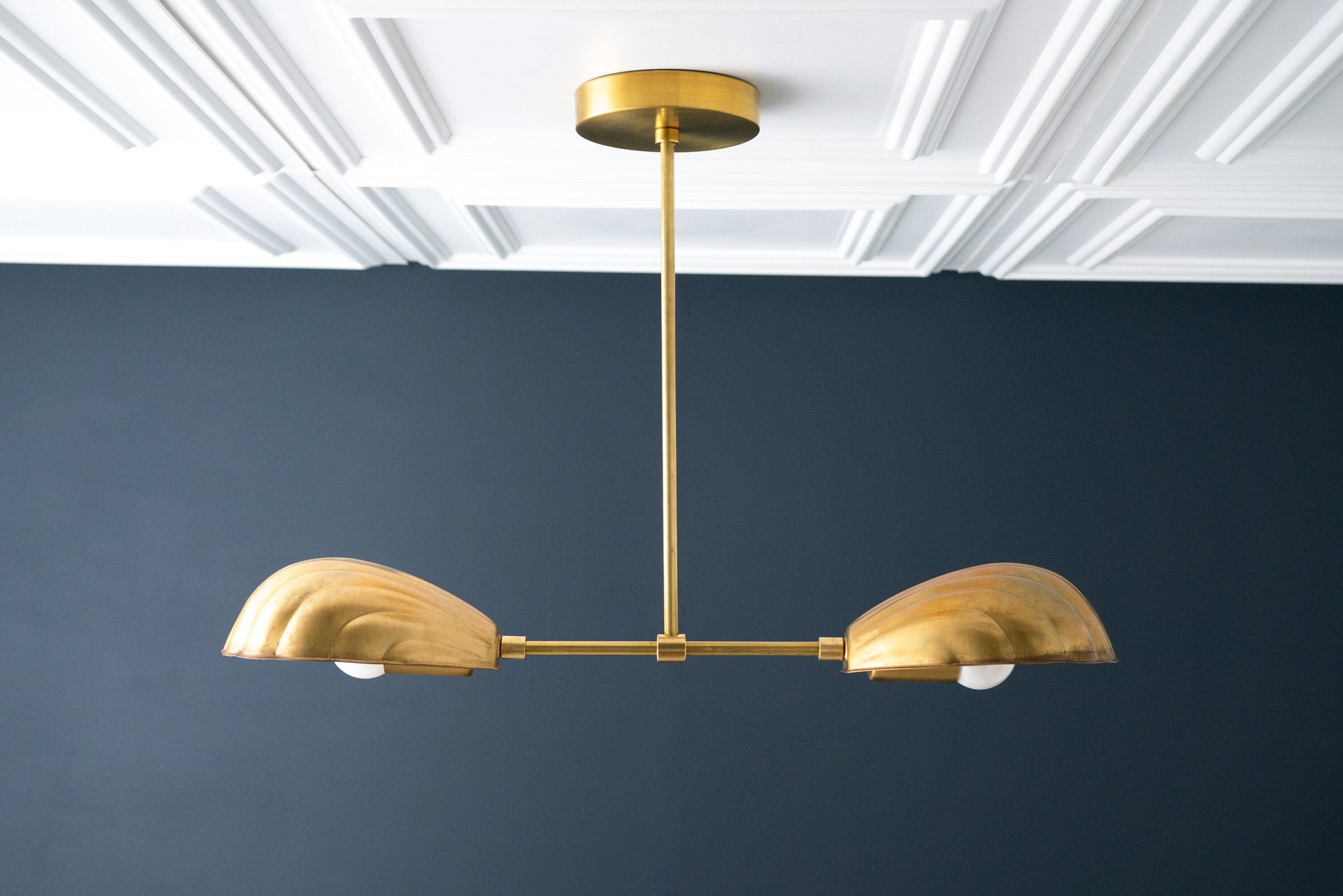 This unique Art Deco two bulb pendent light fixture features traditional stamped brass shell shaped backsplash shades.