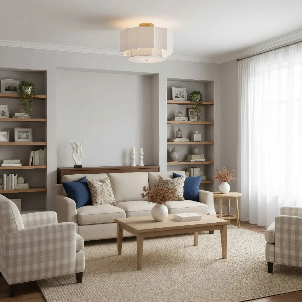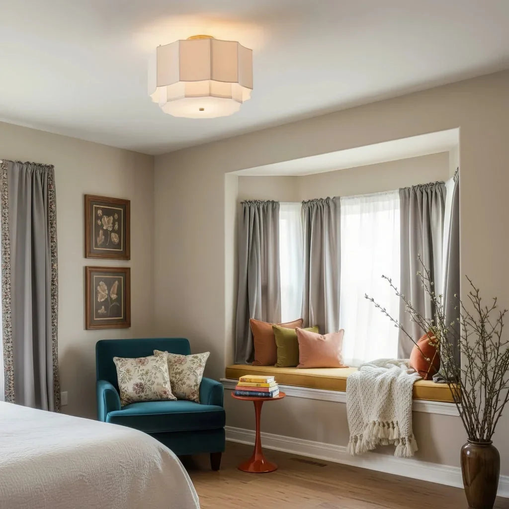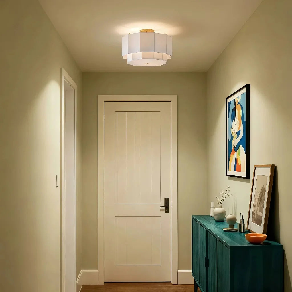 The layered octagonal design diffuses warm, gentle light—perfect for brightrooms.